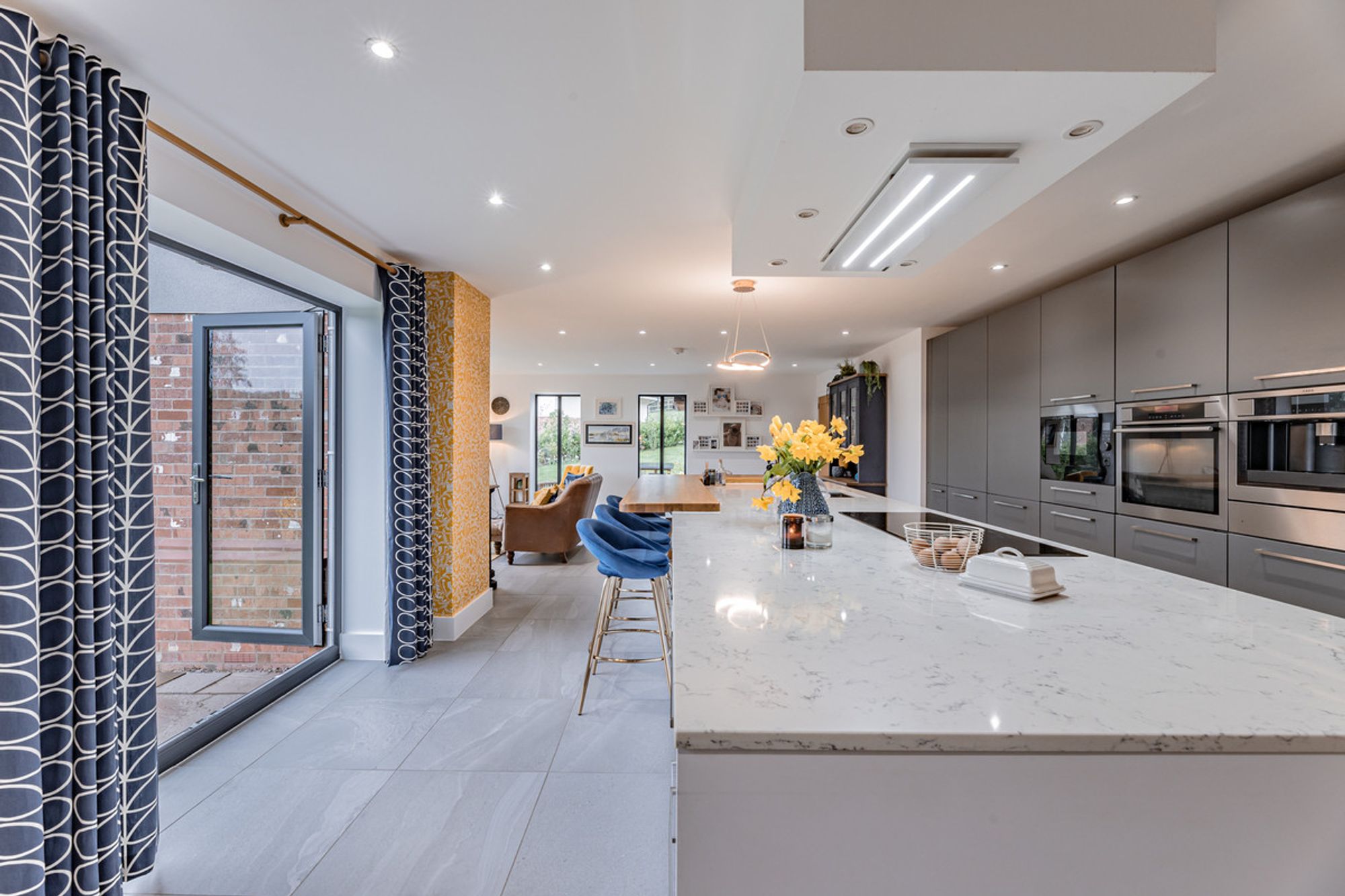 More than just a kitchen, this is where family and friends gather together. Bi-fold doors open onto the garden, with space for a dining table and comfortable seating. The kitchen itself would be the envy of any budding chef. All integrated appliances are AEG, including an integrated full-height fridge and freezer, dishwasher, hob, oven and microwave, and an instant hot water tap and coffee machine for that caffeine hit. Grey units fill one wall with contrasting white units in the central island, all topped by top-quality Silestone worktops.