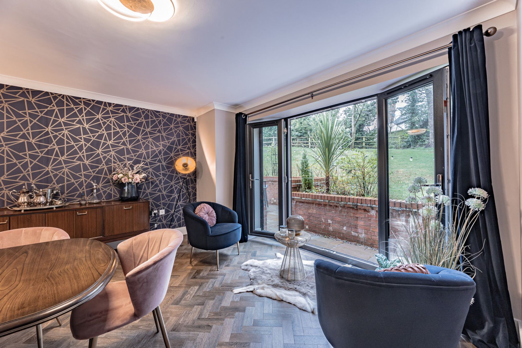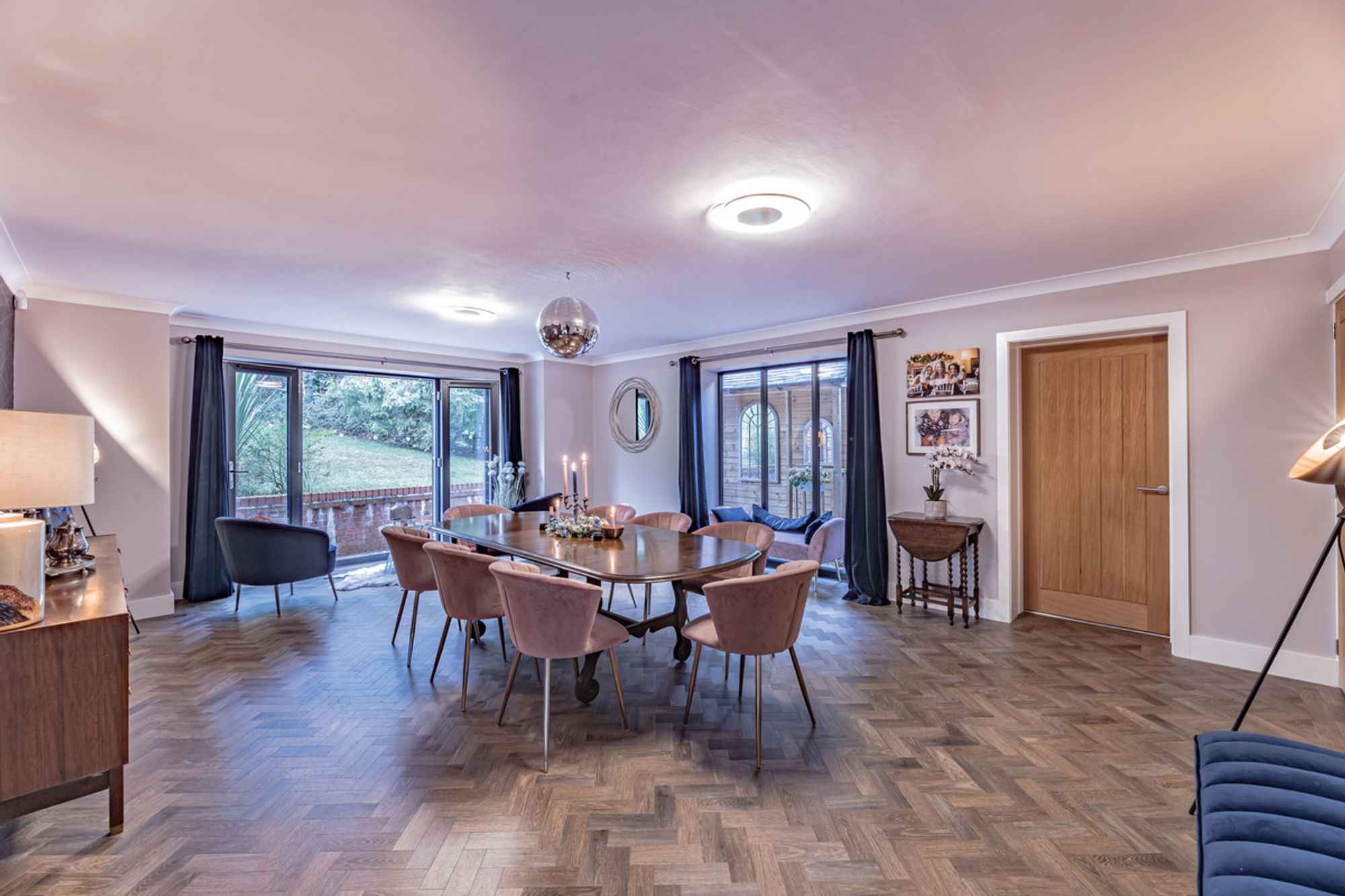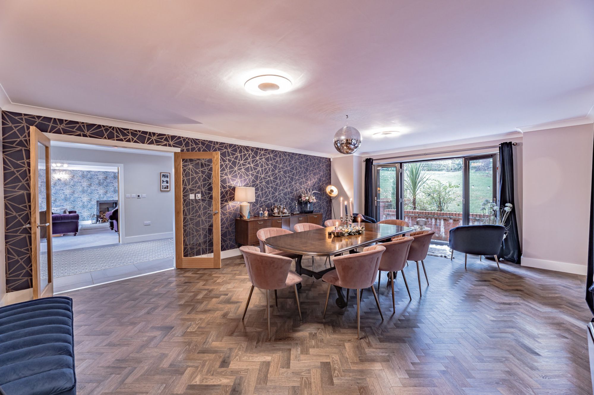 The dining room, with its herringbone Amtico flooring and French doors leading to the landscaped patio area, is perfect for entertaining or a formal dinner.
