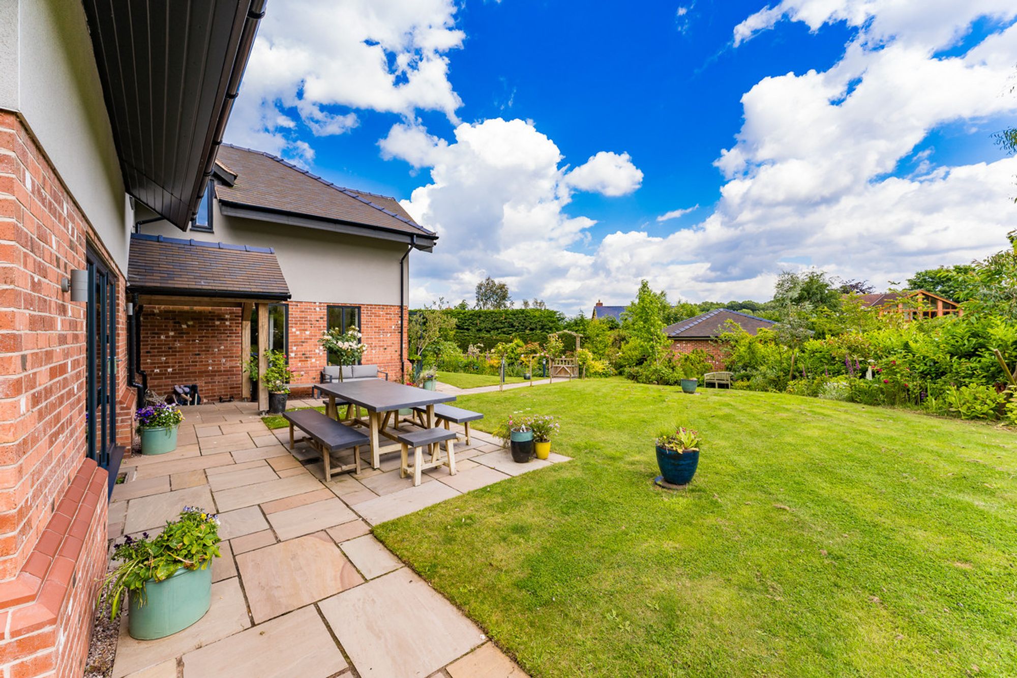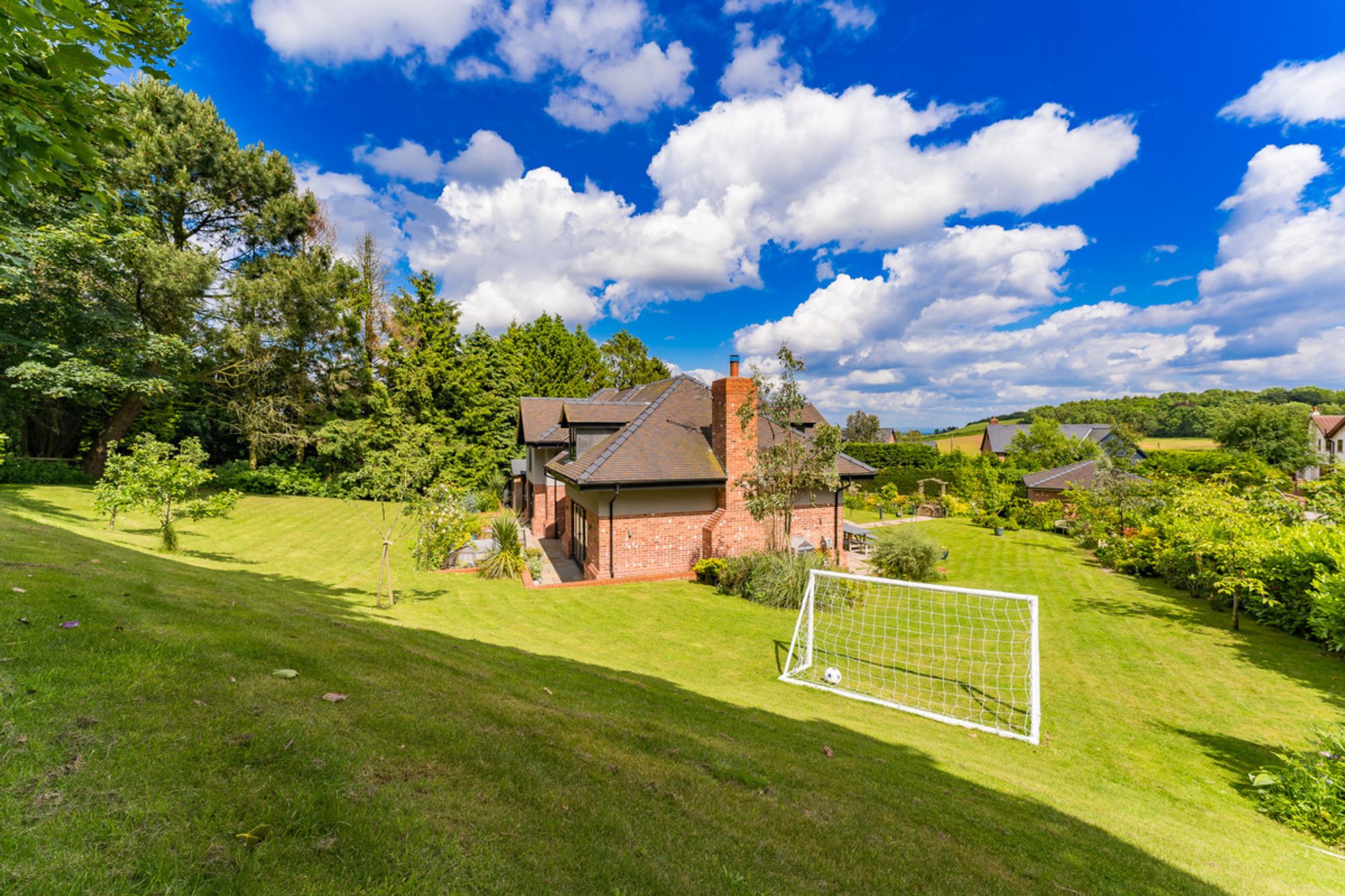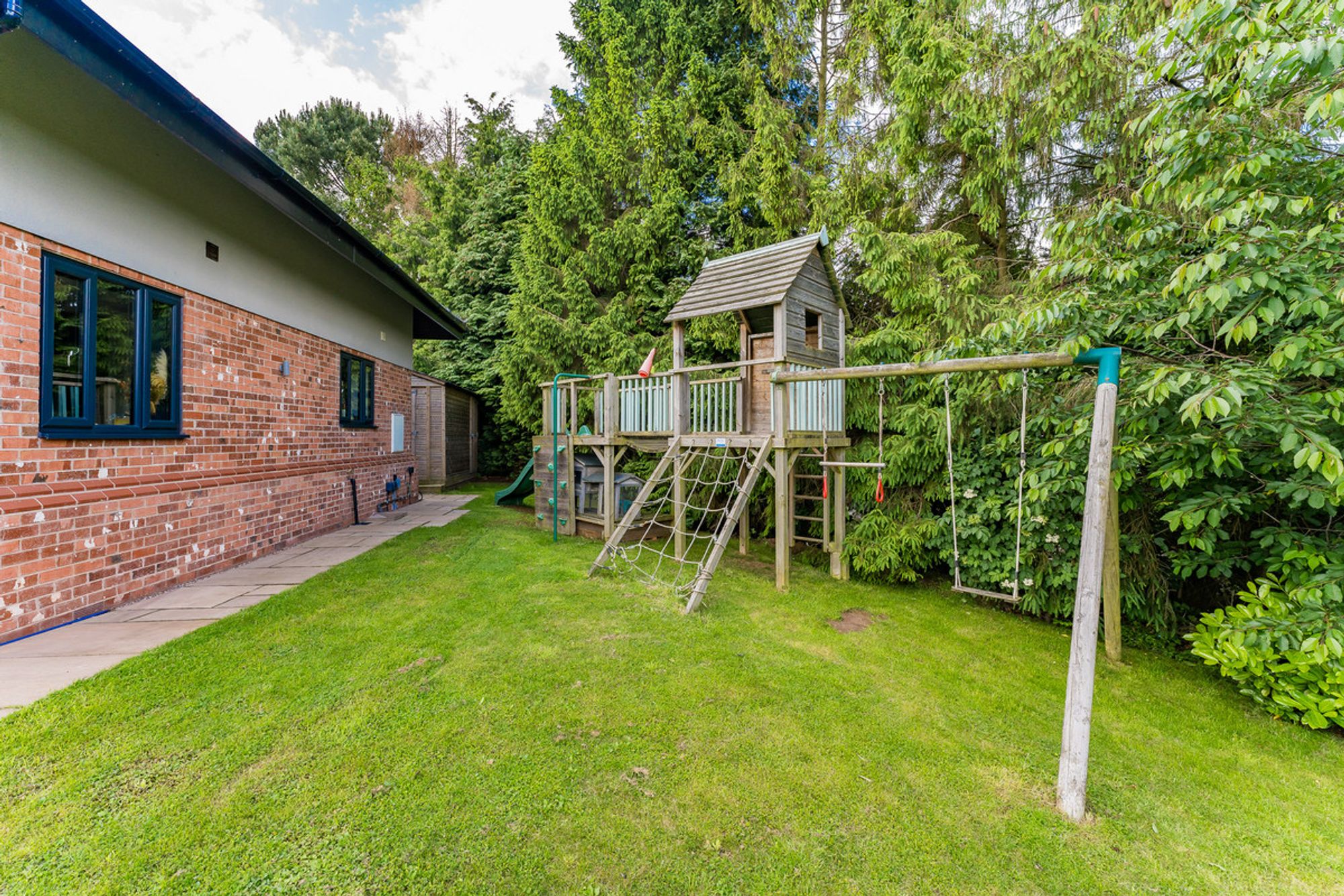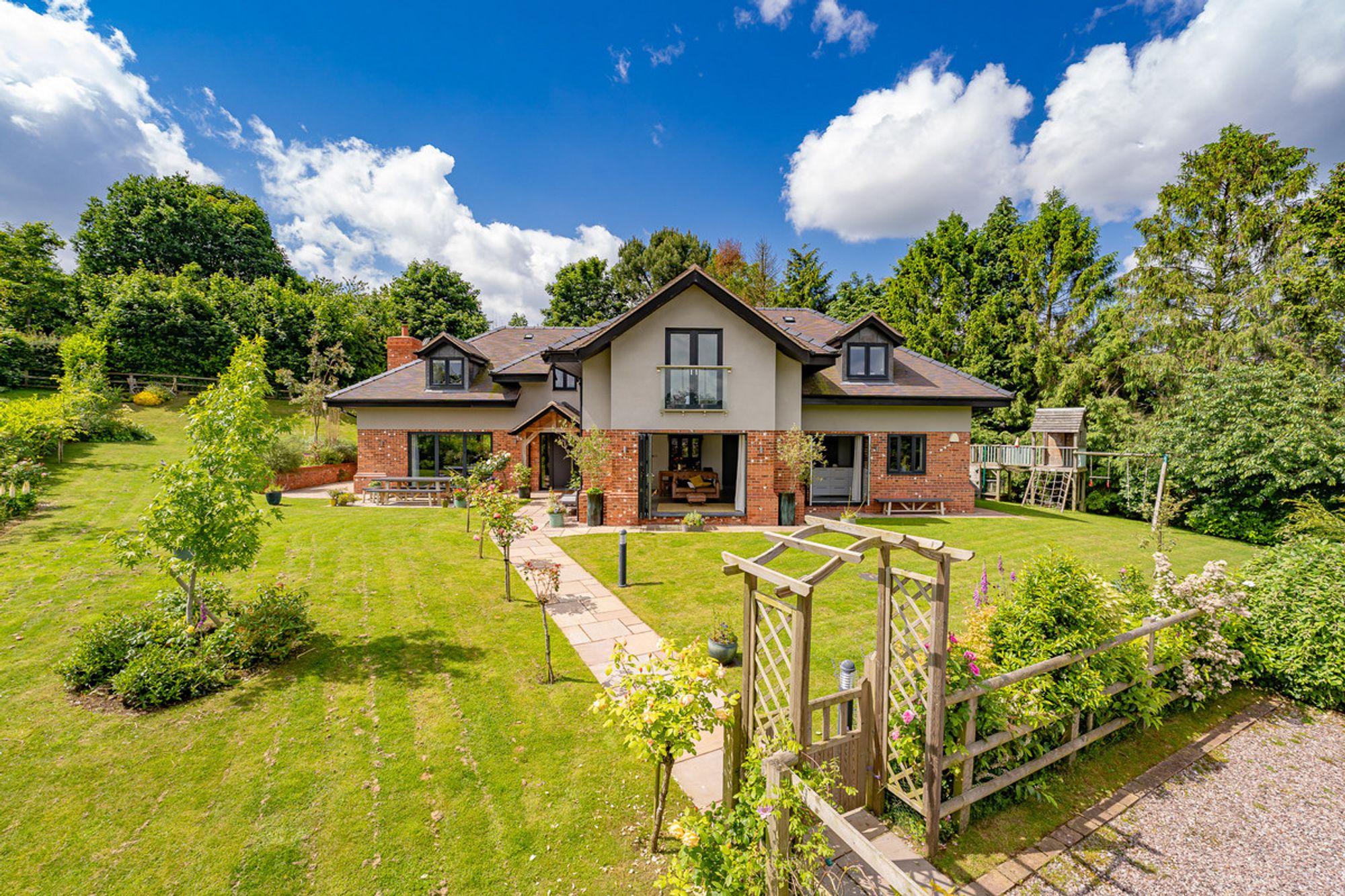 The property sits within the centre of the plot, with lawn for the children to play all around. The climbing frame with swings guarantees hours of fun and plenty of outdoor playtime, as do the opportunities to make dens and play hide and seek. The patio area at the front of the house allows views across the garden. At the rear, the larger patio is an entirely private landscaped haven, perfect for enjoying an al fresco lunch or a crisp G&T in the summer. Lined by rose bushes, the beautiful perfume will flow on the breeze, filling the house when the French doors are left open.