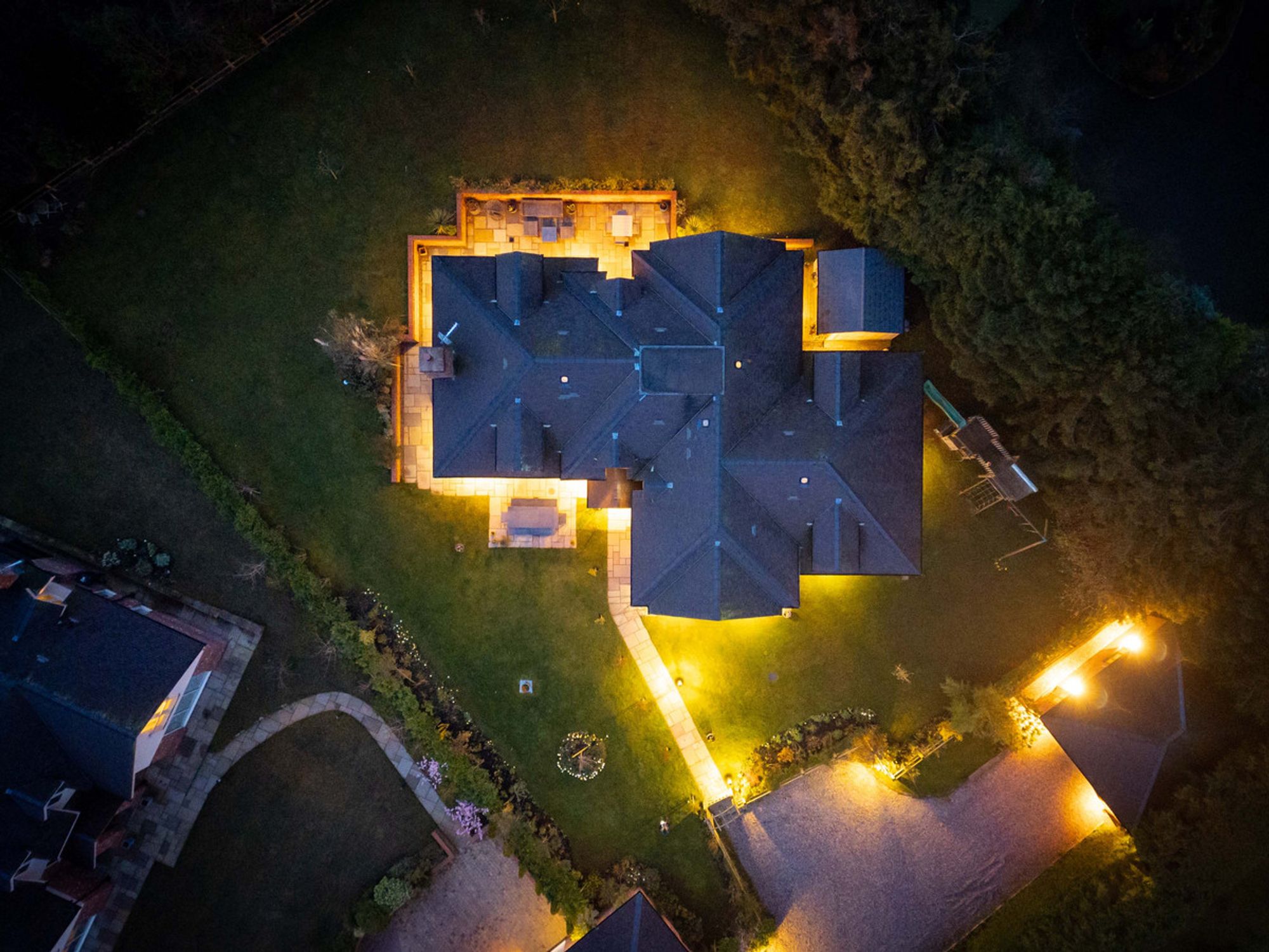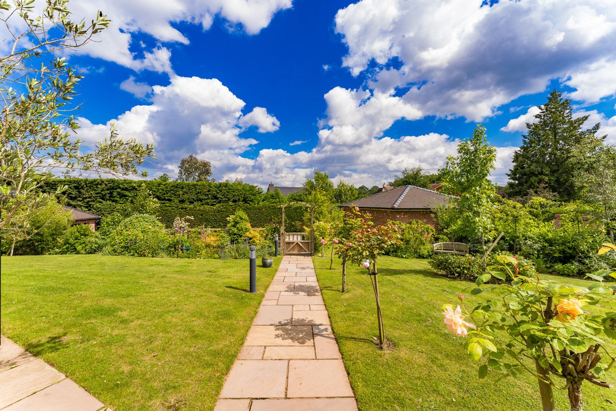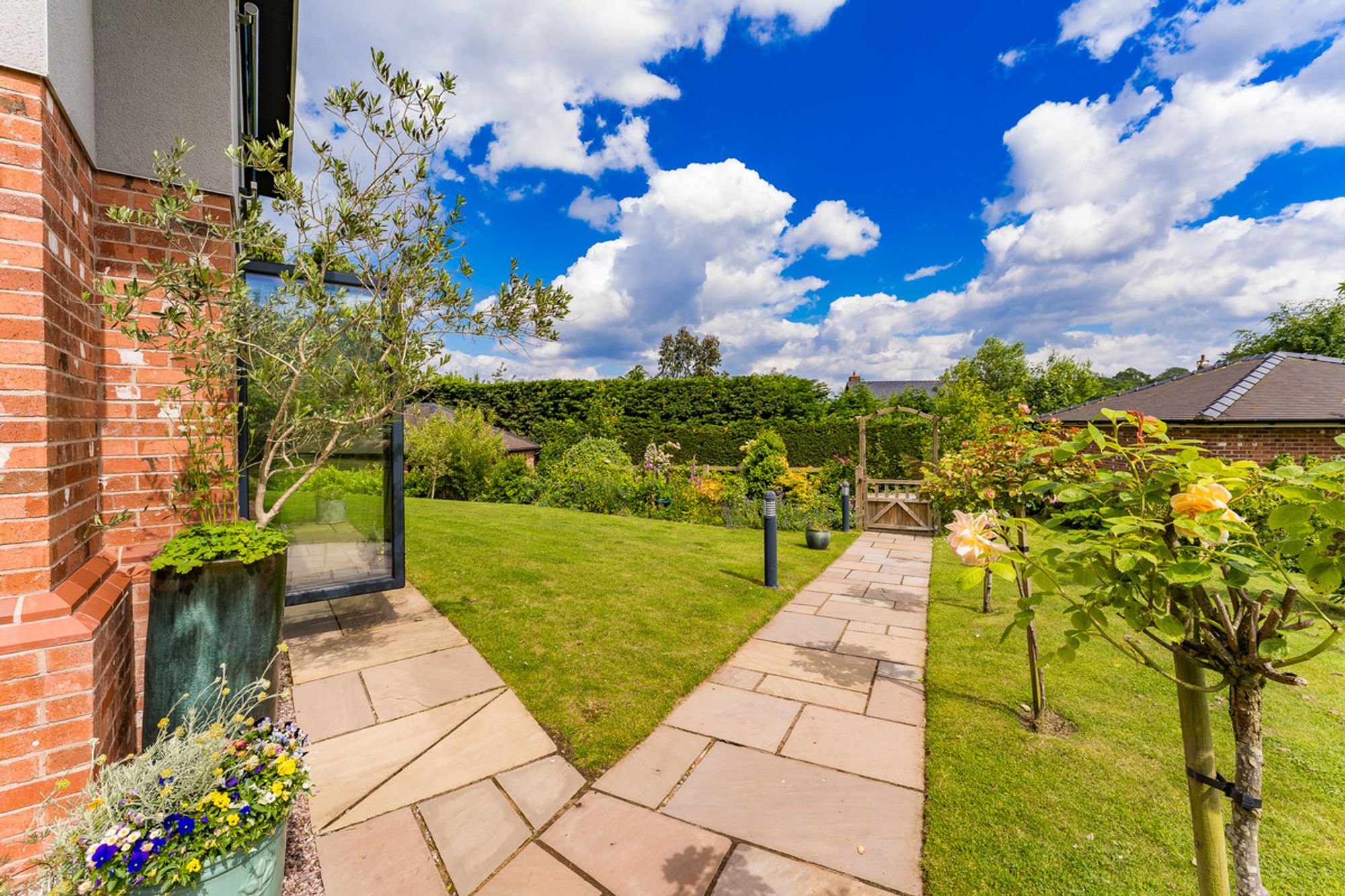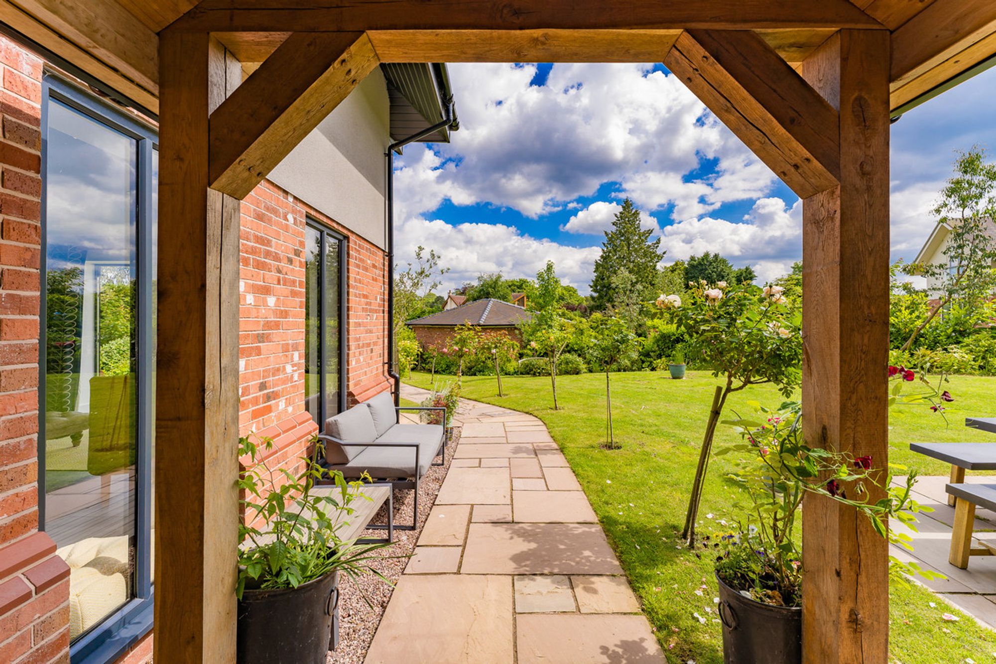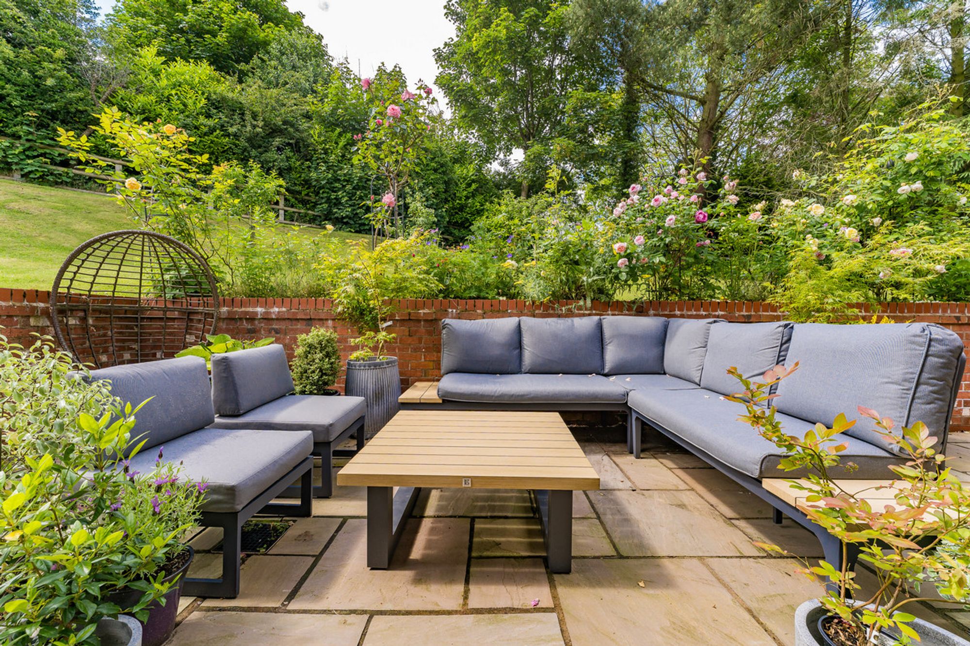 The property sits within the centre of the plot, with lawn for the children to play all around. The climbing frame with swings guarantees hours of fun and plenty of outdoor playtime, as do the opportunities to make dens and play hide and seek. The patio area at the front of the house allows views across the garden. At the rear, the larger patio is an entirely private landscaped haven, perfect for enjoying an al fresco lunch or a crisp G&T in the summer. Lined by rose bushes, the beautiful perfume will flow on the breeze, filling the house when the French doors are left open.