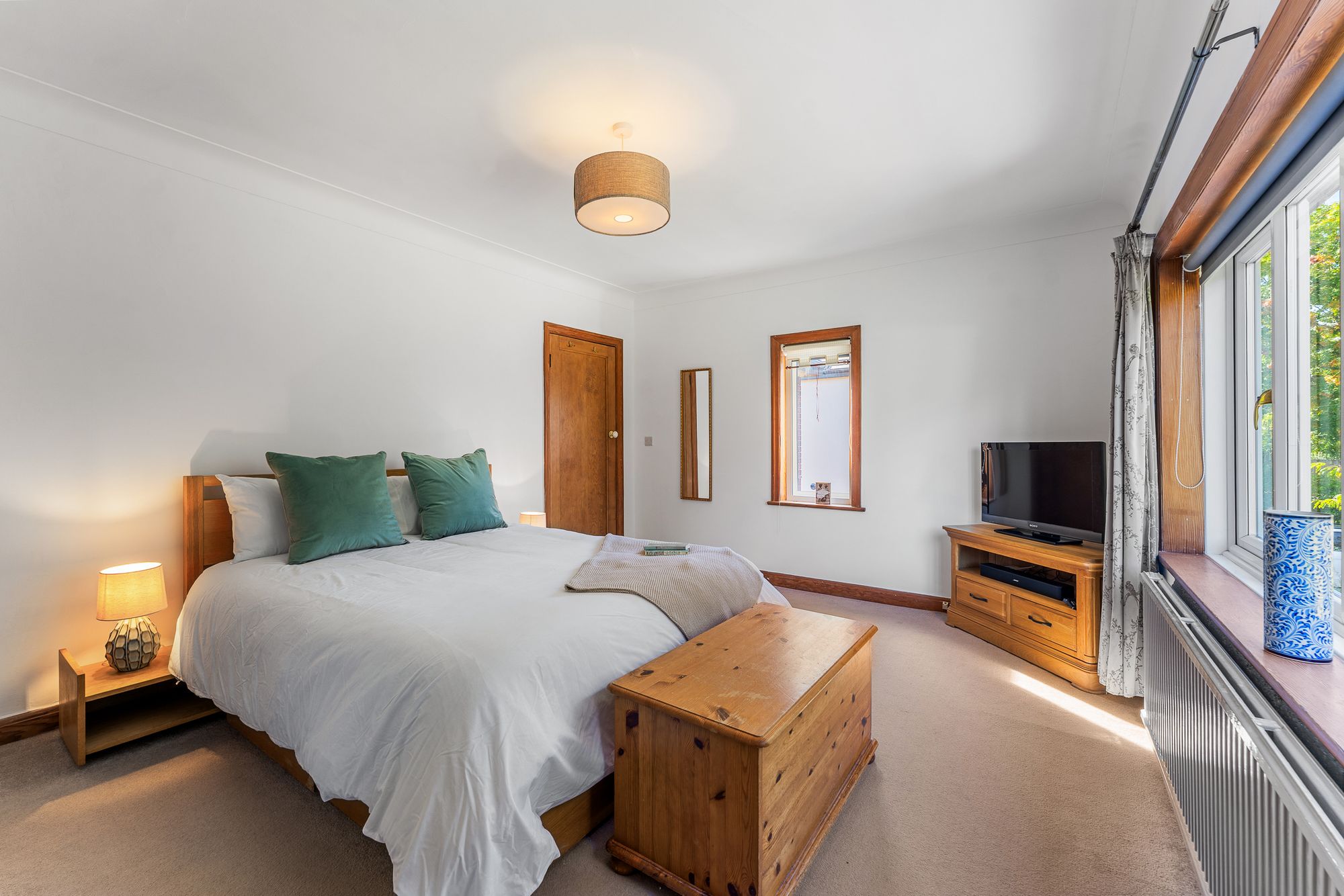 Back in the entrance hall, the panelled staircase with its elegant spindles and bannister leads up to the first-floor landing, where to the right, the guest bedroom is a bountiful space, offering ample room for a double bed, bathed in evening sun from a broad window offering leafy views to the front and another to the side.