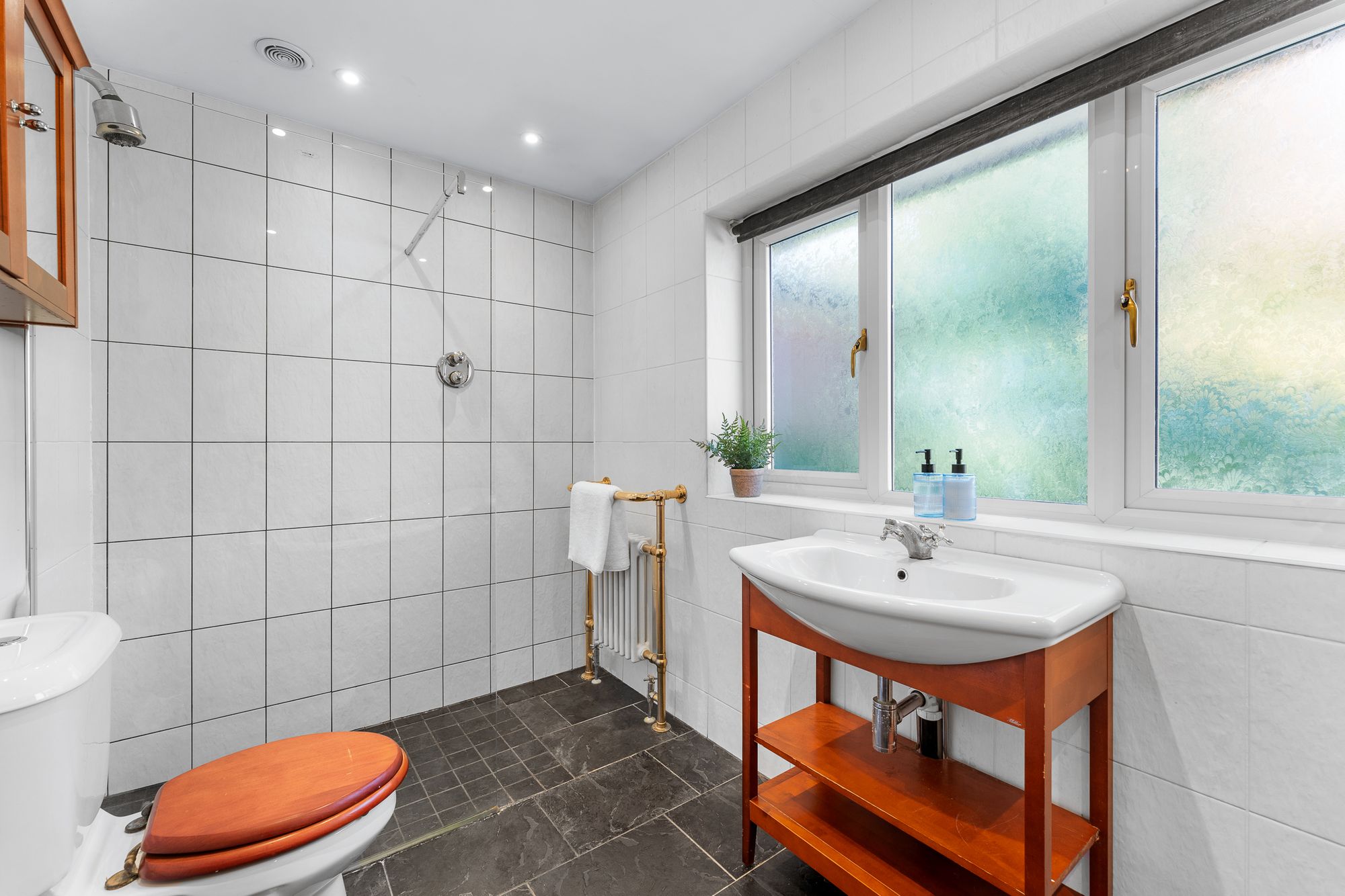 Along the landing, the large family bathroom serves all four bedrooms easily, warmed by electric underfloor heating and furnished with a large, walk-in wet-room rainfall shower, built-in storage, wash basin, WC and towel radiator.