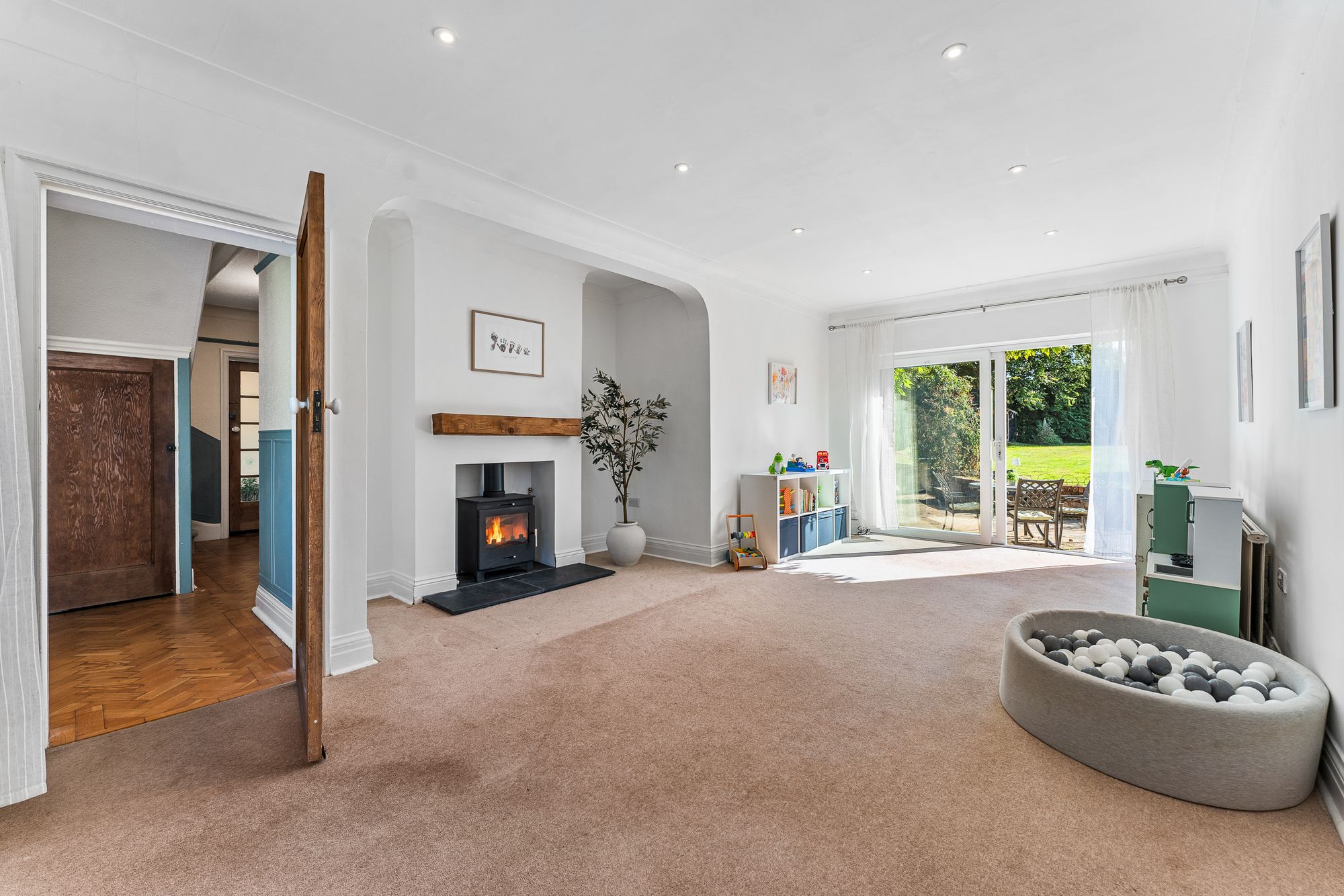 And for play, a bright, carpeted room off the entrance hallway opens directly to the garden via sliding doors. Running the full depth of the home, this large, light-filled room, currently serving as a playroom, is large enough to zone into two areas if needed, with a log burner recessed in an impressive arched alcove for cosy fireside evenings in the wintertime. Bathed in golden light from sunrise at the rear to sunset at the front, in summertime, Beech House’s relaxed flow finds its smoothest current; doors open wide for parties and playdates.