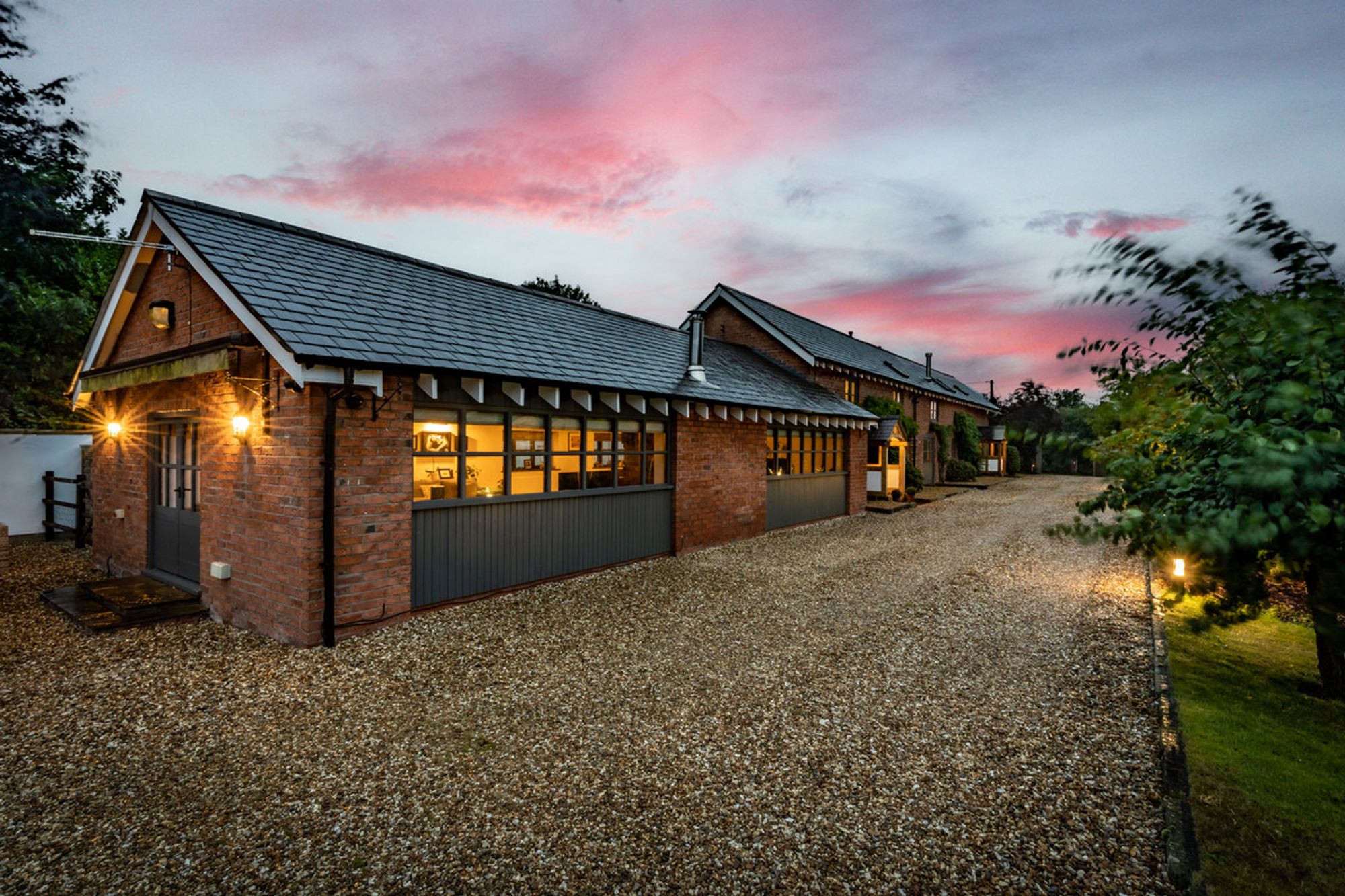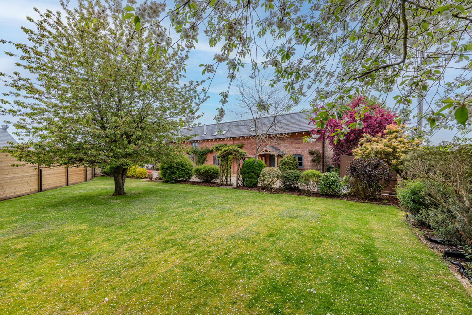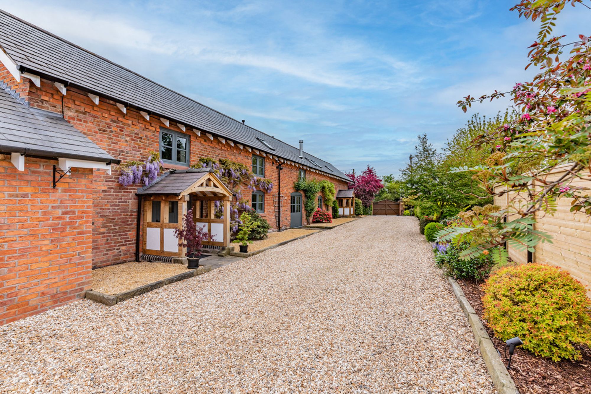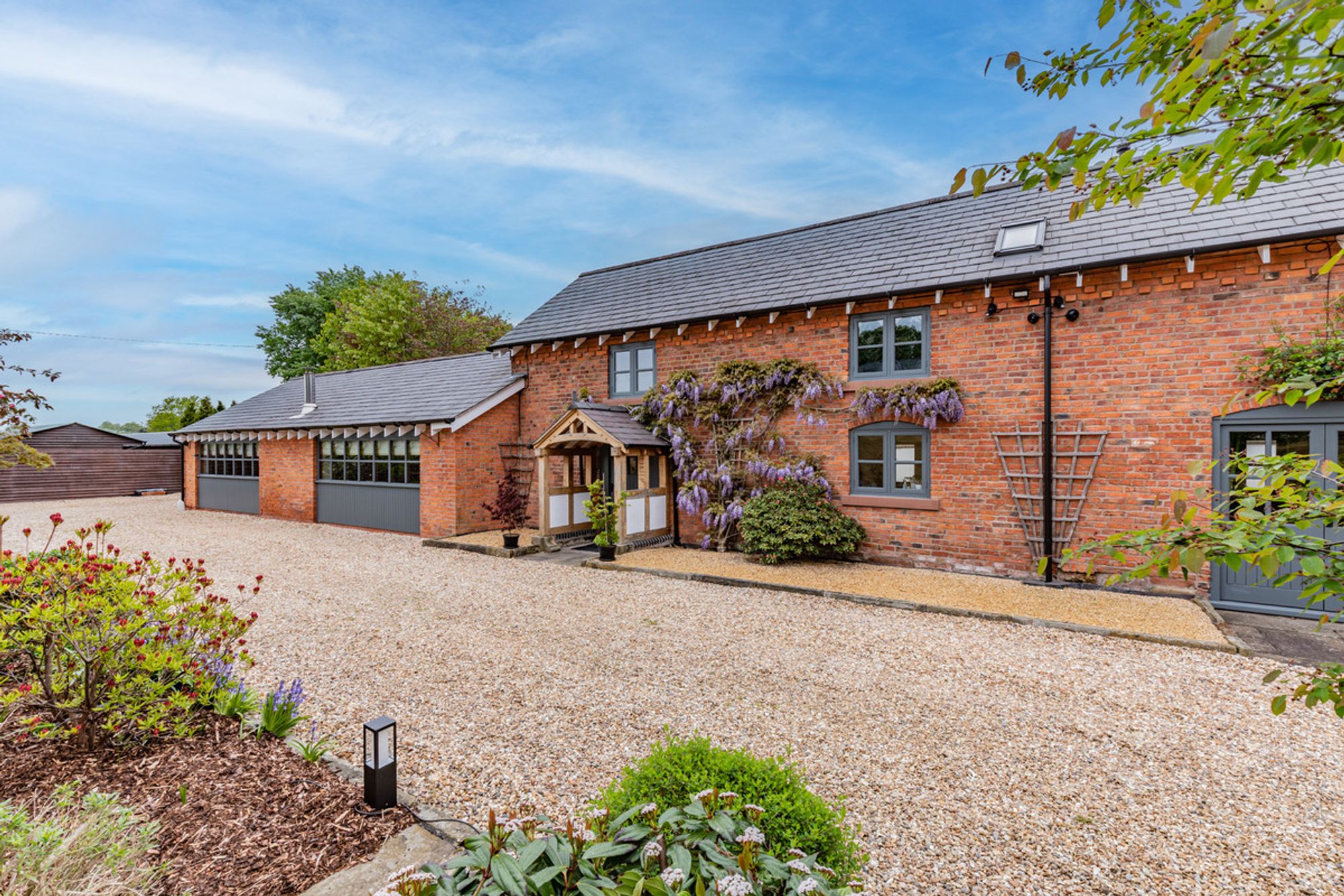 A prolific pink climbing rose frames the centre of the Cheshire redbrick barn-conversion, neatly bookended by a flourish of heavily scented purple wisteria to either side, striking a scene of quintessential rural England from spring through to late summer.