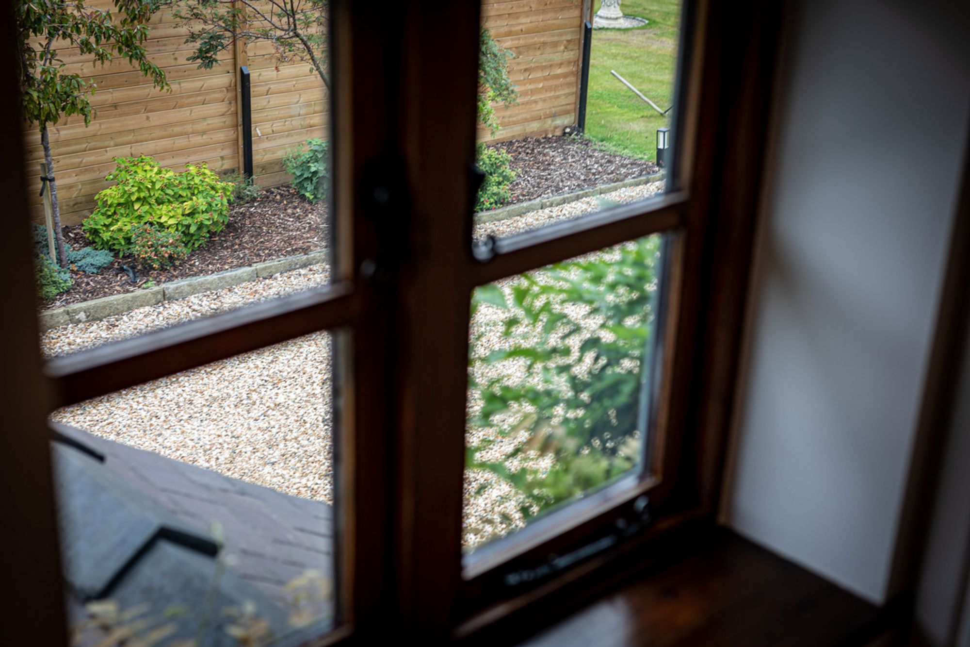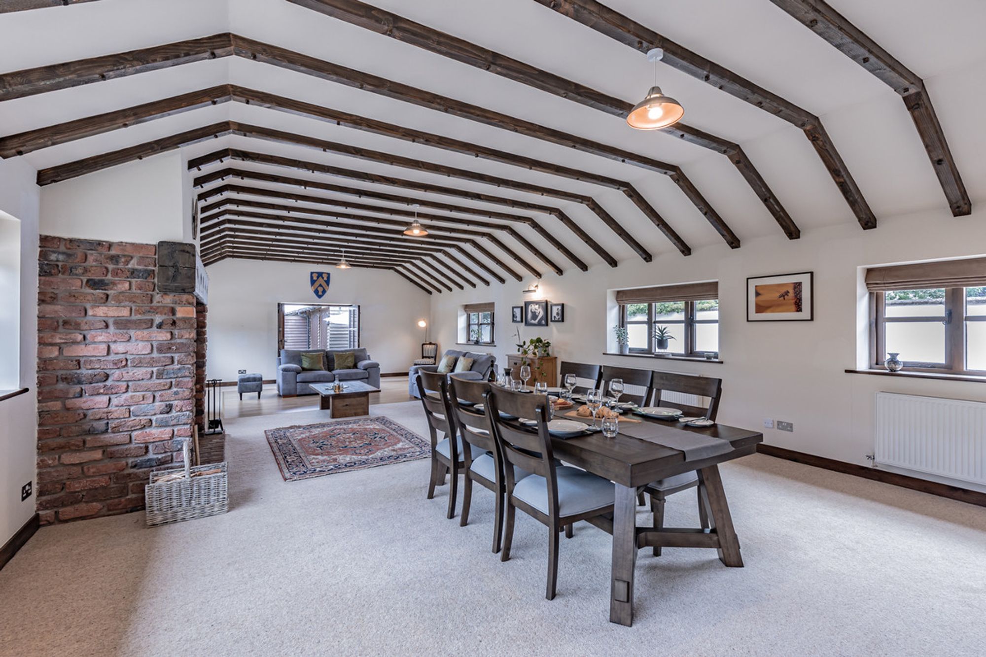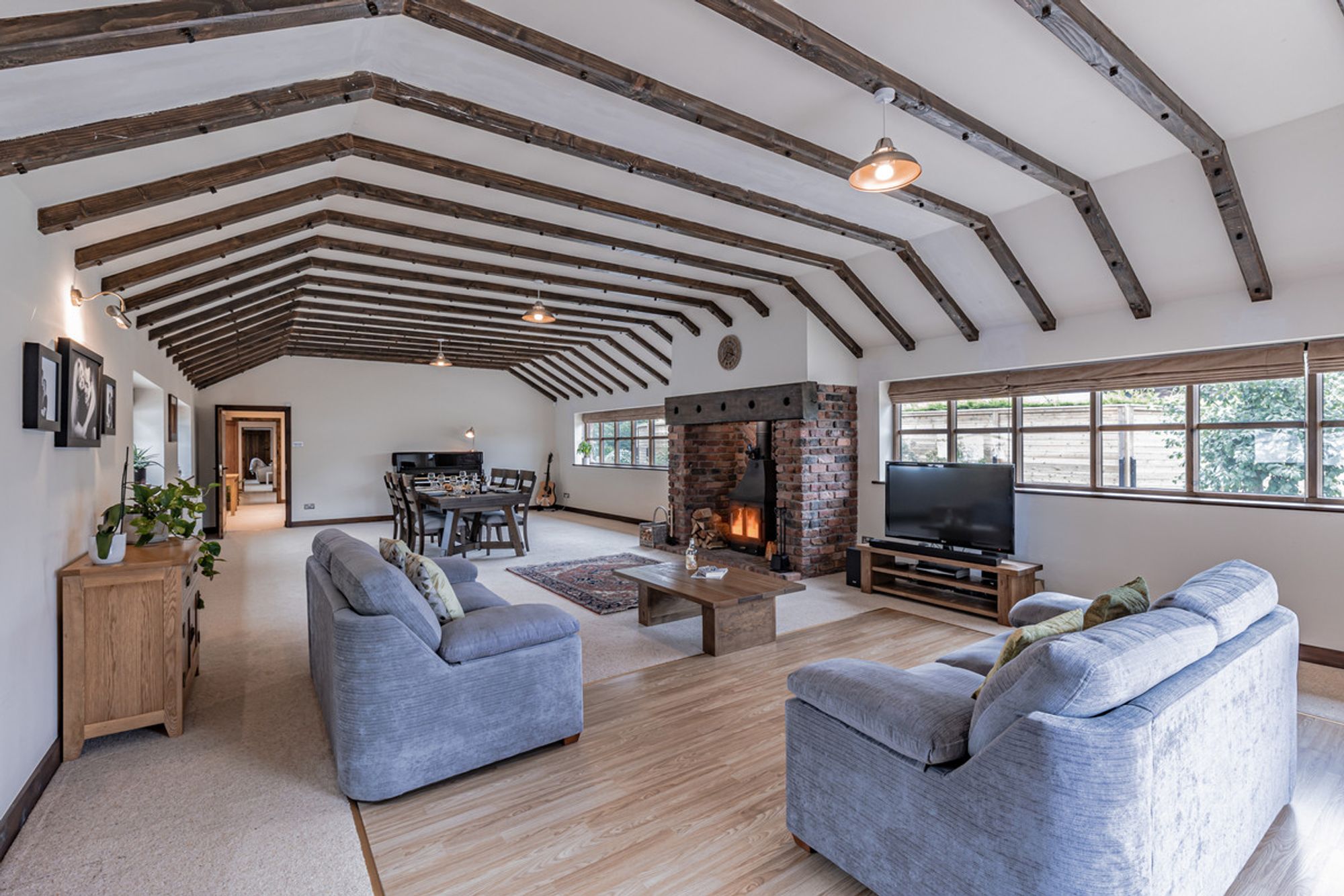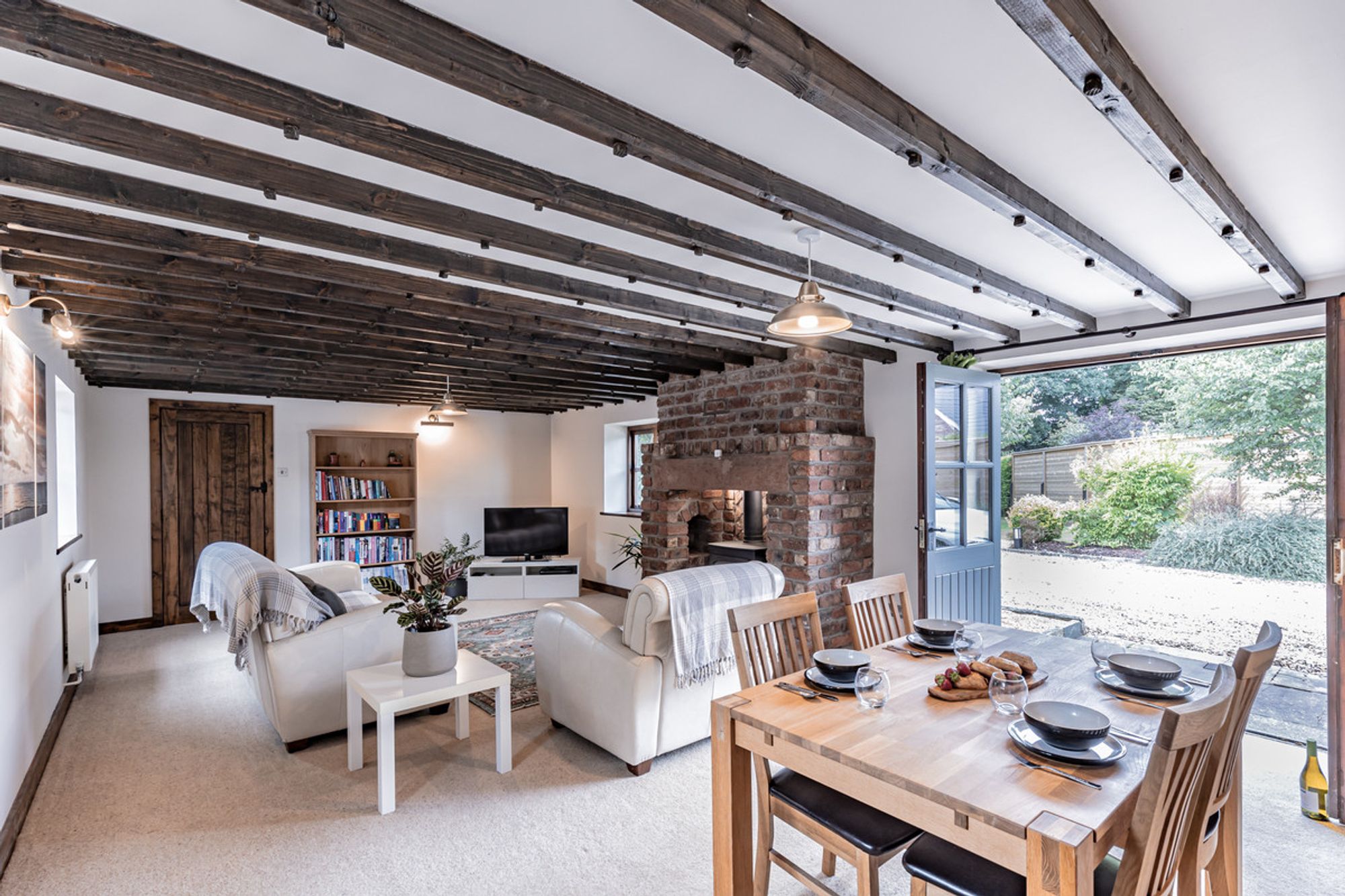 Directly ahead, light enters through a timber framed window. A feature throughout Cassia Green Farm Barn, they are painted a contemporary grey from the outside.