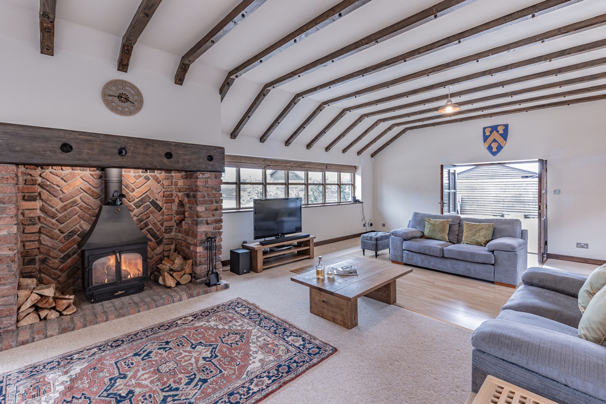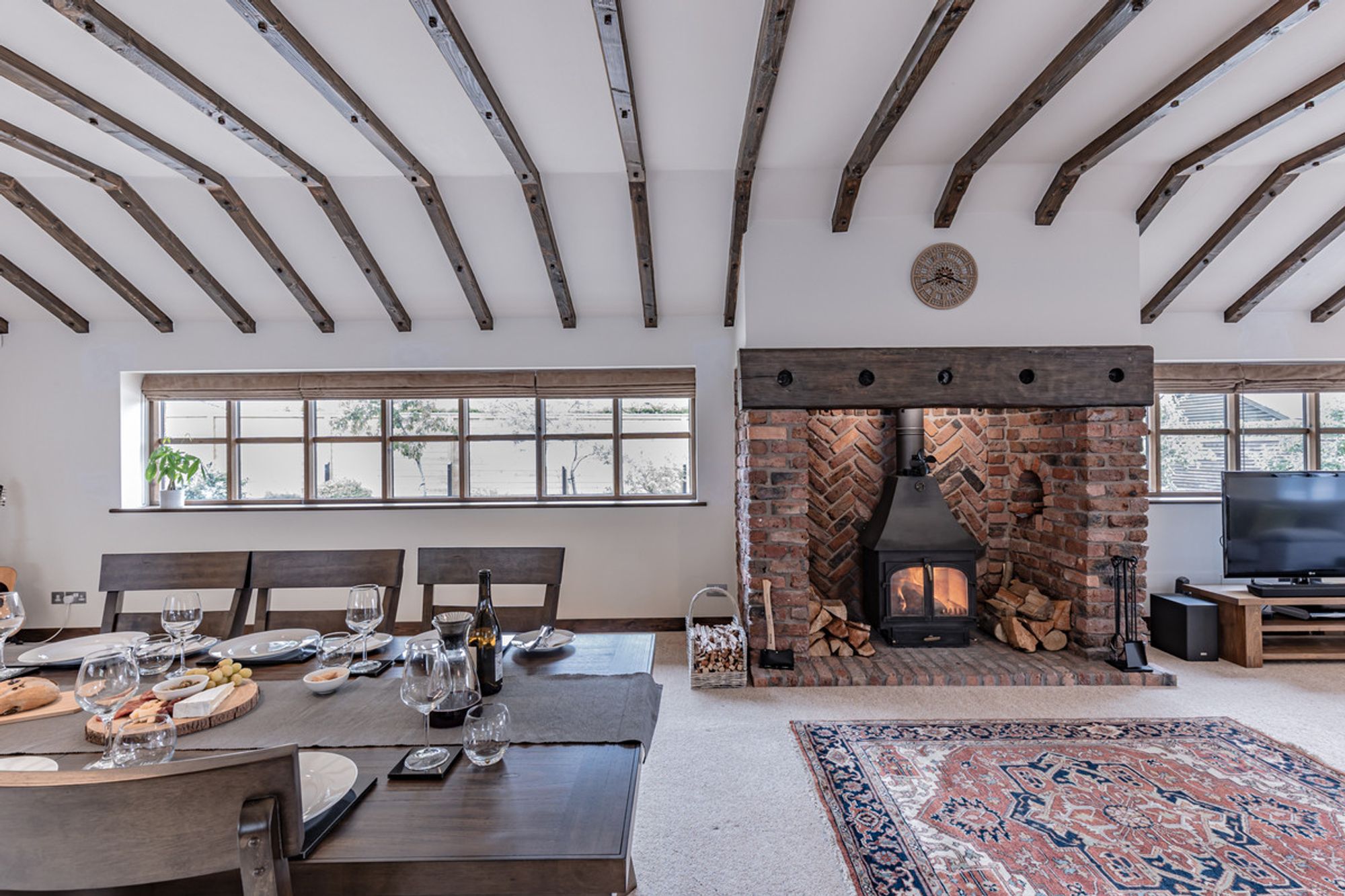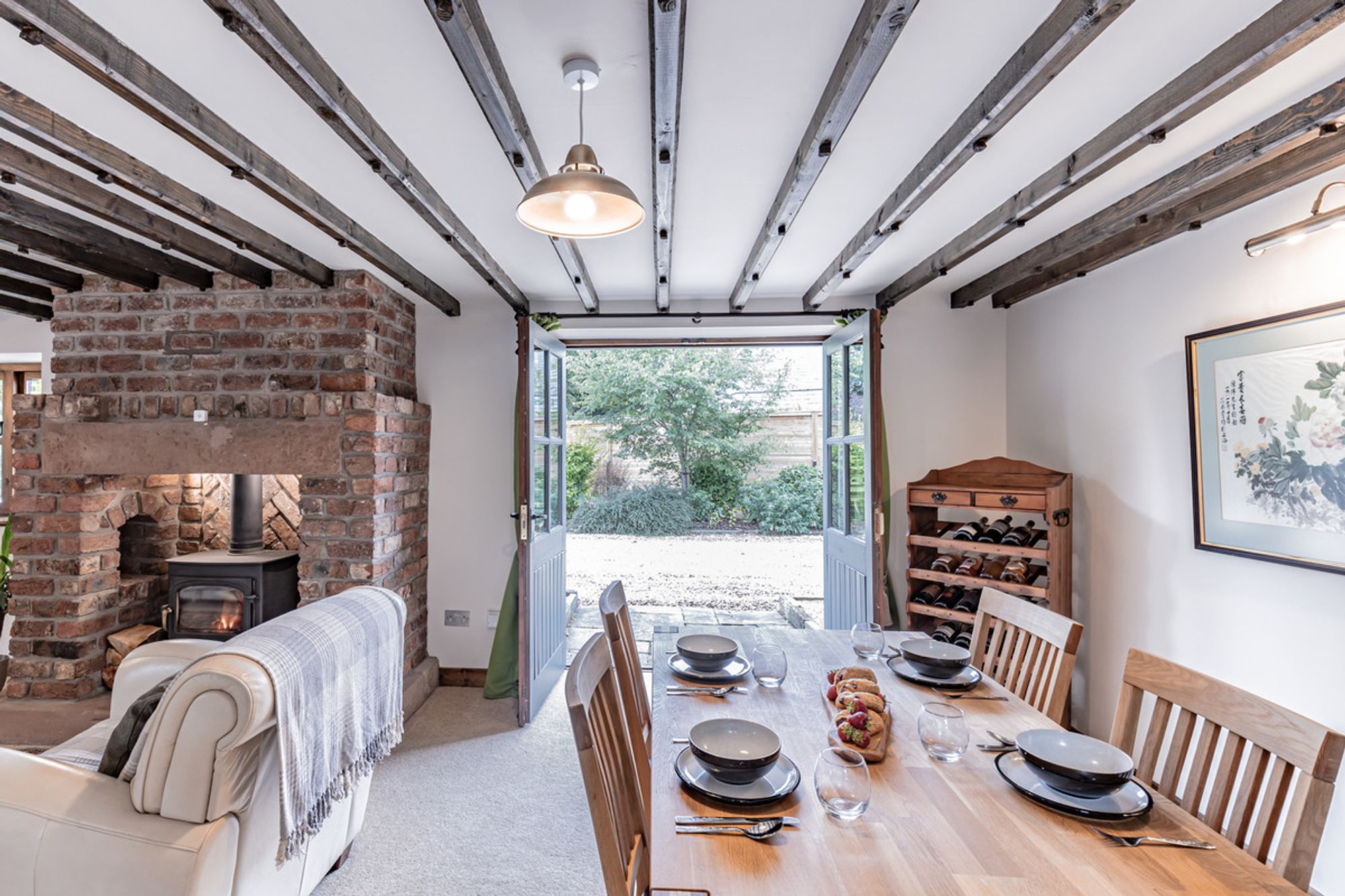 An impressive 42 feet in length, this inspiring space can easily combine two rooms in one, serving as both dining room and living room, with a large ten-seater table and space for several sofas. A cheery welcome emanates from the log-burning stove, nestled within its redbrick inglenook. Homely and sociable, gather around the glowing embers after a convivial meal and catch up with loved ones. Double doors at the far end open out to the garden, where an electric awning provides shelter and shade when enjoying summer dining alfresco.