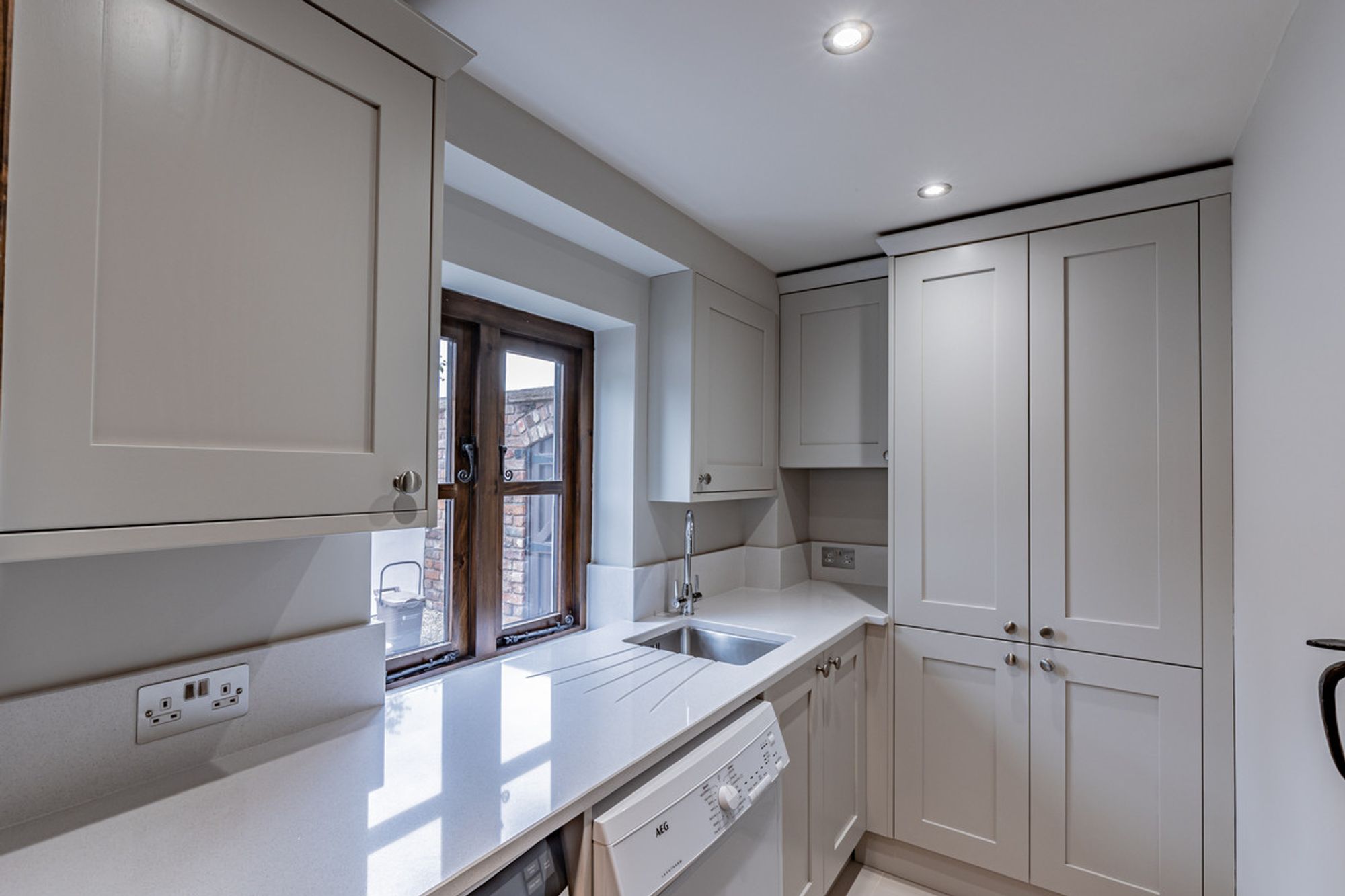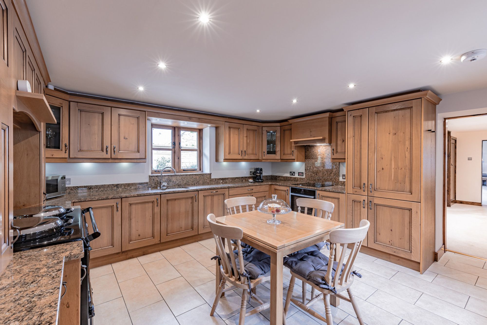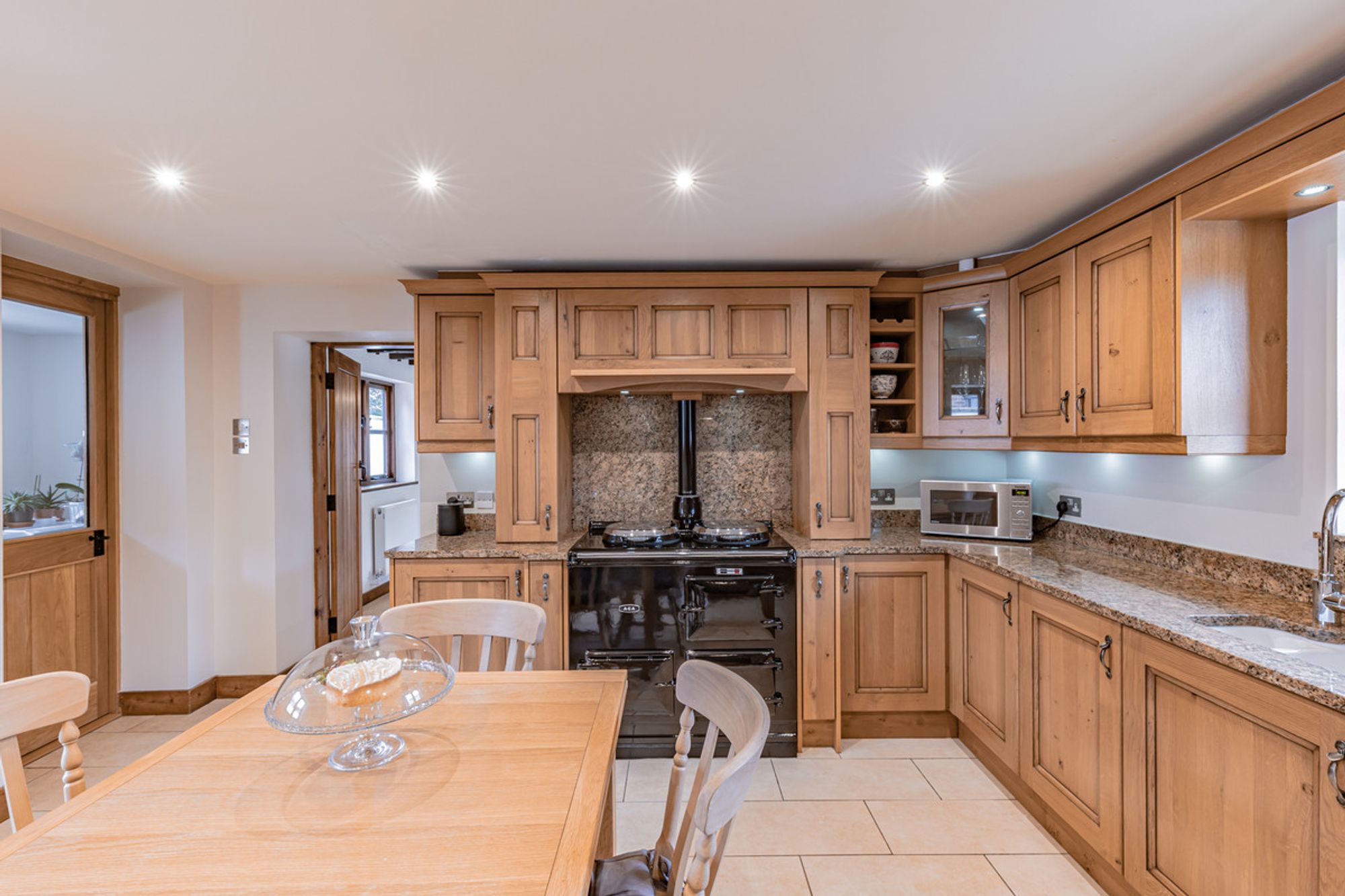 Returning to the entrance hall, this time, turn right from the front door to arrive at the kitchen. In harmony with the rustic origins of the barn, wood-fronted cabinetry creates a farmhouse kitchen feel, borne out by the warmth of the gas-fired Aga. An electric oven and hob are handy for the summer months. Tiled underfoot, granite worktops reflect the spotlighting above. Newly fitted built in appliances include a fridge-freezer and dishwasher, with undermounted sink and tap.