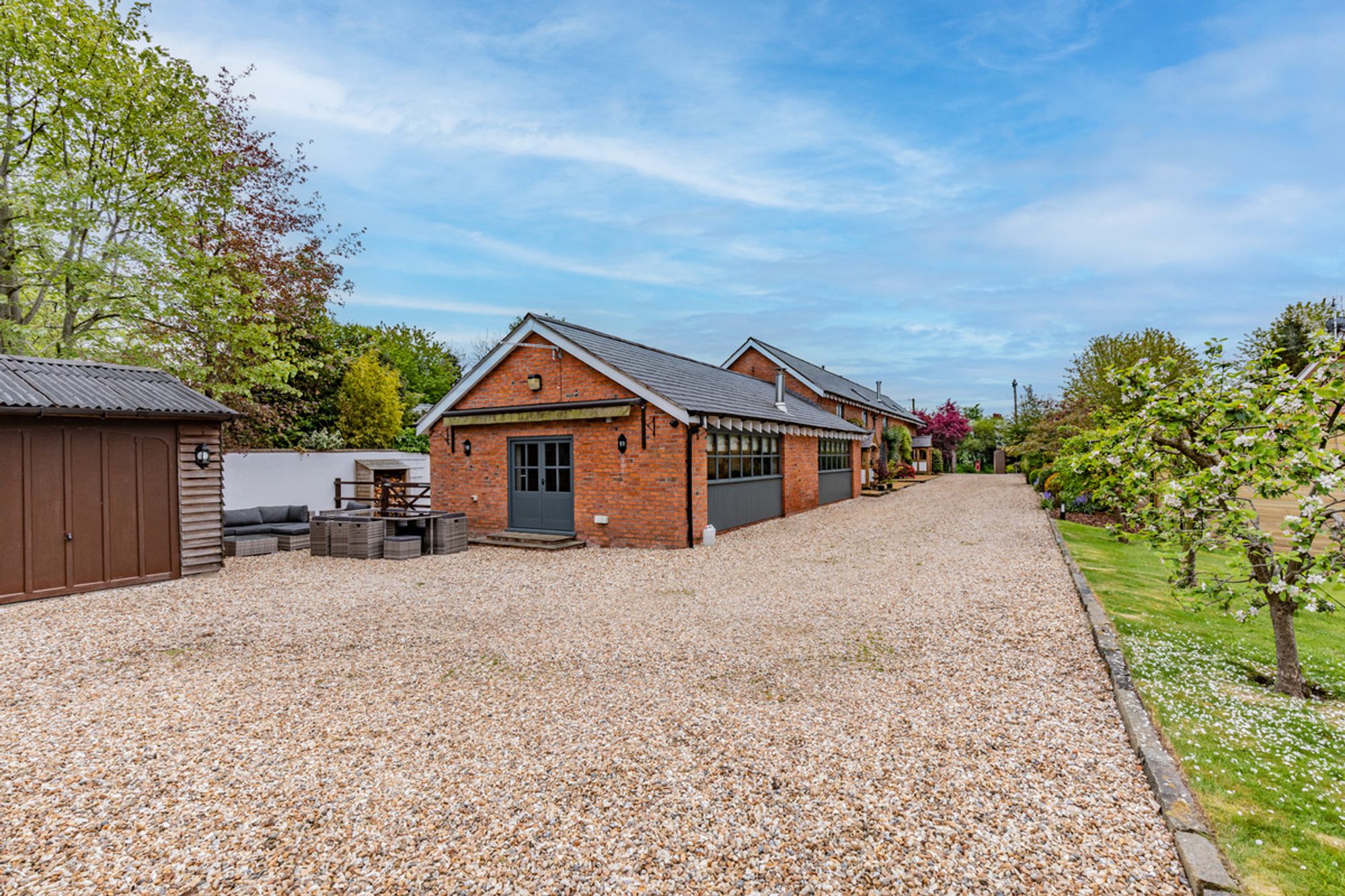 Securely set back behind an electric gated driveway, Cassia Green Farm Barn is a hidden gem, unseen from the road. Parking is plentiful on the gravel driveway, alongside a separate double timber-framed garage, converted from an old stable block and superb for storage.