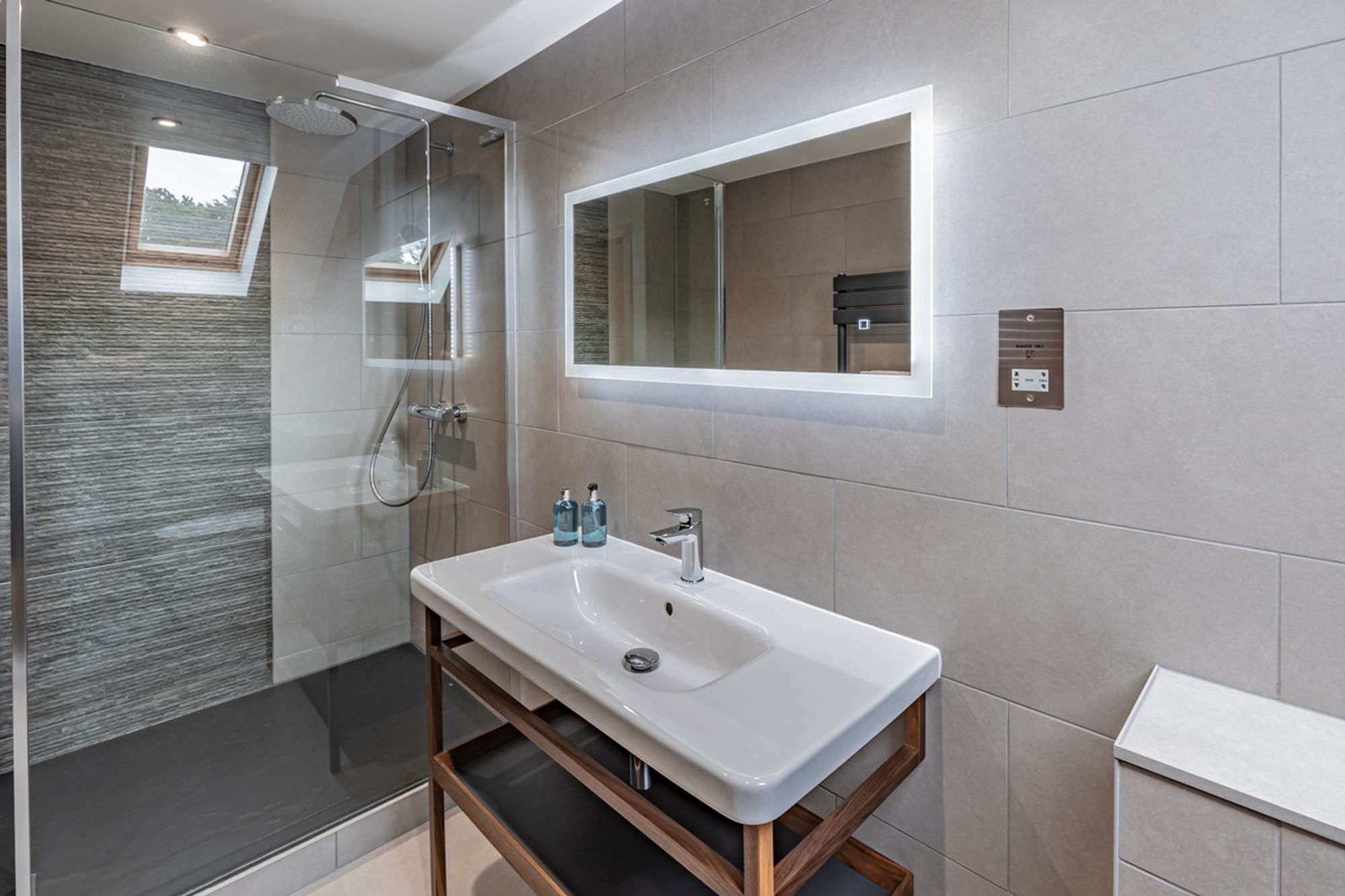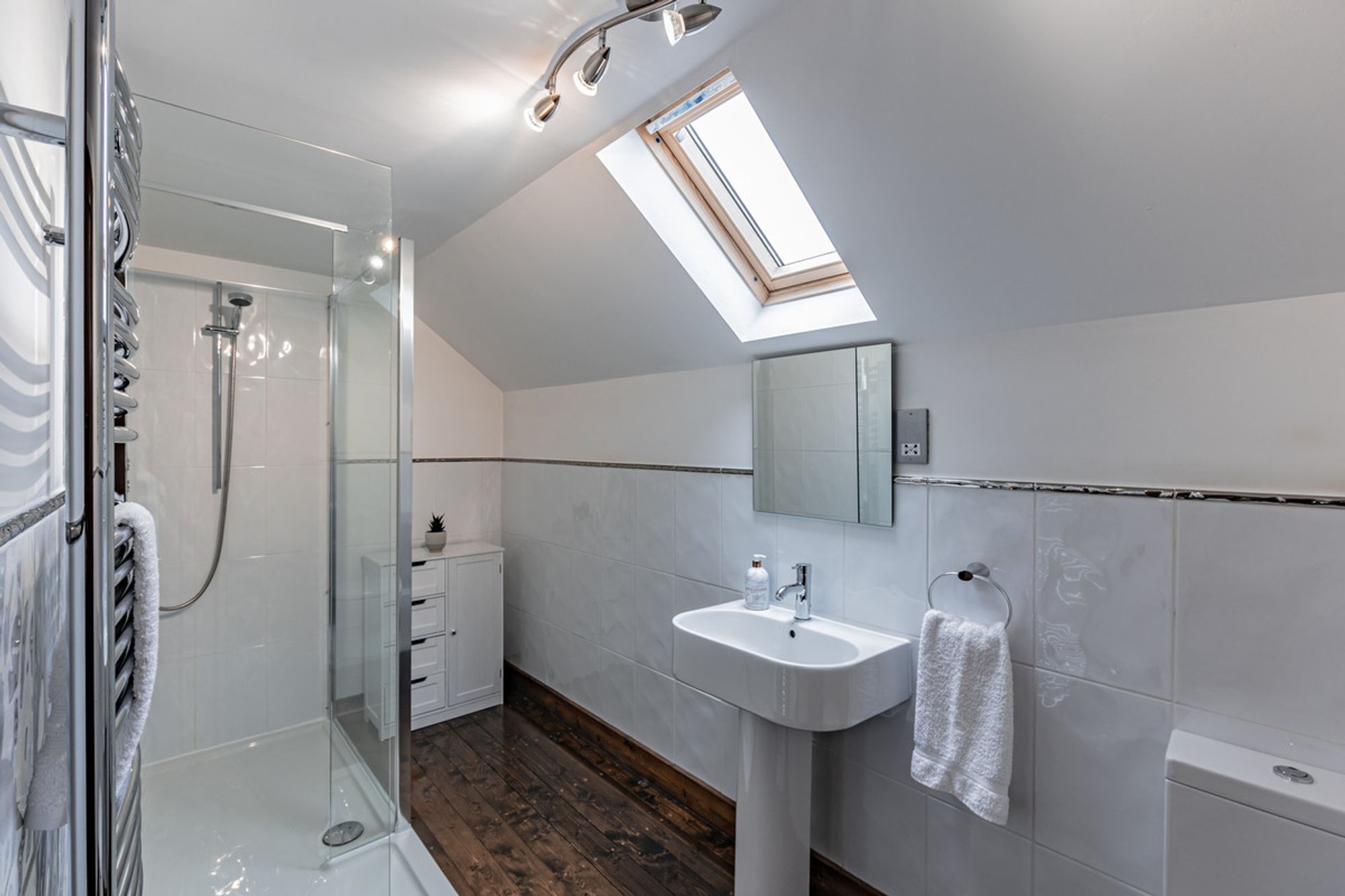 Along the landing and on the left, refreshment awaits in the shower room, where a large, glass enclosed walk-in shower stands alongside a heated towel rail, wash basin and WC. Light streams down onto the wooden flooring through and overhead Velux.