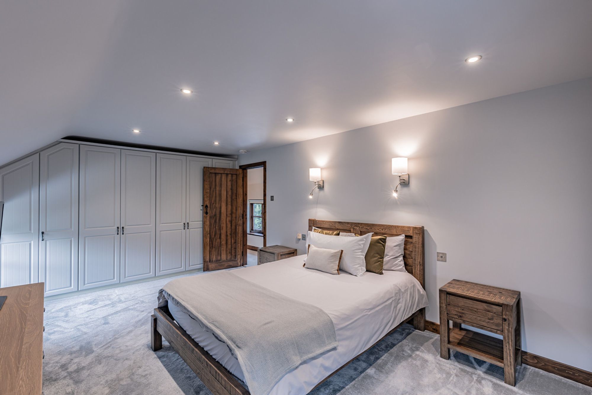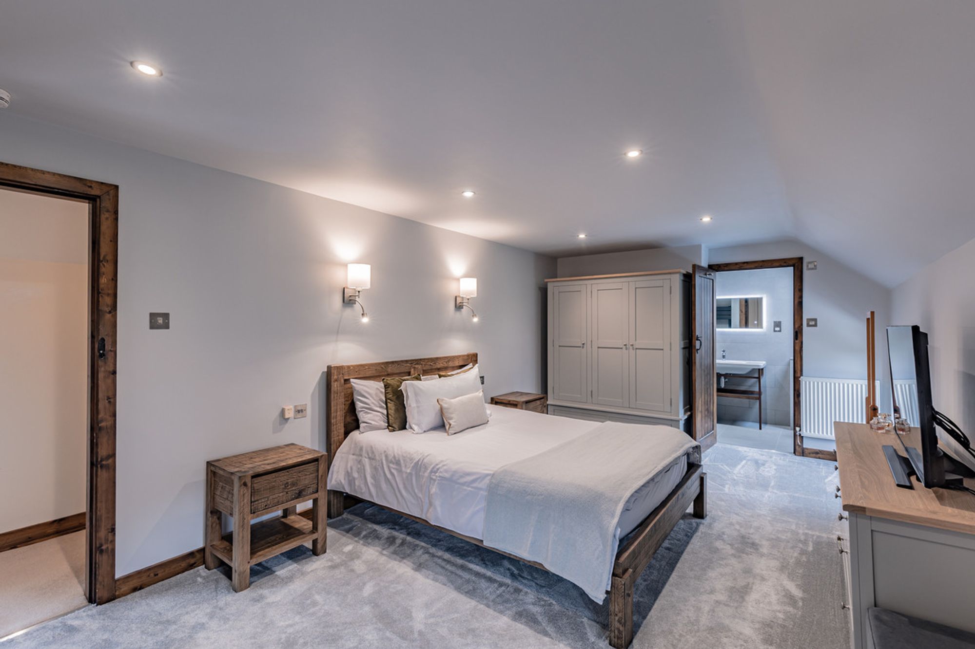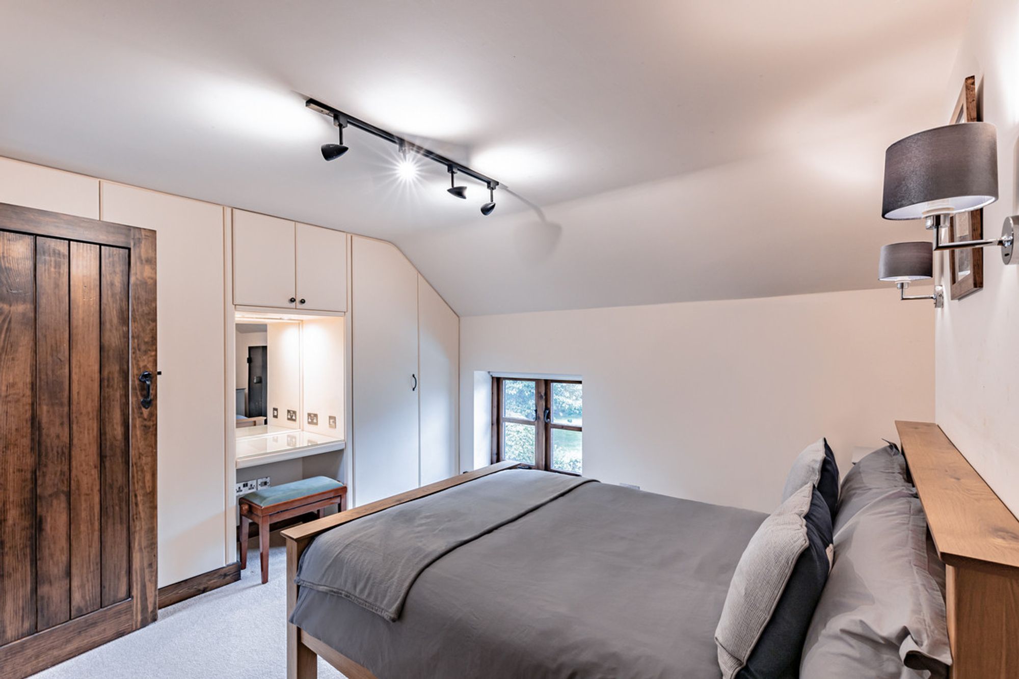 Recently refurbished and redecorated, plush, silver-grey carpet extends underfoot whilst inset spotlighting features, with sconce lighting above the bedside tables, feature fitted with reading lights. Fitted wardrobes provide plenty of storage, whilst a luxurious ensuite is furnished with large shower, wash basin with overhead LED mirror, WC and large Velux window.