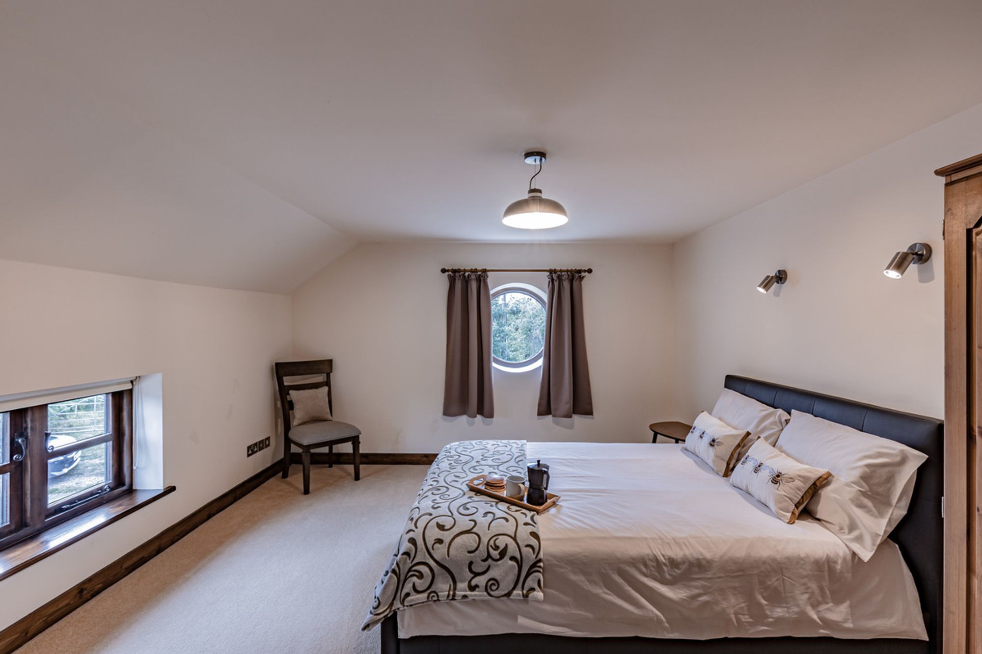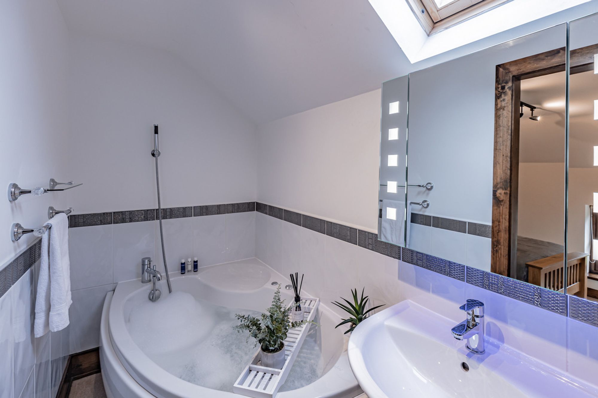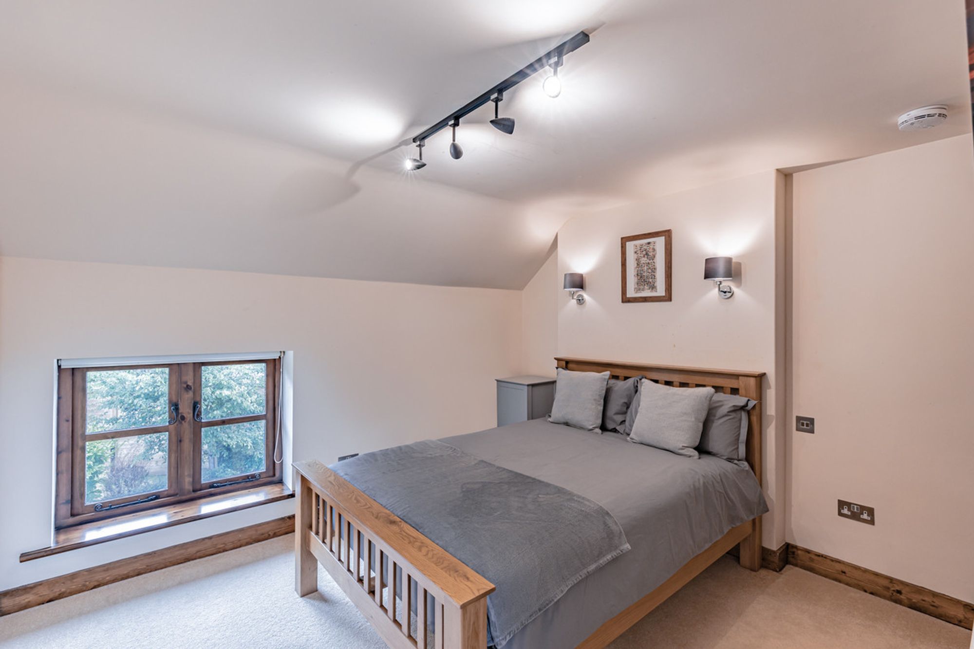 Recently refurbished and redecorated, plush, silver-grey carpet extends underfoot whilst inset spotlighting features, with sconce lighting above the bedside tables, feature fitted with reading lights. Fitted wardrobes provide plenty of storage, whilst a luxurious ensuite is furnished with large shower, wash basin with overhead LED mirror, WC and large Velux window.