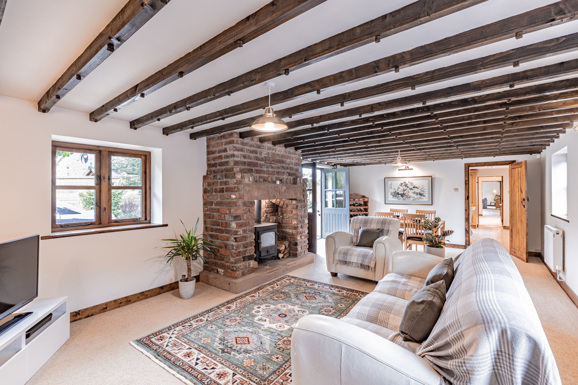 Leading on from the kitchen is a second living room. Carpeted, with solid wood skirtings, exposed beams and log-burning stove within a redbrick surround, there is a cosiness about this room that belies its spacious proportions. The perfect room for quiet nights in as a couple or watching a movie with the children. Double doors open to the front and there is ample space for a dining room.