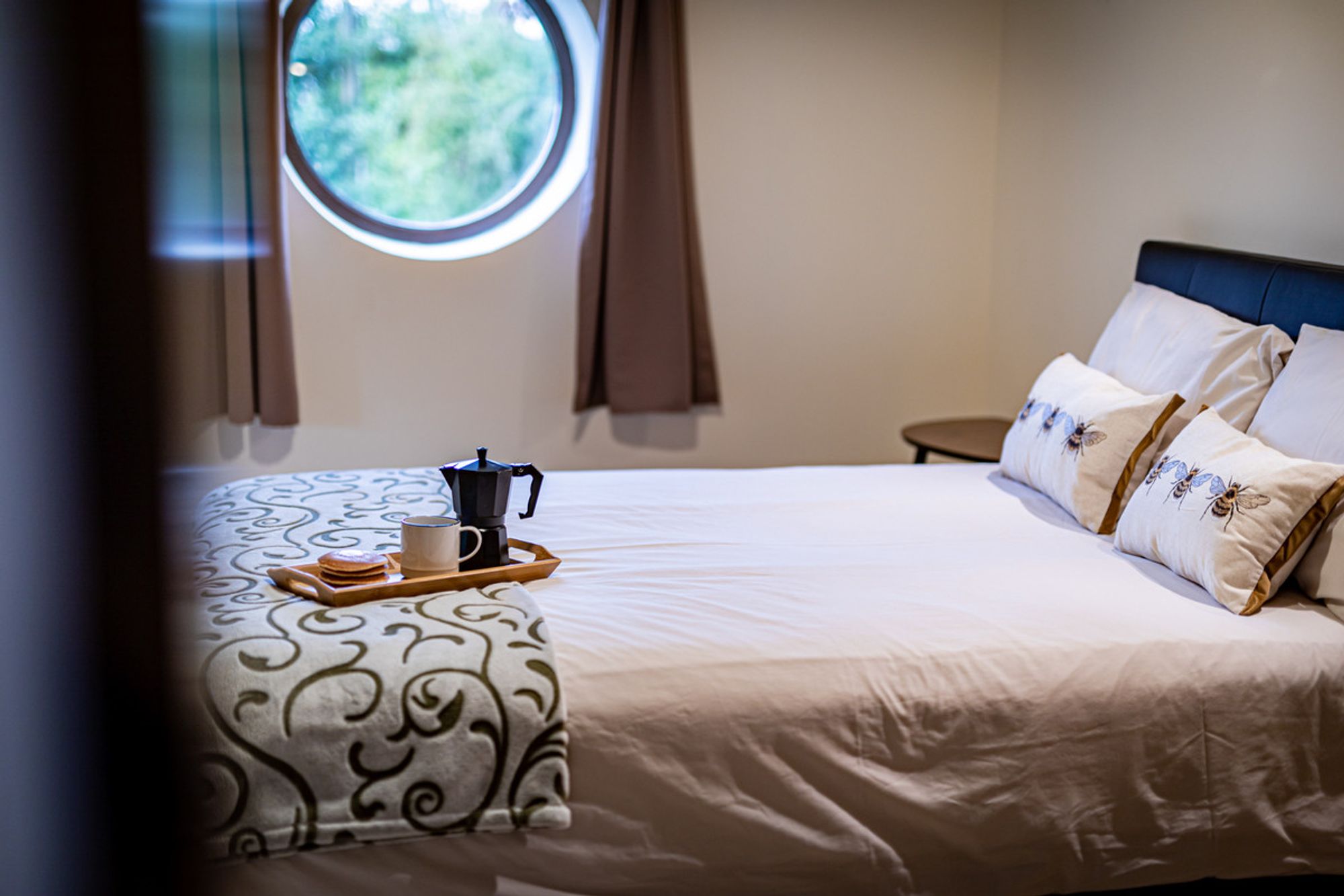 Next, bedroom four offers a peaceful bedroom for guests, set quietly away from the main flow of the home, there is plenty of space for a double bed. A quirky porthole window provides leafy views out, while a second, low window draws in plenty of light.