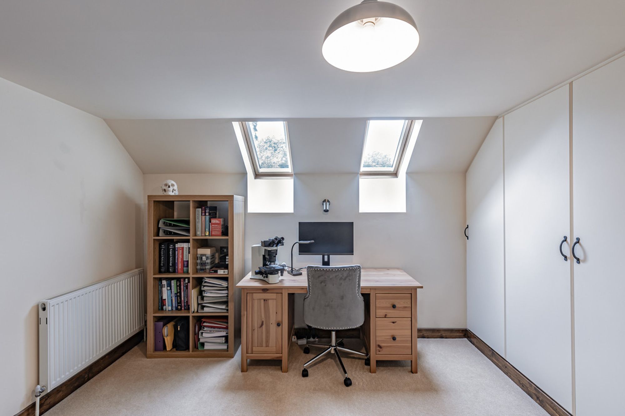 Turning left, peep through to the third bedroom, currently serving as a study. Contemporary fitted wardrobes cover one corner, providing plenty of storage, with space for two desks. Light flows in through a low window and Velux windows above creating a bright feel. There is plenty of space for a double bed.