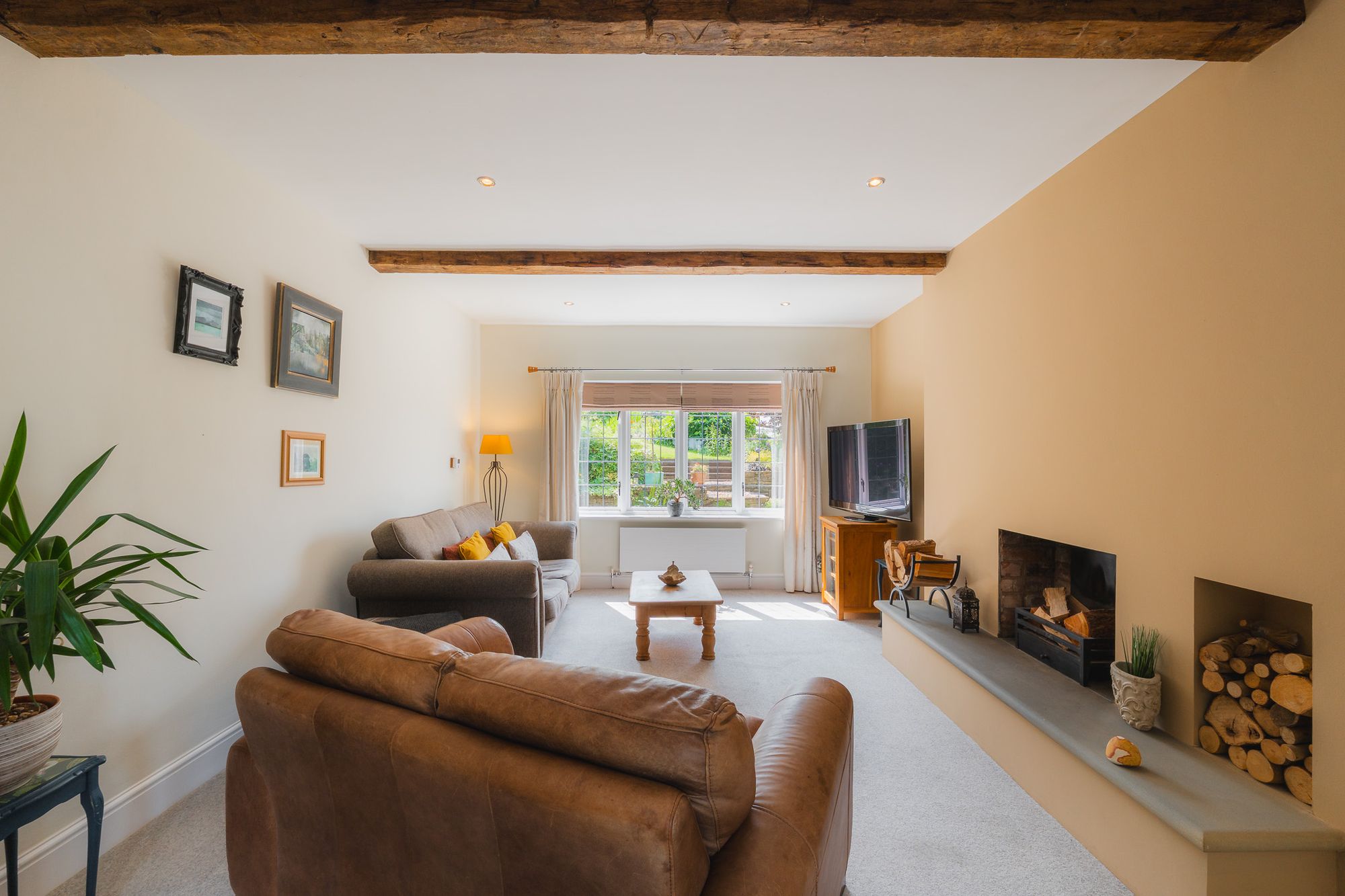 Light streams into the sizeable lounge on the left, with large windows overlooking the front and rear gardens. Cosily carpeted in grey underfoot, beams span the ceiling overhead, whilst on crisp winter nights, warmth emanates from the open fire.