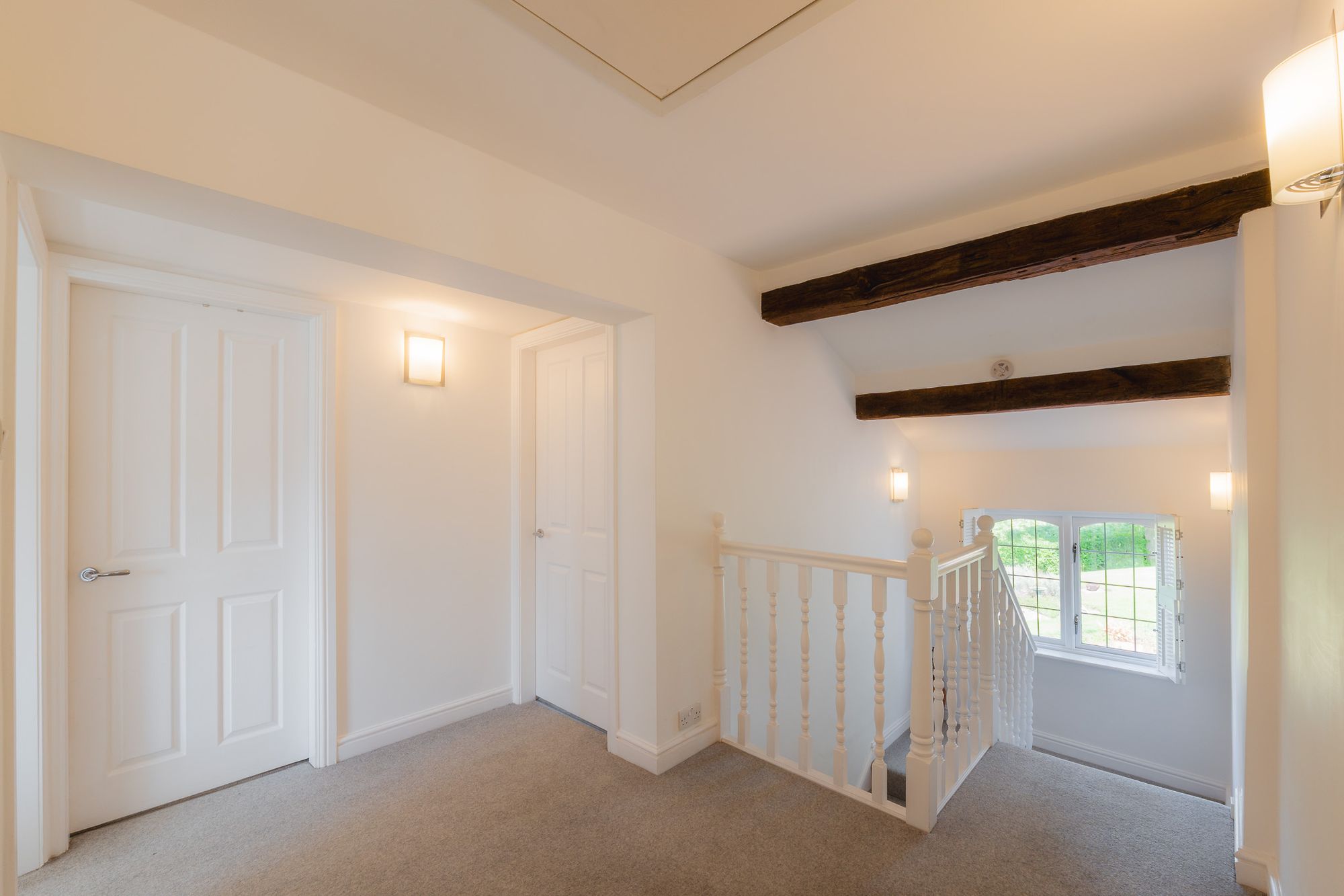 From the entrance hall, light streams down from a shuttered window on the turn, offering idyllic views out over the fields, before the stairs continue up to the main landing.