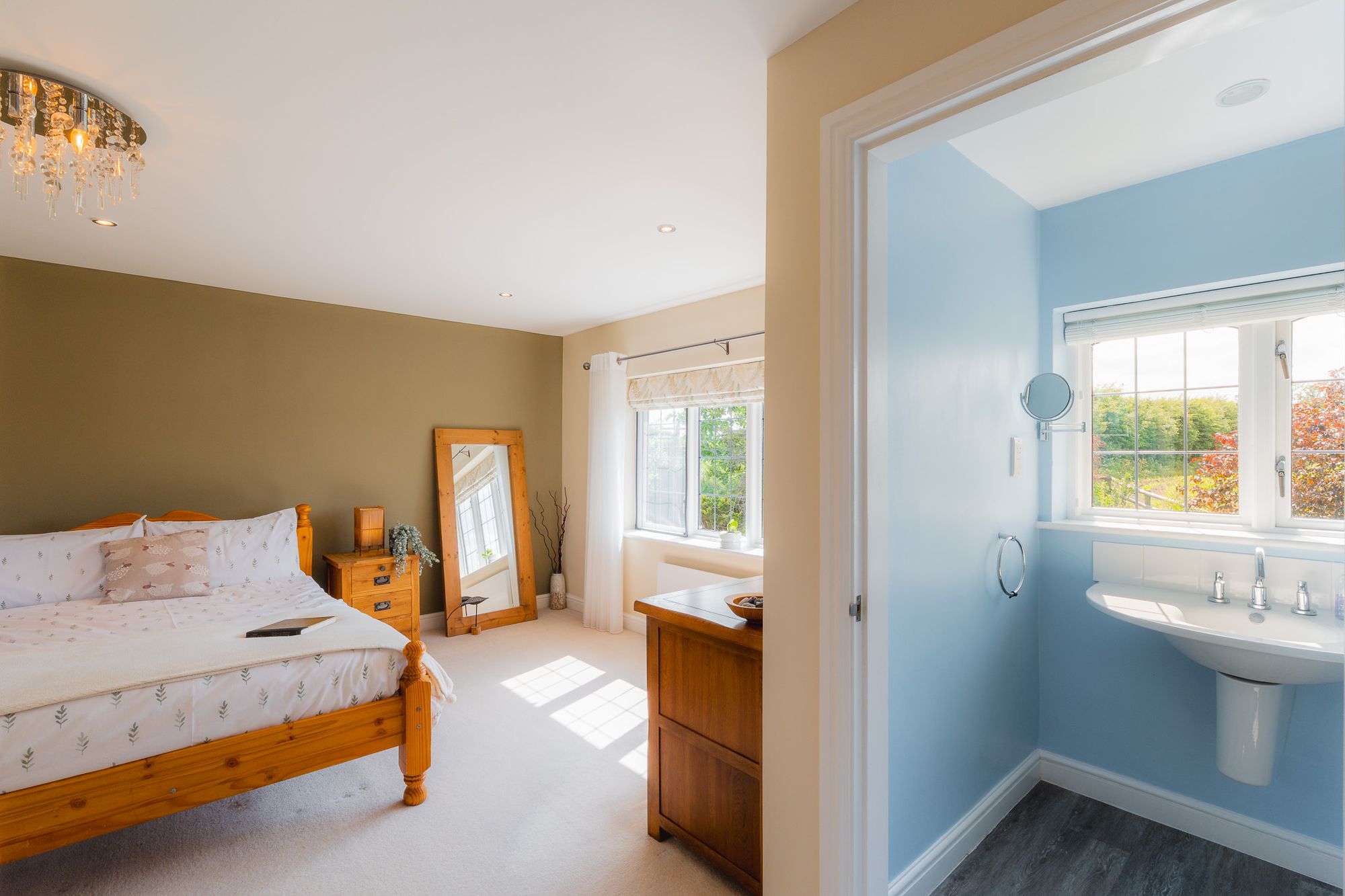 Earthy green tones borrow from the nearby forest landscape in the master bedroom to the left, a soothing, restful haven, where incredible views feature to both sides. Spacious and serene, storage is ample in the large, walk-in wardrobe, whilst the shower room ensuite is the perfect place to freshen up for the day ahead.