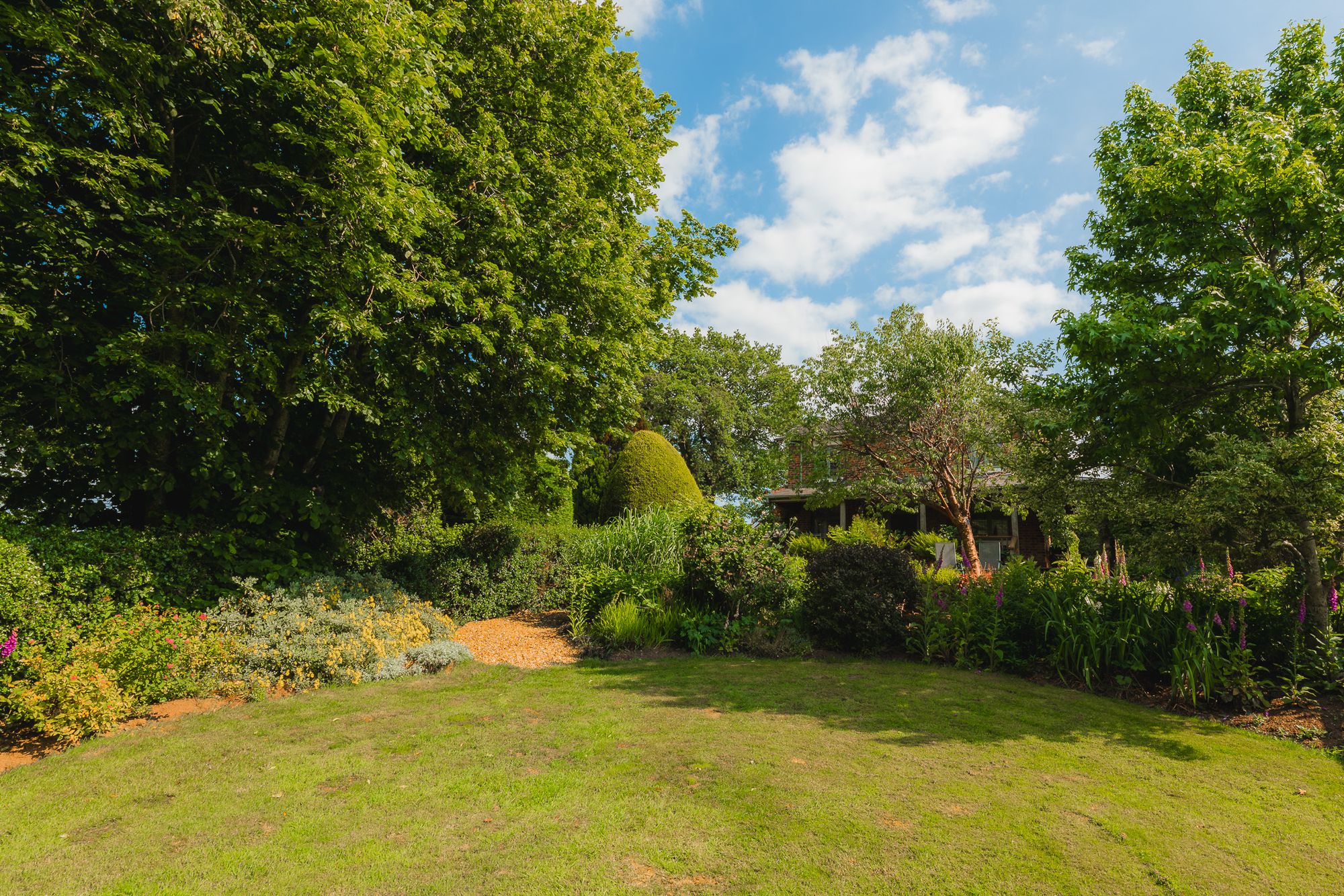 Step outside and the garden unfolds in layers; lawn, borders, blossom and shade, with the inimitable views out over the open countryside ever present.