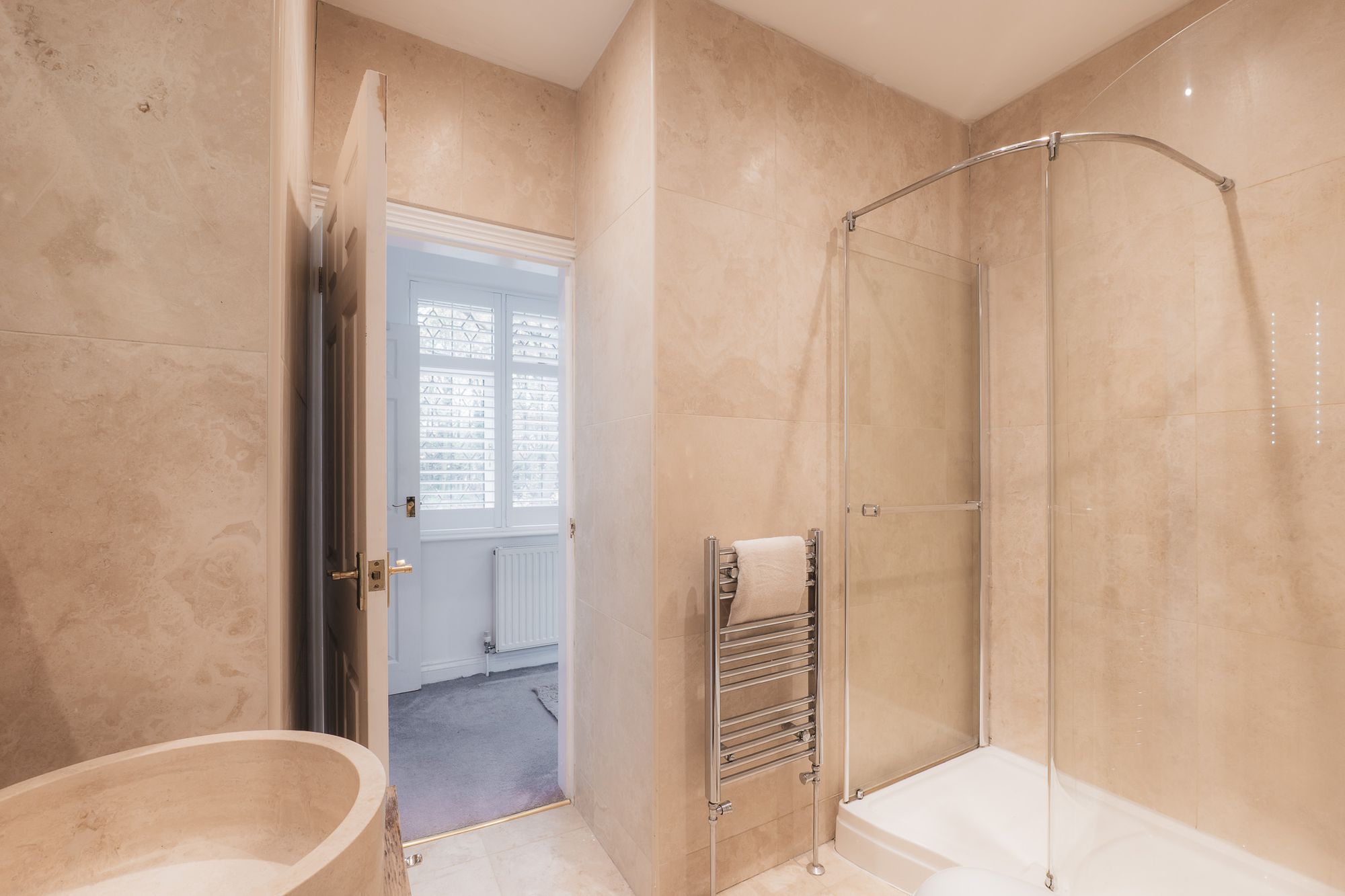 Returning to the stairs, turn left up to a separate wing, where the family bathroom spans out over two sections. Honed for family life, there is ample space around the wide twin wash basins for the morning toothbrushing huddle and a freestanding tub in the back section ideal for scooping two or three children in and out before they’re bundled up in towels, plucked warm from the heated ladder radiator. A separate double shower is also perfect for a morning spritz.