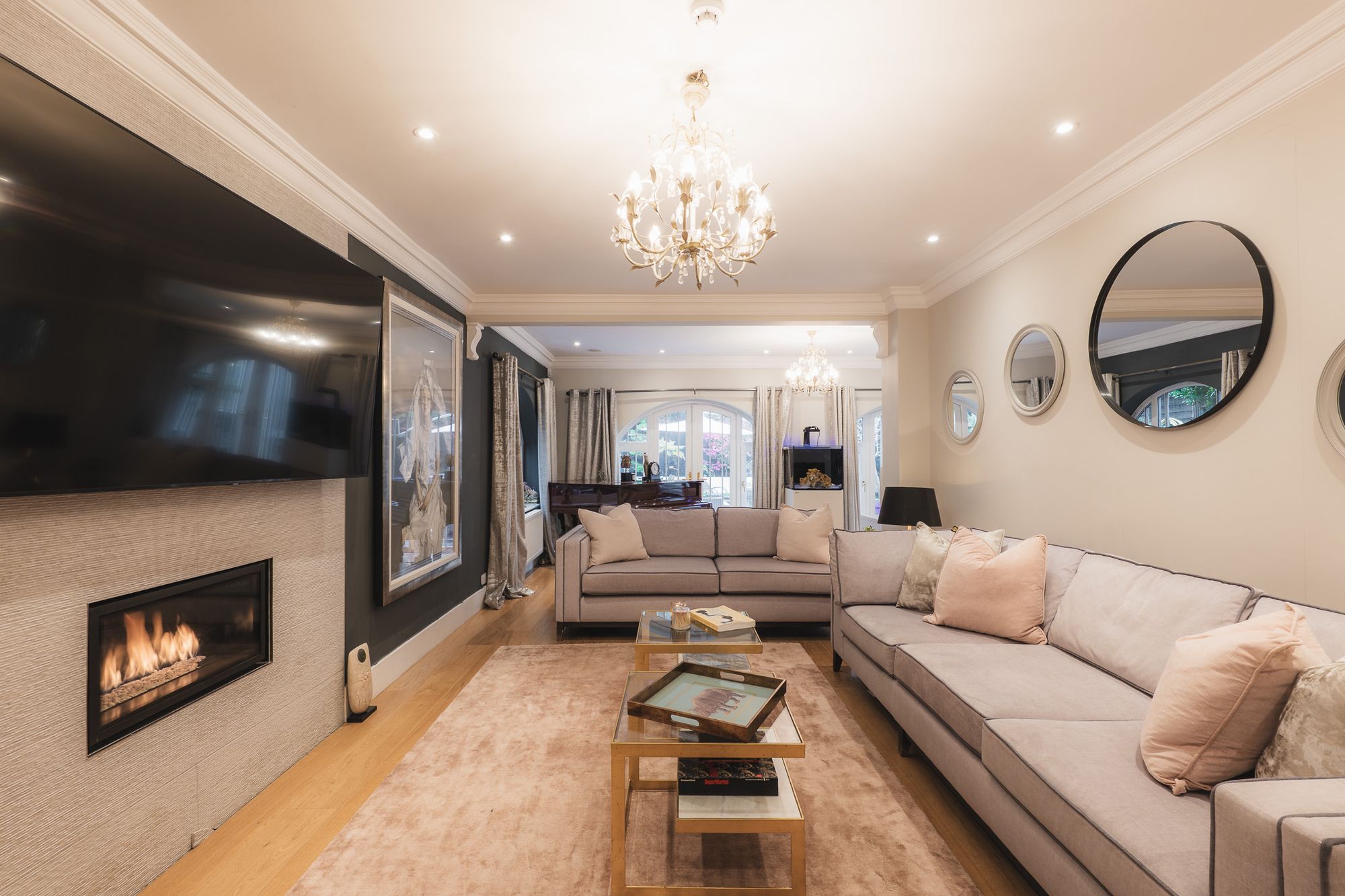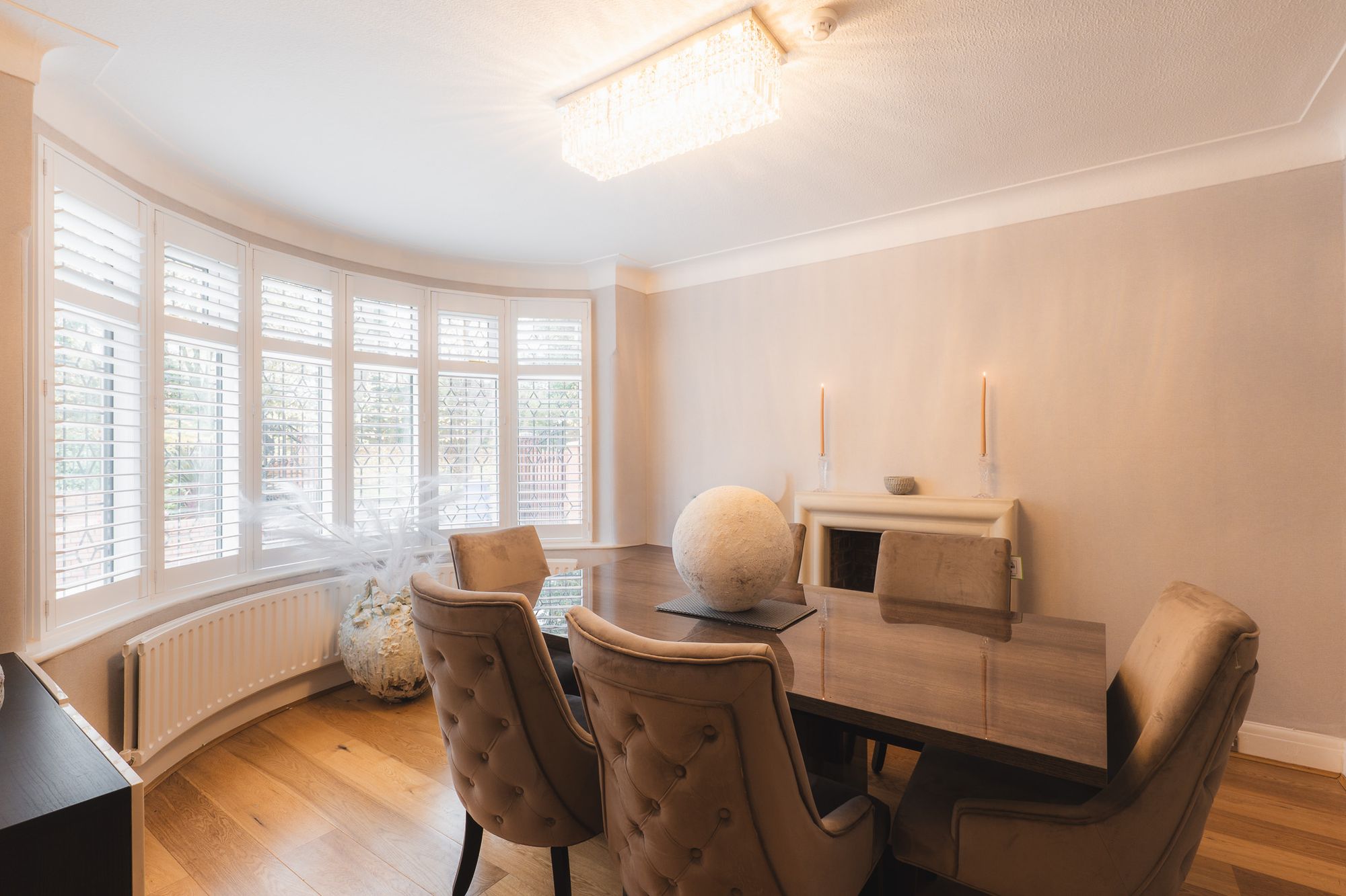 Across the entrance hall, another set of double doors open to the dining room, where an open fire infuses warmth, and light streams in through the bow window overlooking trees. Soothing shades of grey and white create a soft, minimal and contemporary feel.