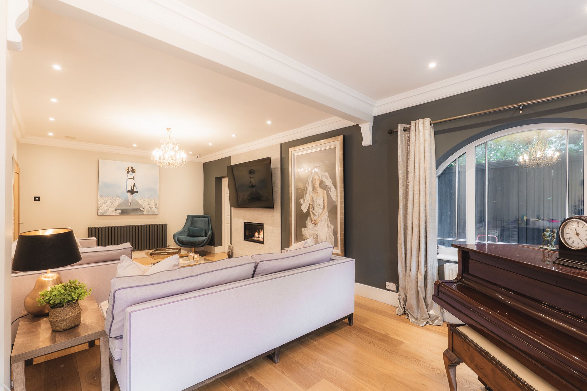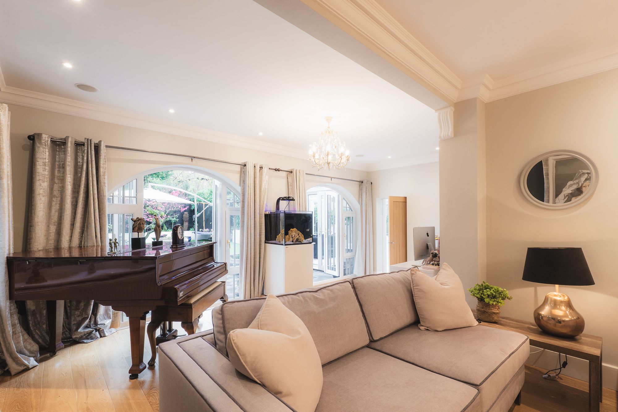 Double doors to the right open to a living room, restful, calm and versatile, with light flowing in through a bow window to the front.