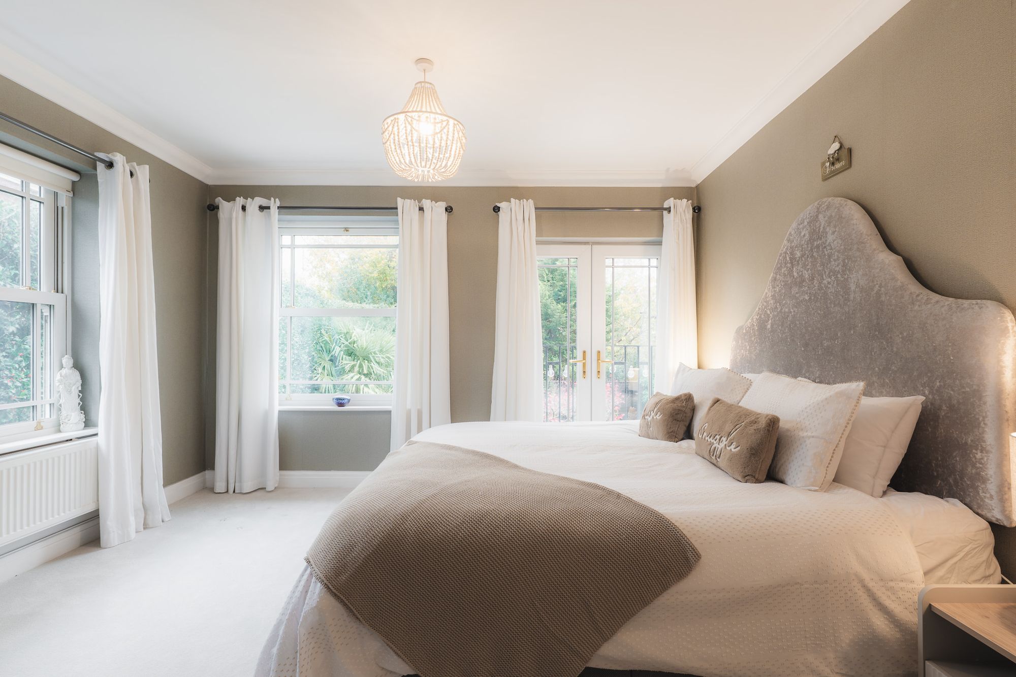 Turning right, built-in mirrored wardrobes lead to the peaceful and private master bedroom, dressed in earthy neutral tones, where twin French doors open to Juliet balconies, inviting the garden views in. Above, there is provision to create a mezzanine level.