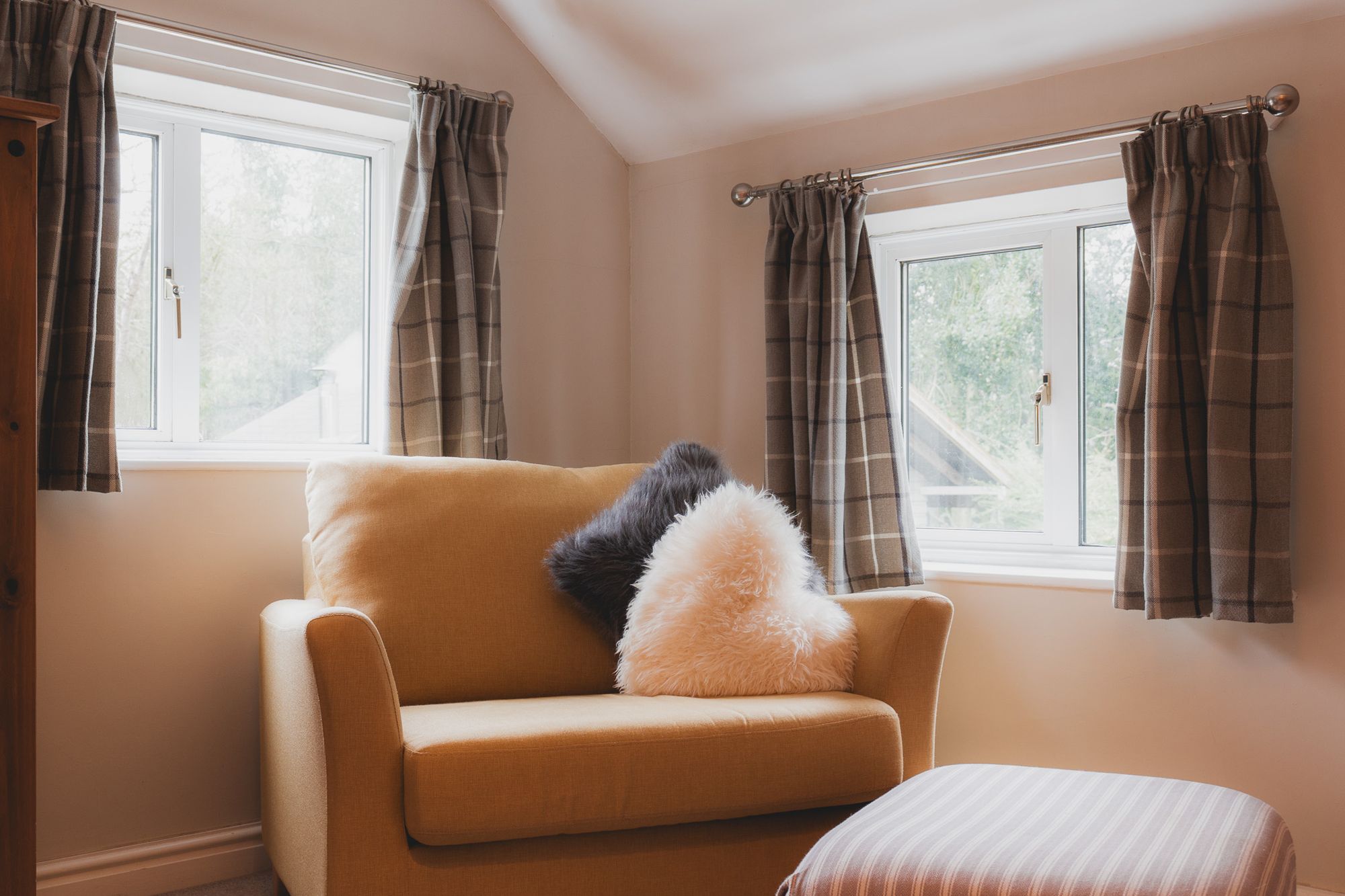 Spacious, warm and always cosy, a third double bedroom previously used as a nursery, this quiet room with its gently angled ceiling invites views out over the fields to the rear from the bed.