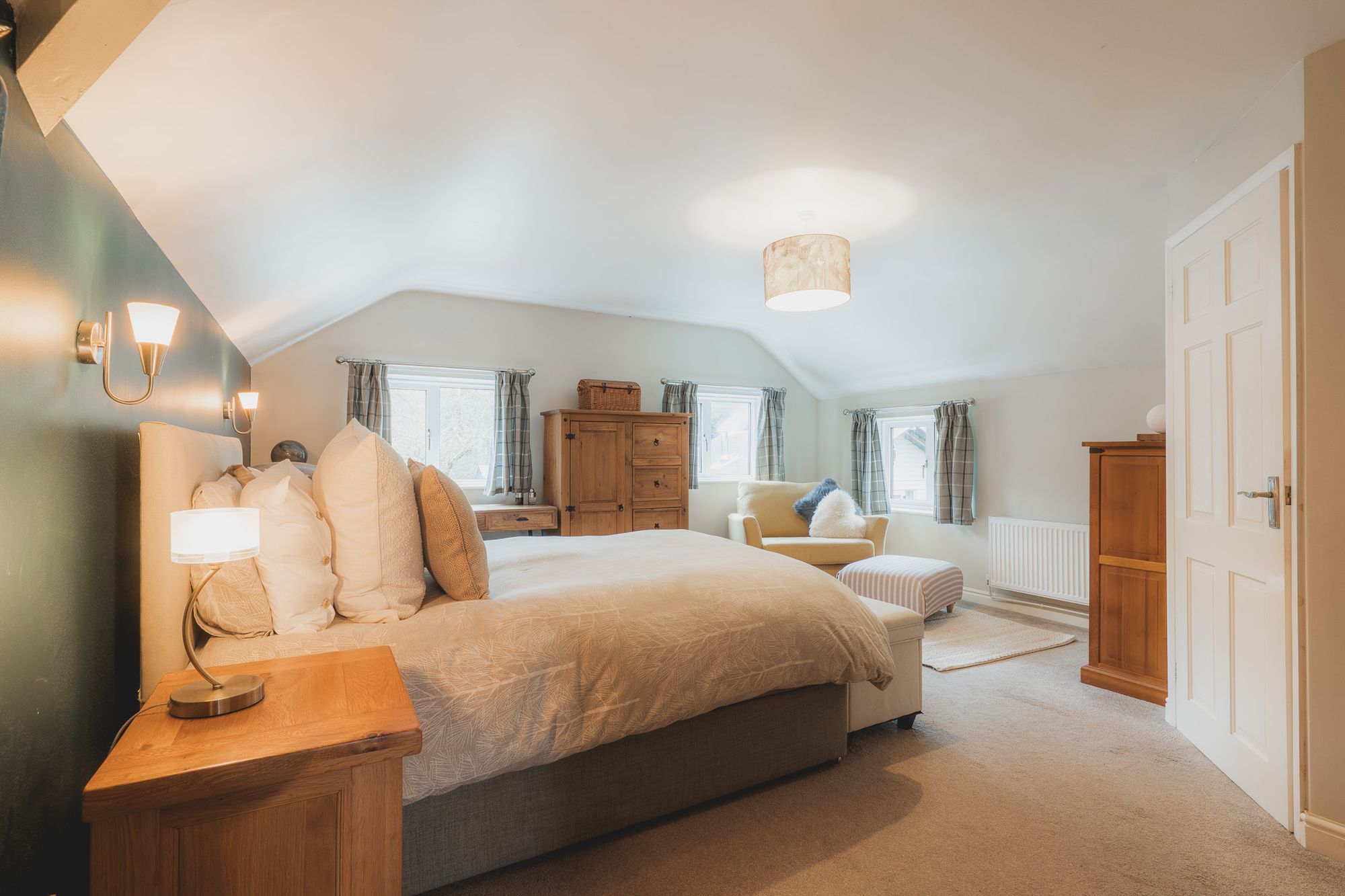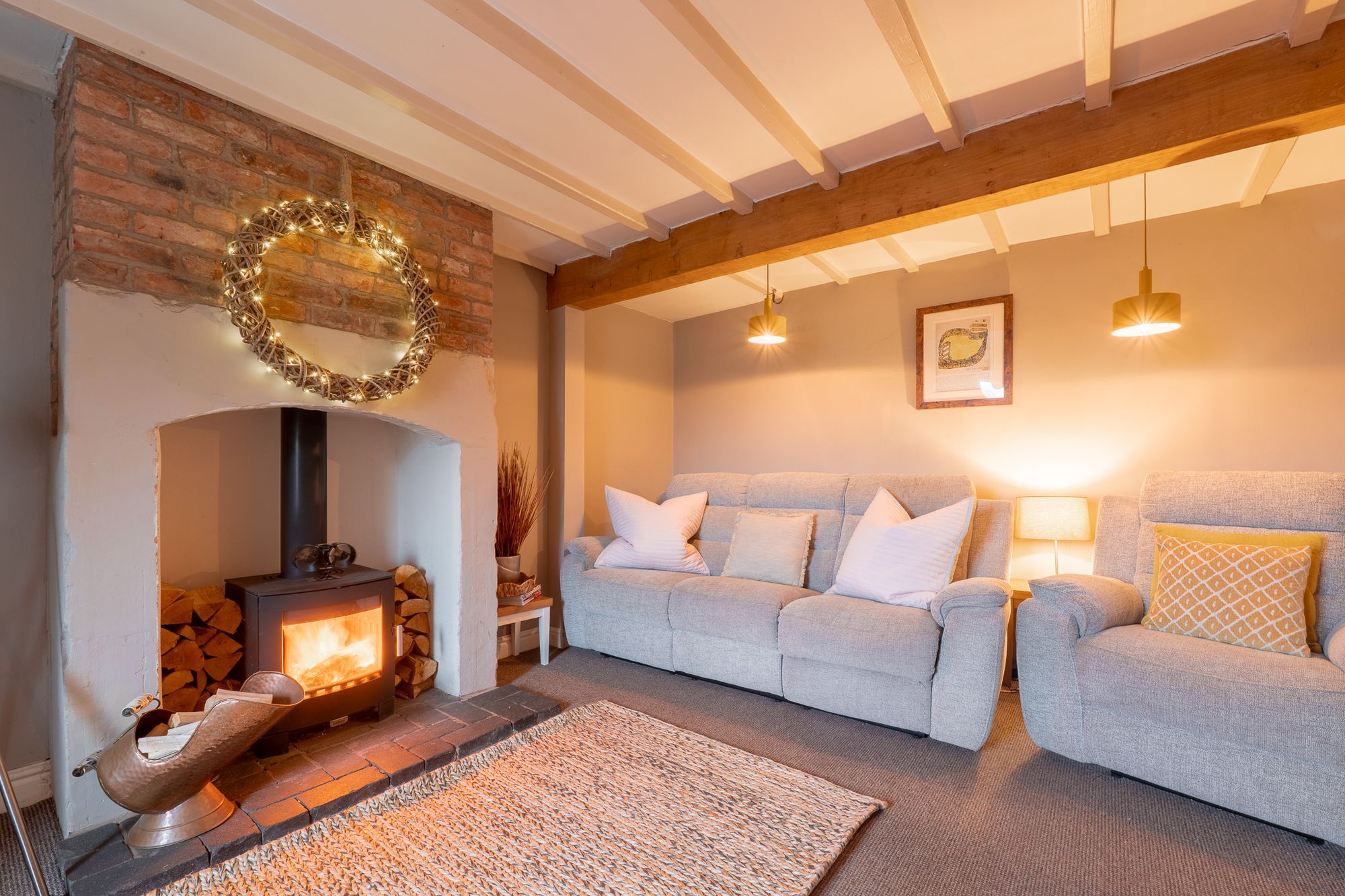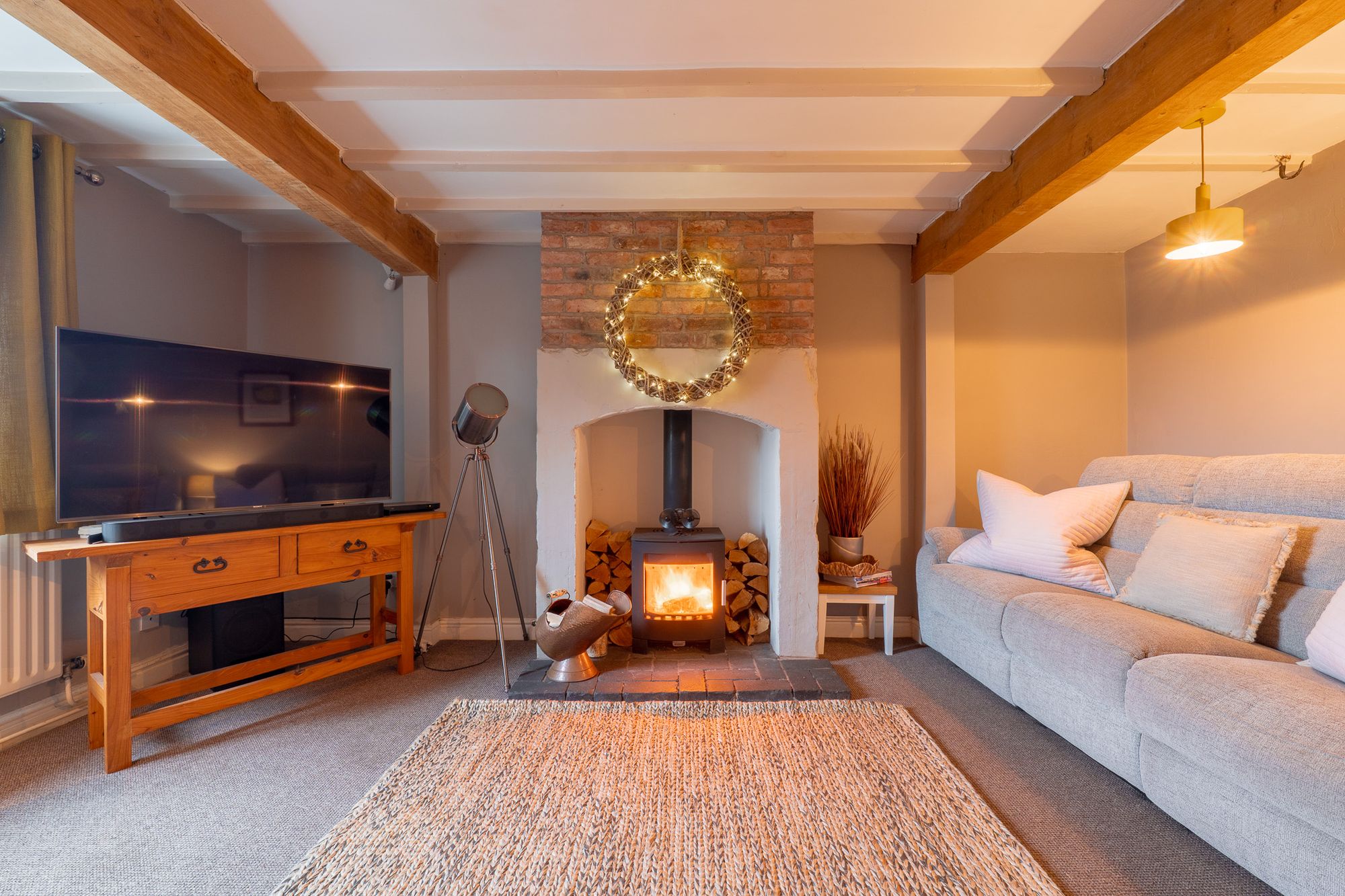 Open the latched door into the lounge, where light toned beams trace the ceiling above. Calming colours dress the walls for a cocooning feel, amplified by warmth emanating from the log burning stove, nestled within its arched surround in the chimney breast.