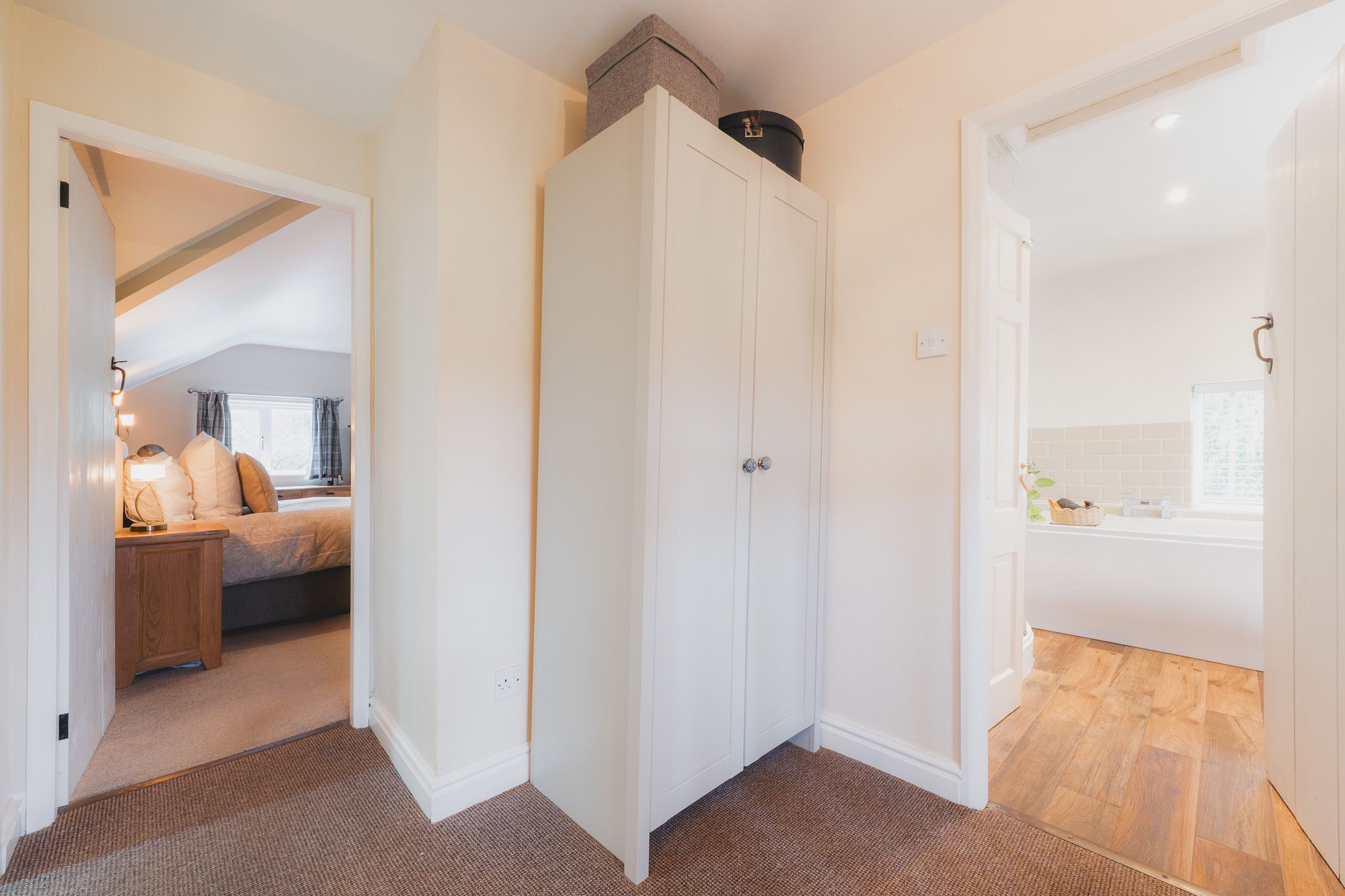 This sense of oneness with nature continues in the bathroom, with windows to two sides flooding the space with light. Freshen up in the shower, or relax and unwind in the double ended bath, from where the window perfectly frames views out to the fields opposite and grazing Shire horses. Storage is again plentiful, with a built in unit consisting of two drawers and three cupboards.