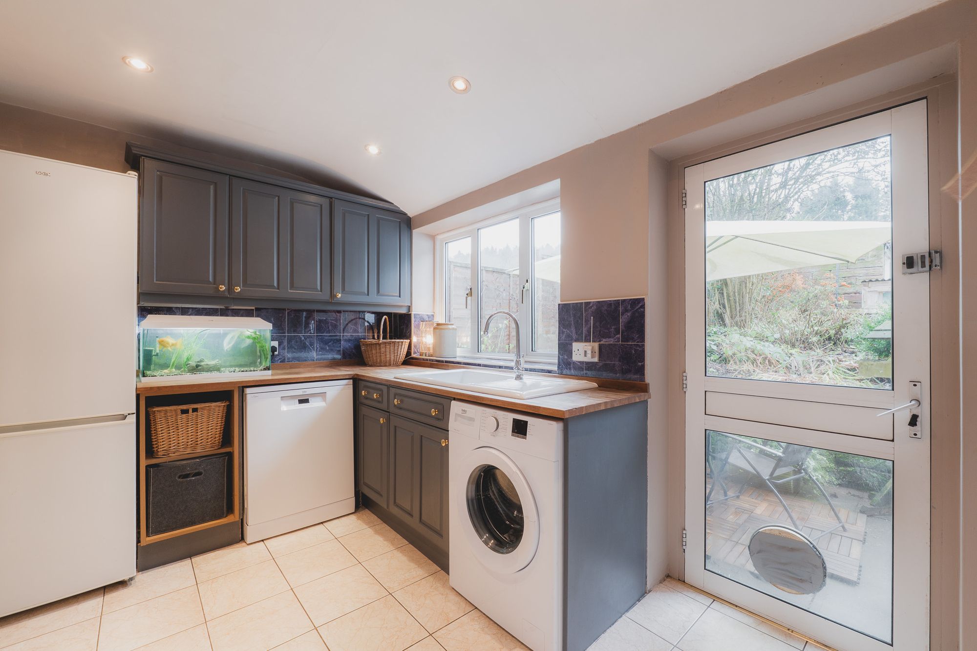 With views and access out to the garden, off the kitchen, the utility room is a huge bonus, serving almost as a secondary kitchen. Brimming with storage space, the utility room features wall cupboards and base units and even a large walk-in cupboard perfect for storing coats, shoes and pet essentials. With plumbing for a washing machine, dishwasher and also accommodating the boiler, oiled wooden worktops provide plenty of space for all kinds, from food preparation to laundry folding.