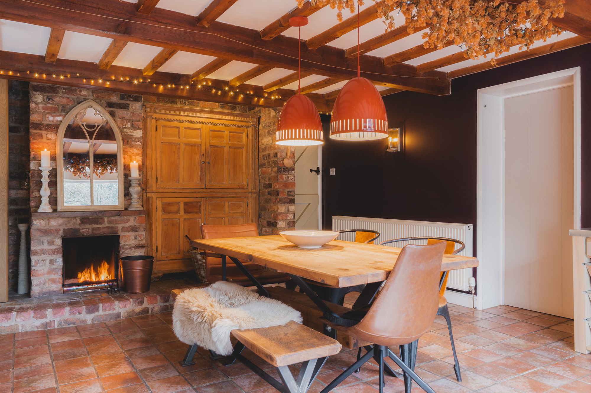 Back in the entrance hall, to the left lies the kitchen, where the essence of country living can be felt in the quarry tiles underfoot and the richly toned beams overhead. Deep plum tones contrast with the light cream coloured farmhouse-feel cabinetry, while a traditional open fire crackles merrily from within an impressive, exposed brick hearth and surround – wonderfully cosy in wintertime.