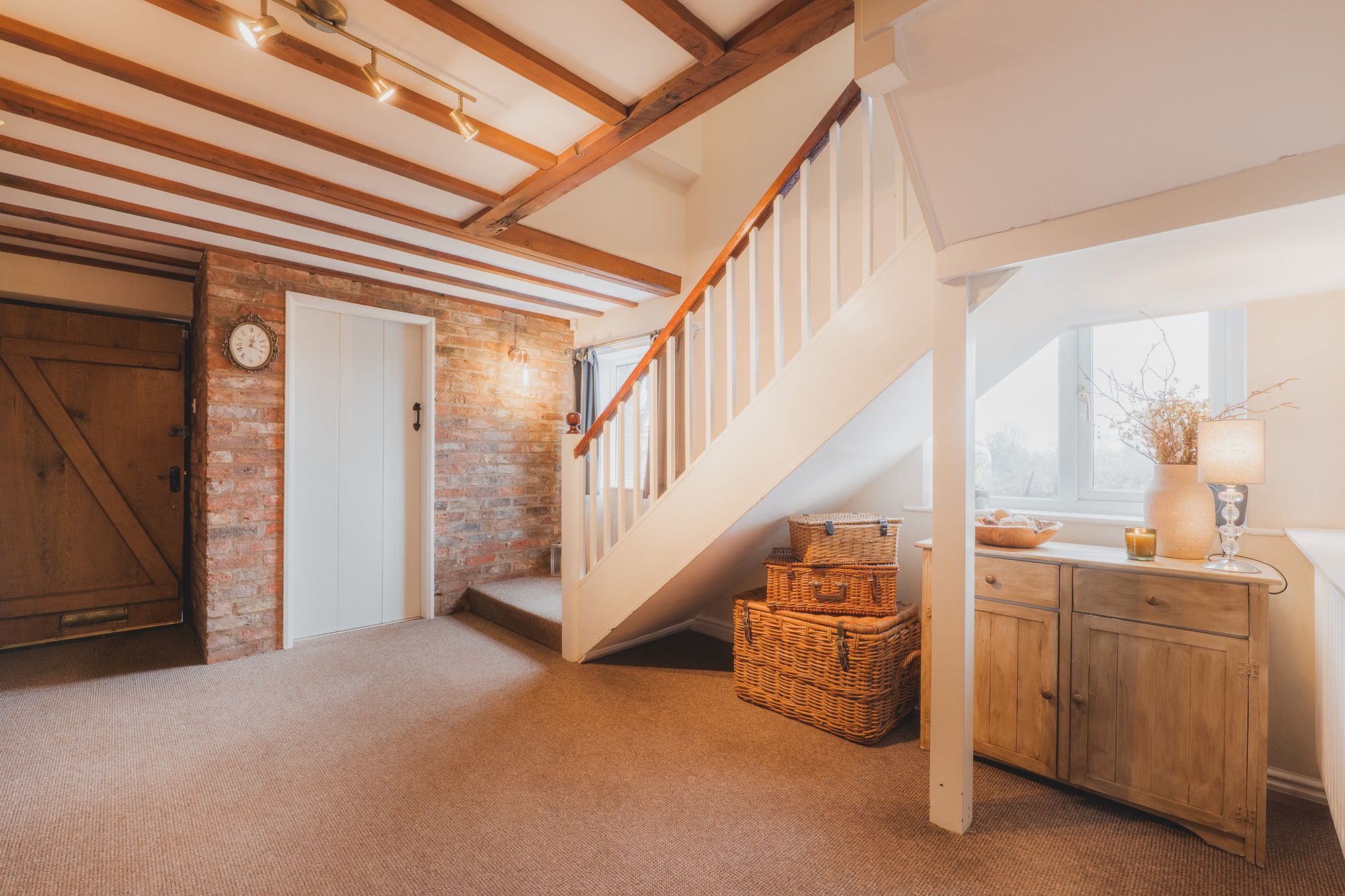 Once indoors, exposed brick and beams evoke the sense of heritage within Greenways; a home extended over the years to serve a modern family’s needs. Light streams in through a wide window at the foot of the stairs, offering a preview of the fantastic, far-reaching views out over the fields that beckon at Greenways, while a second window beneath the stairs, shares these views, providing a cosy reading nook.Also to the left a downstairs cloakroom with wash basin and WC are to hand.