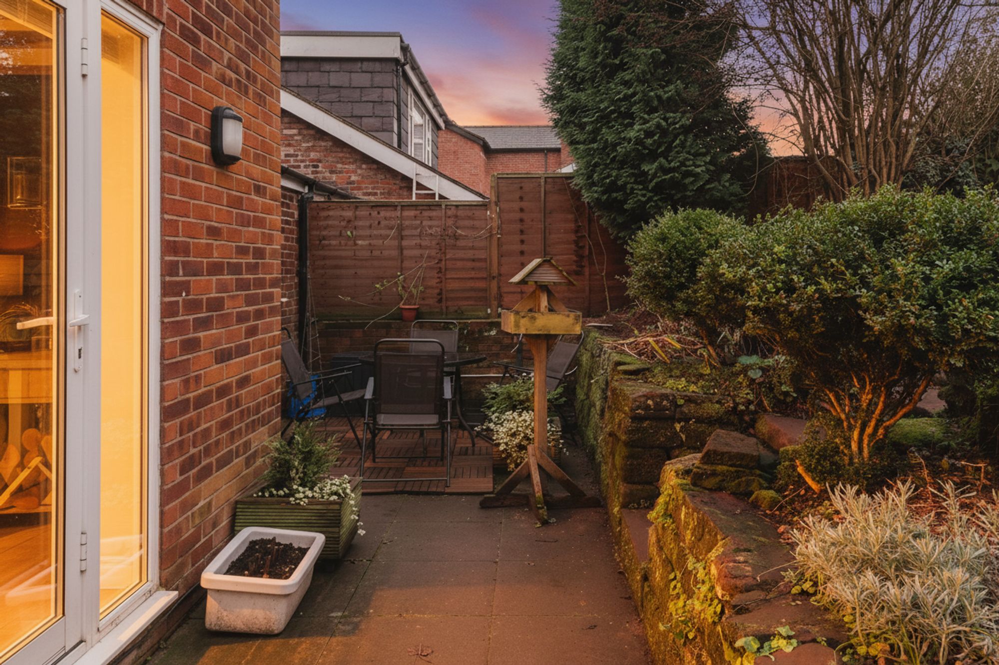 French doors opening from the kitchen ensure the garden is never far away, while raised, tiered sandstone beds to either side of the patio provide scope for seasonal planting.