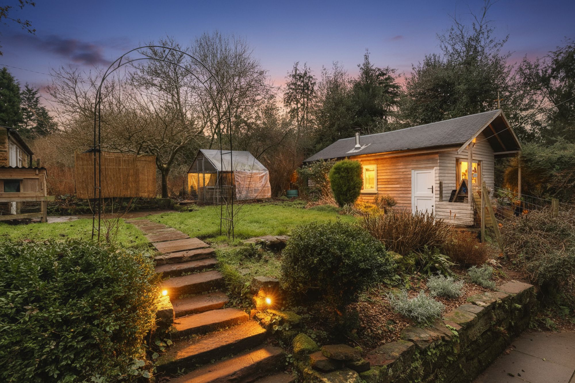 Seven sandstone steps reach up to the lawn, a lush green space for children to play. Beyond the lawn, the top terrace catches the sun later on in the afternoon before it swings around behind the trees. A sandstone store up here is handy for bikes, lawn mowers and other gardening and outdoor essentials.