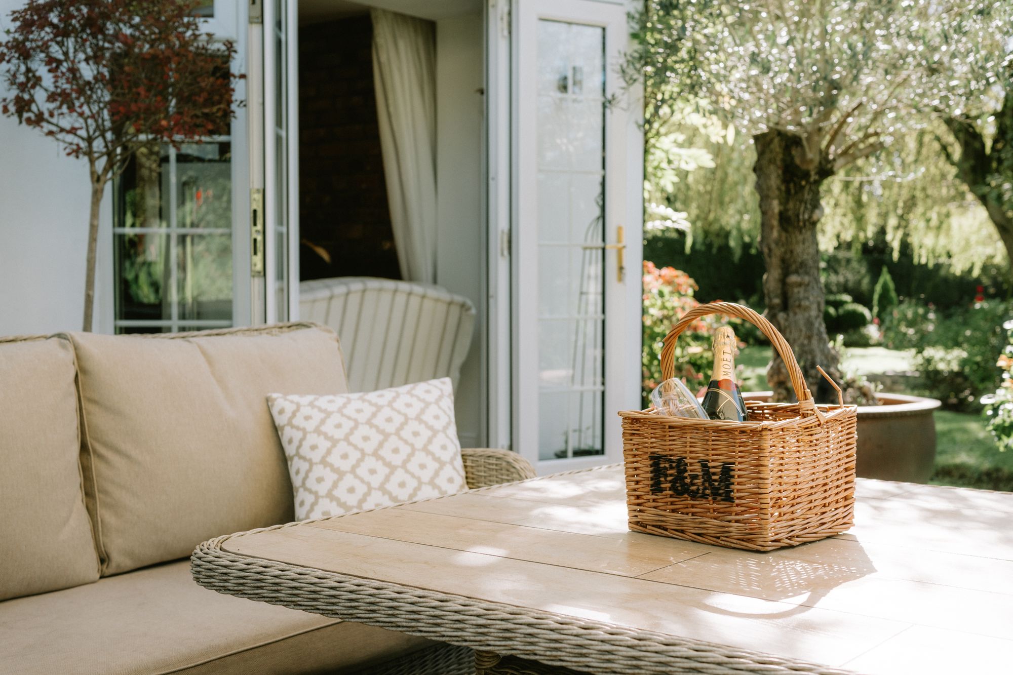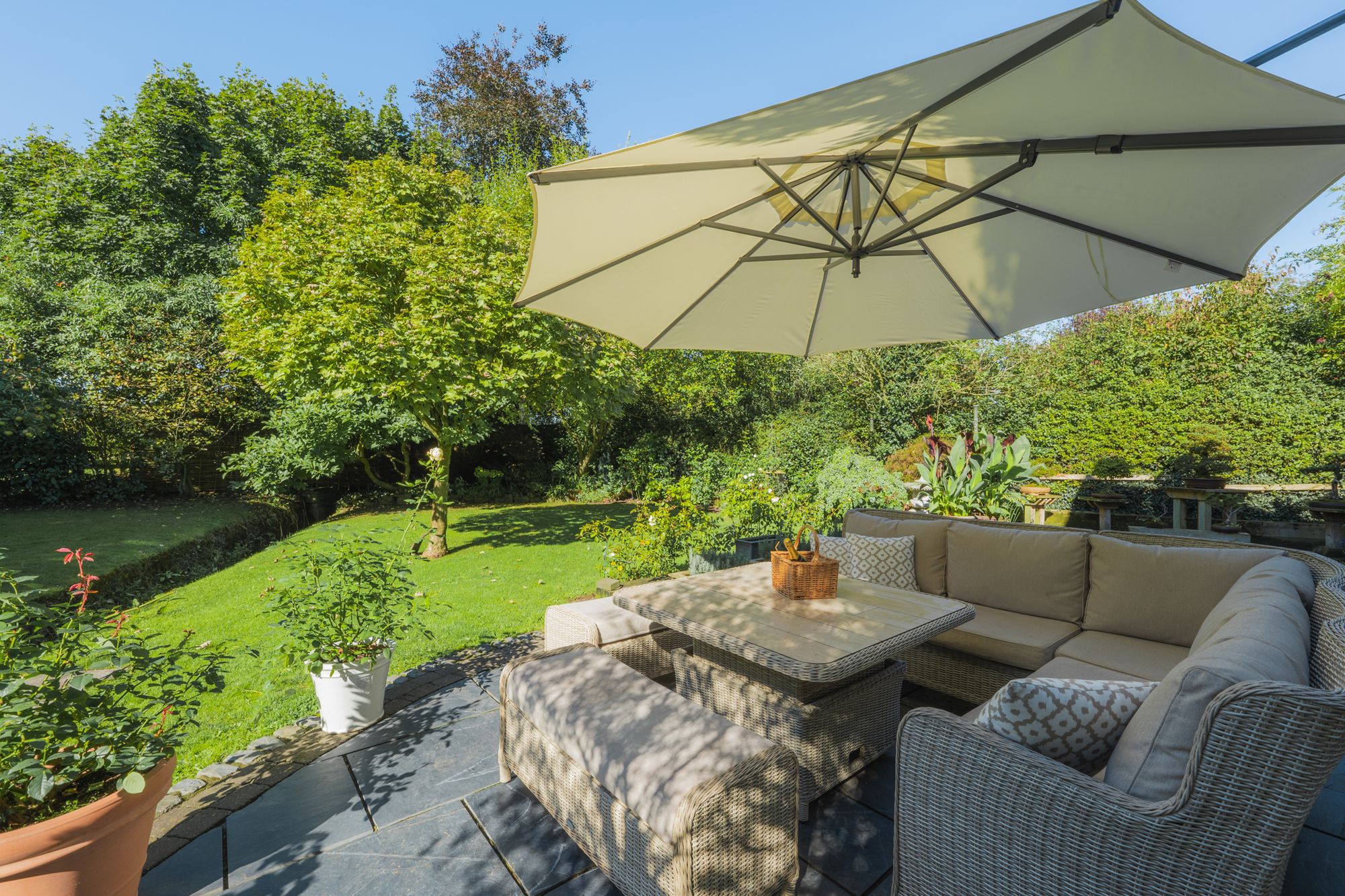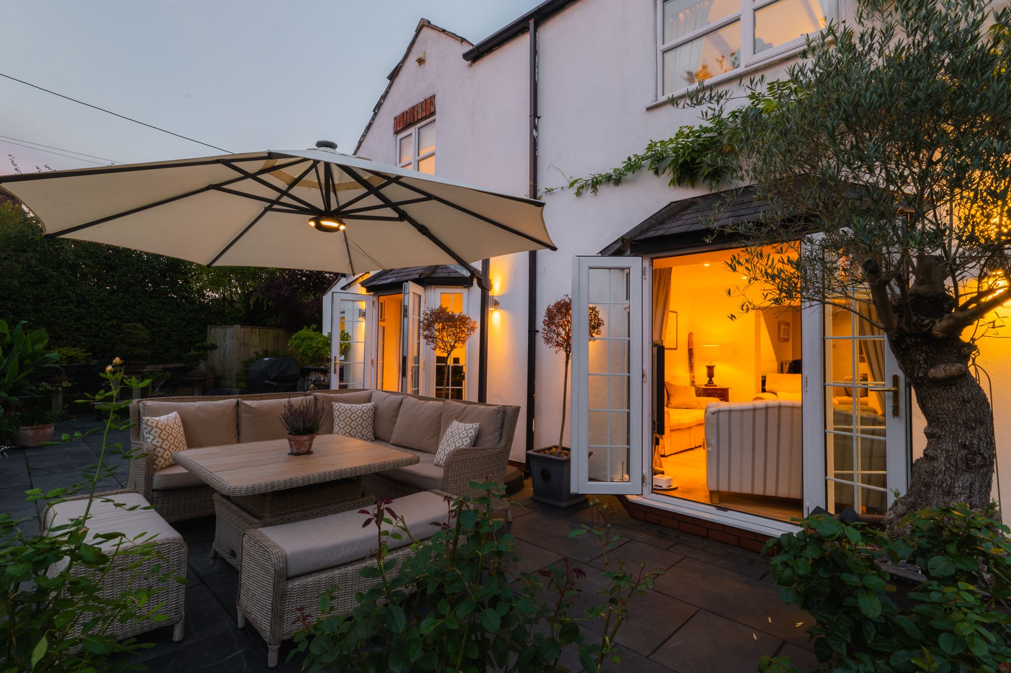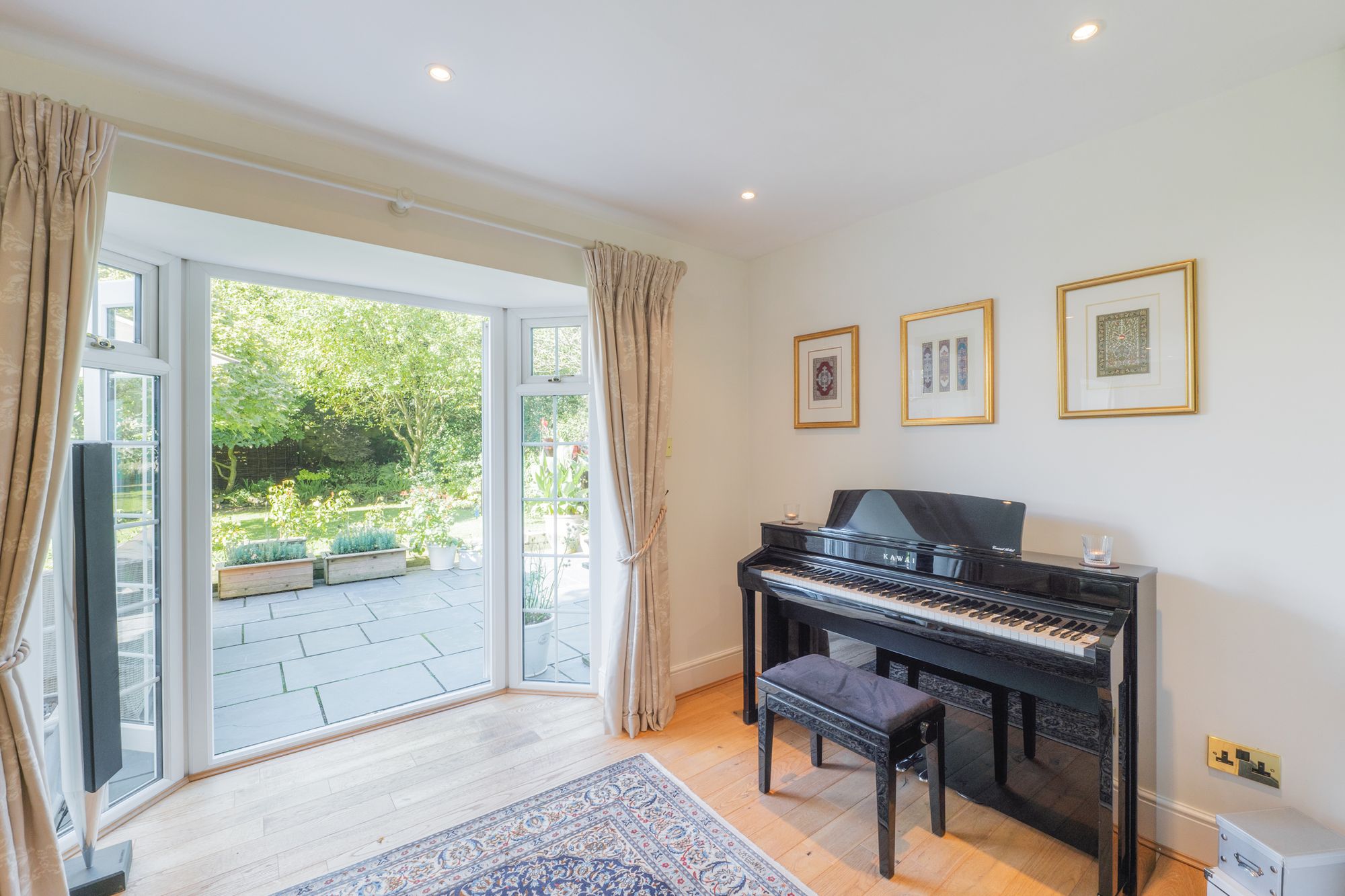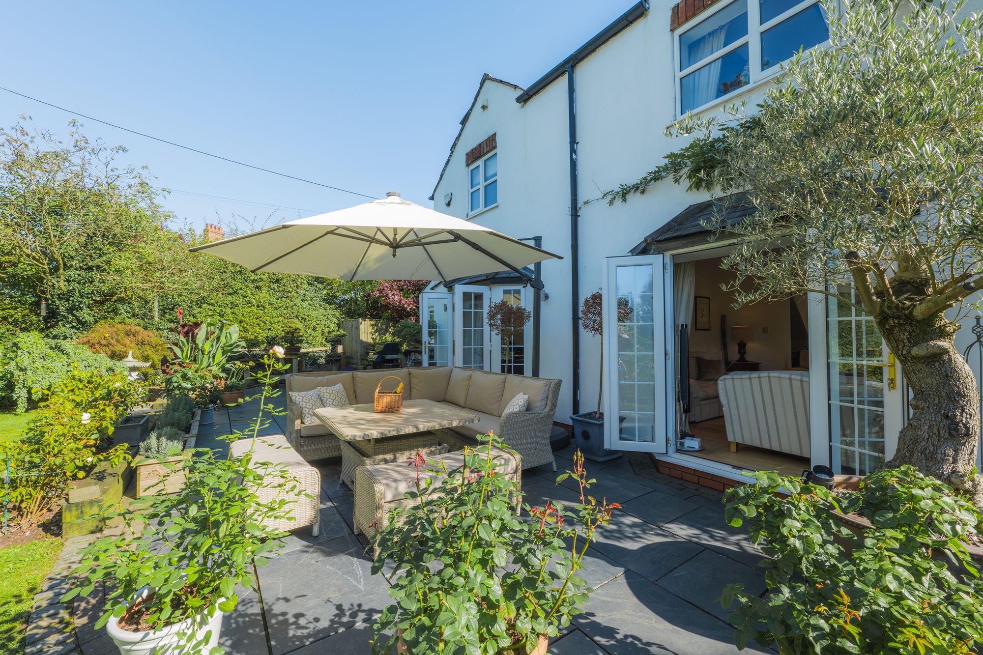 French doors within two bright bays open to the patio, allowing you to move indoors and out in the summer months, bringing the garden within easy reach.
