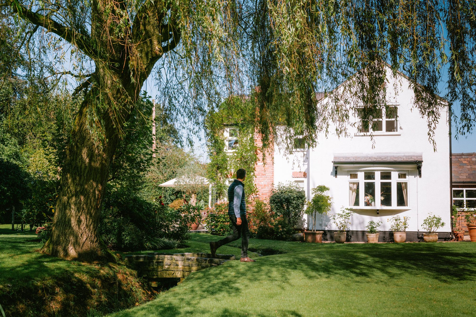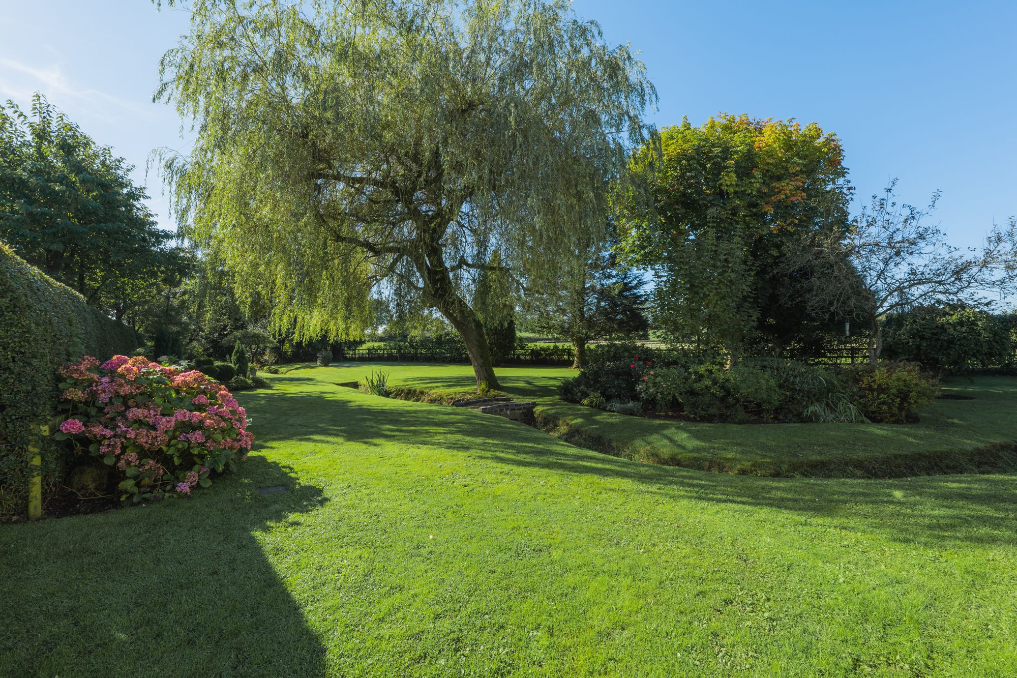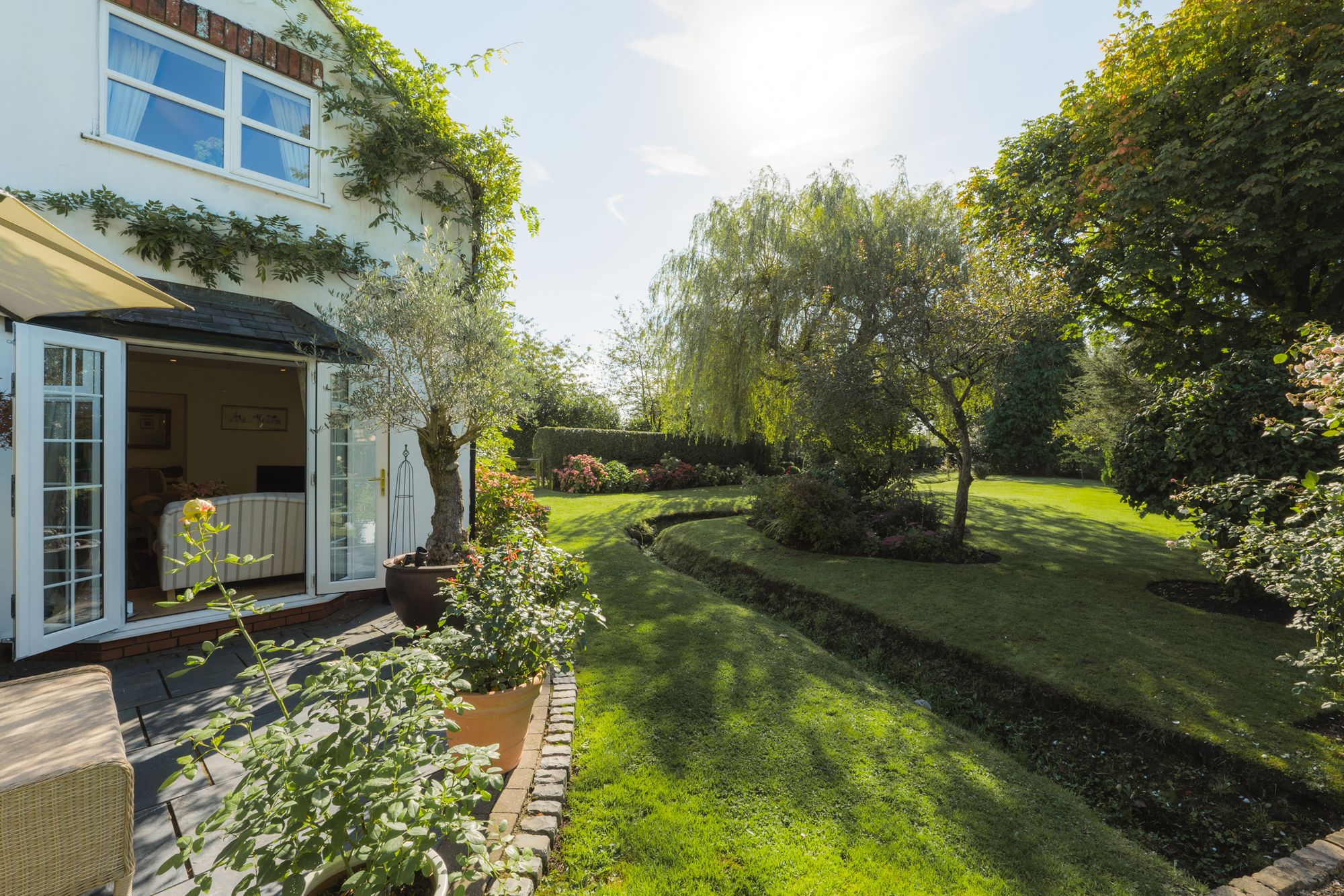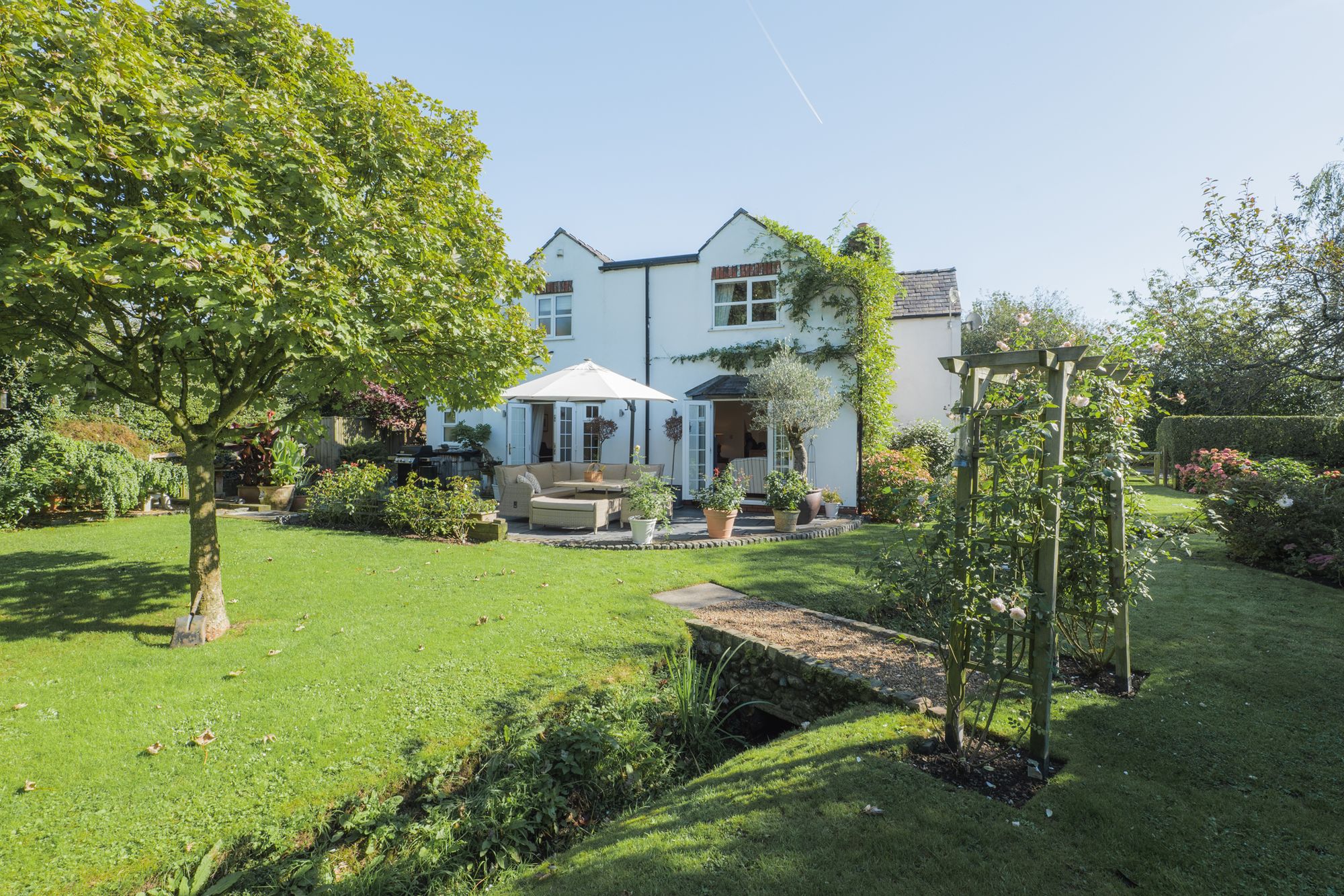 Relax and recline with a refreshing drink, listening to the wildlife; scampering squirrels and vocal songbirds, including mistle thrushes, song thrushes and robins, who make their home in the established trees. A glorious stream runs, with the rainfall through the garden, crisscrossed by quaint bridges and walkways.