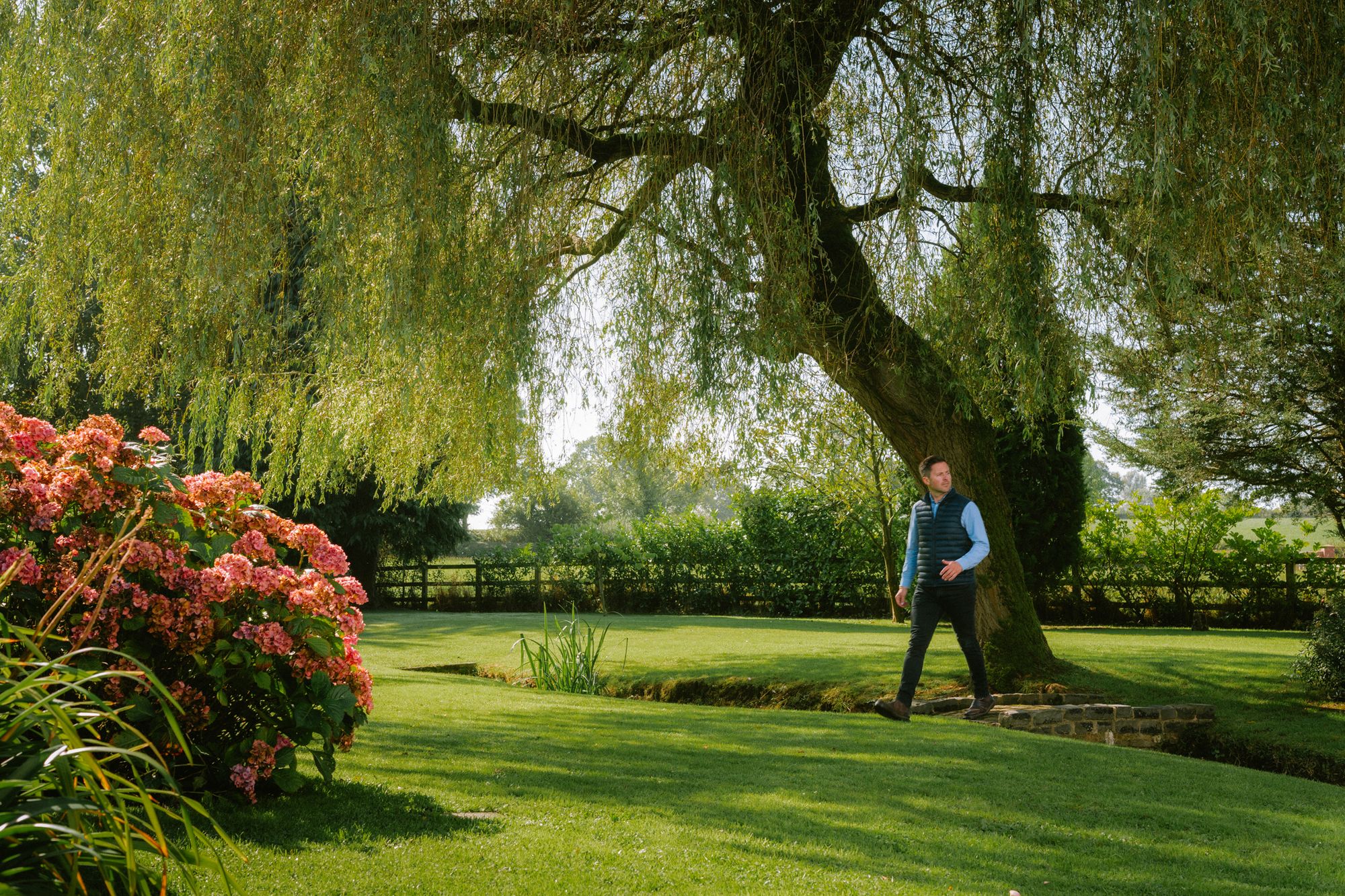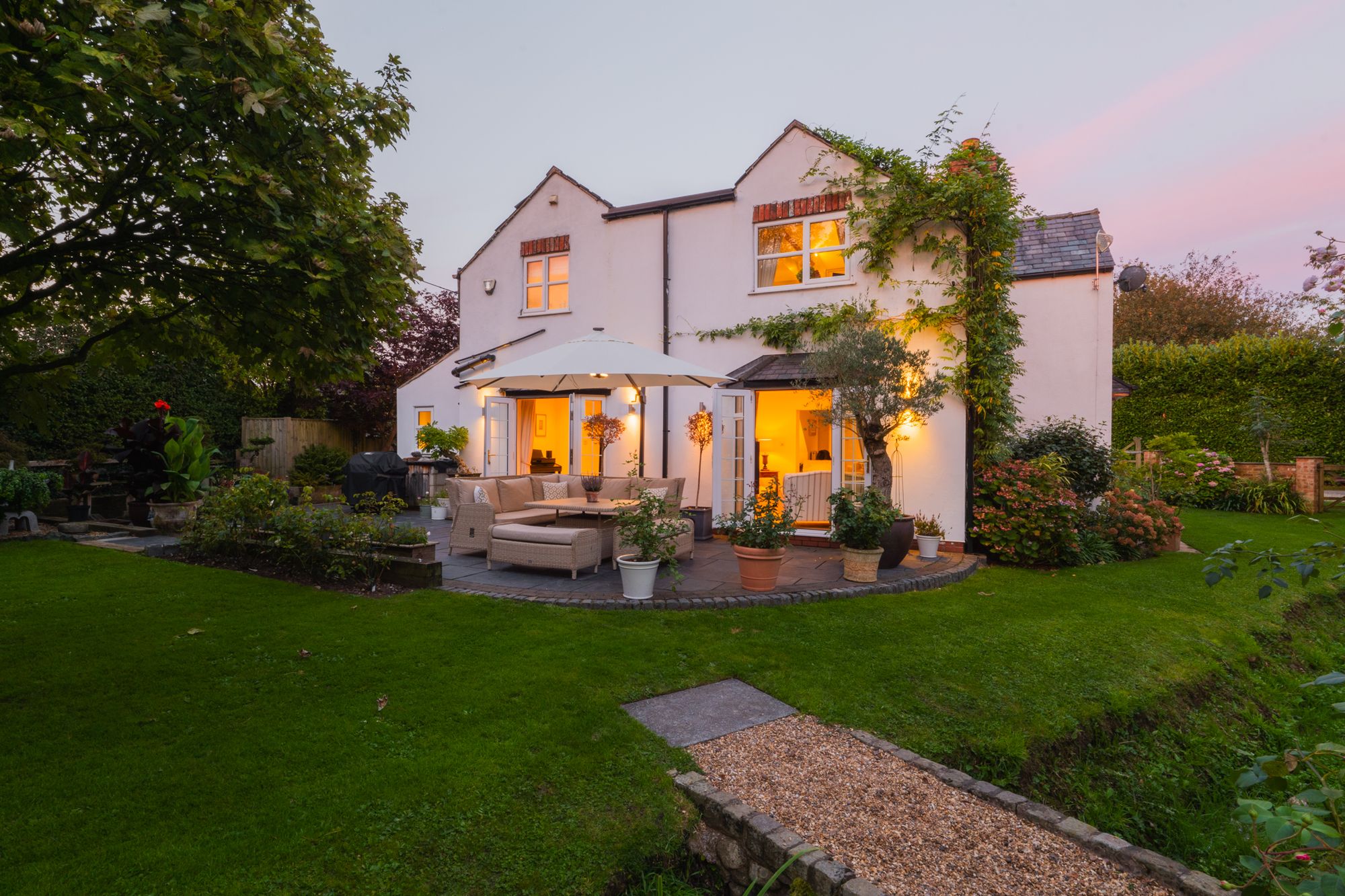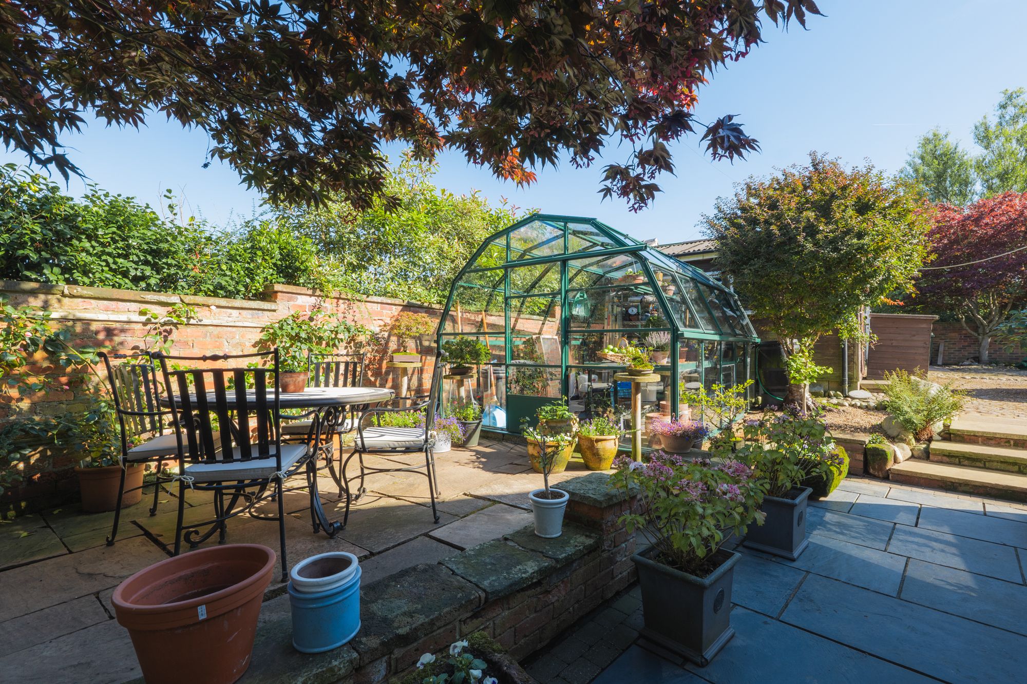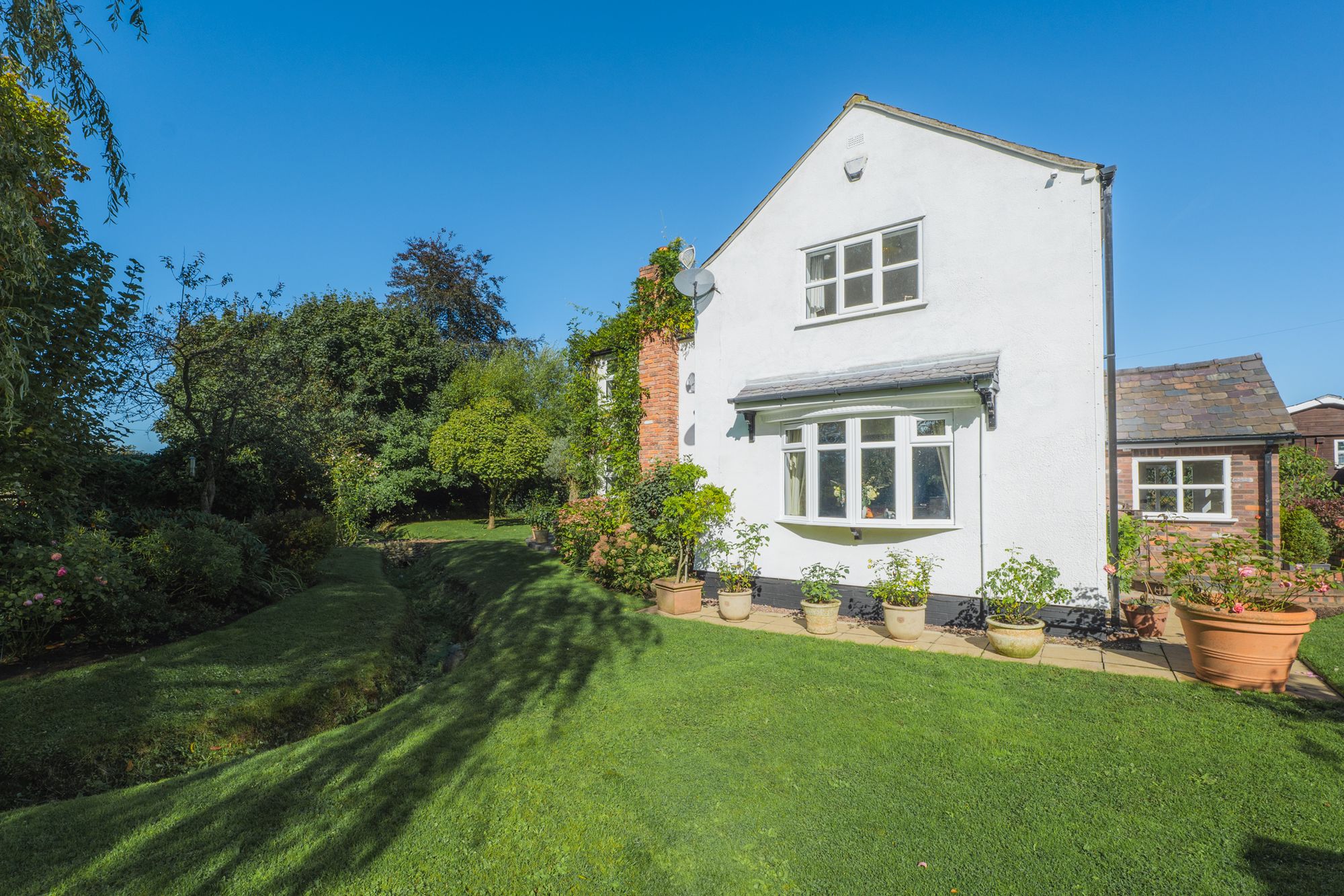 Relax and recline with a refreshing drink, listening to the wildlife; scampering squirrels and vocal songbirds, including mistle thrushes, song thrushes and robins, who make their home in the established trees. A glorious stream runs, with the rainfall through the garden, crisscrossed by quaint bridges and walkways.