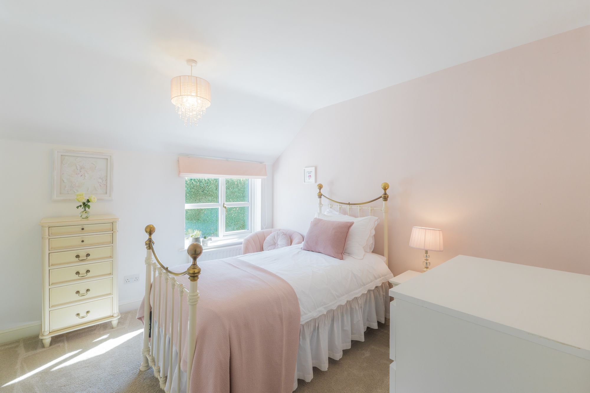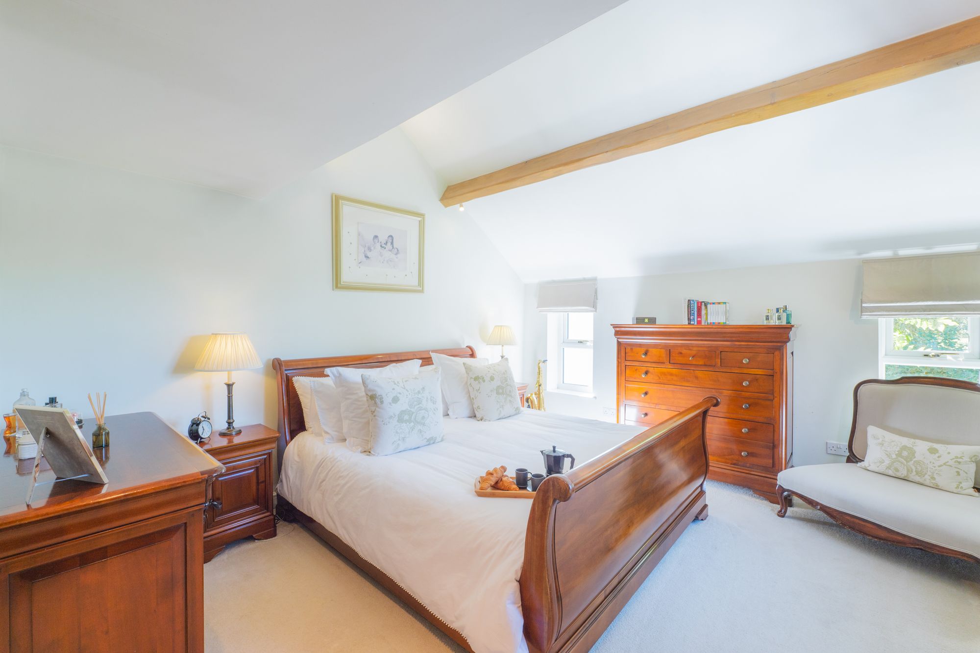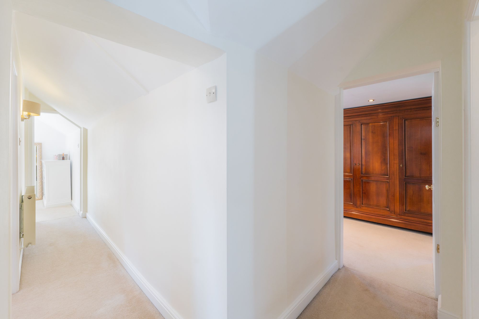 Tucked away at the end of the landing to the left, the high, sloping ceiling of the second double bedroom imbues the room with an airy lightness.