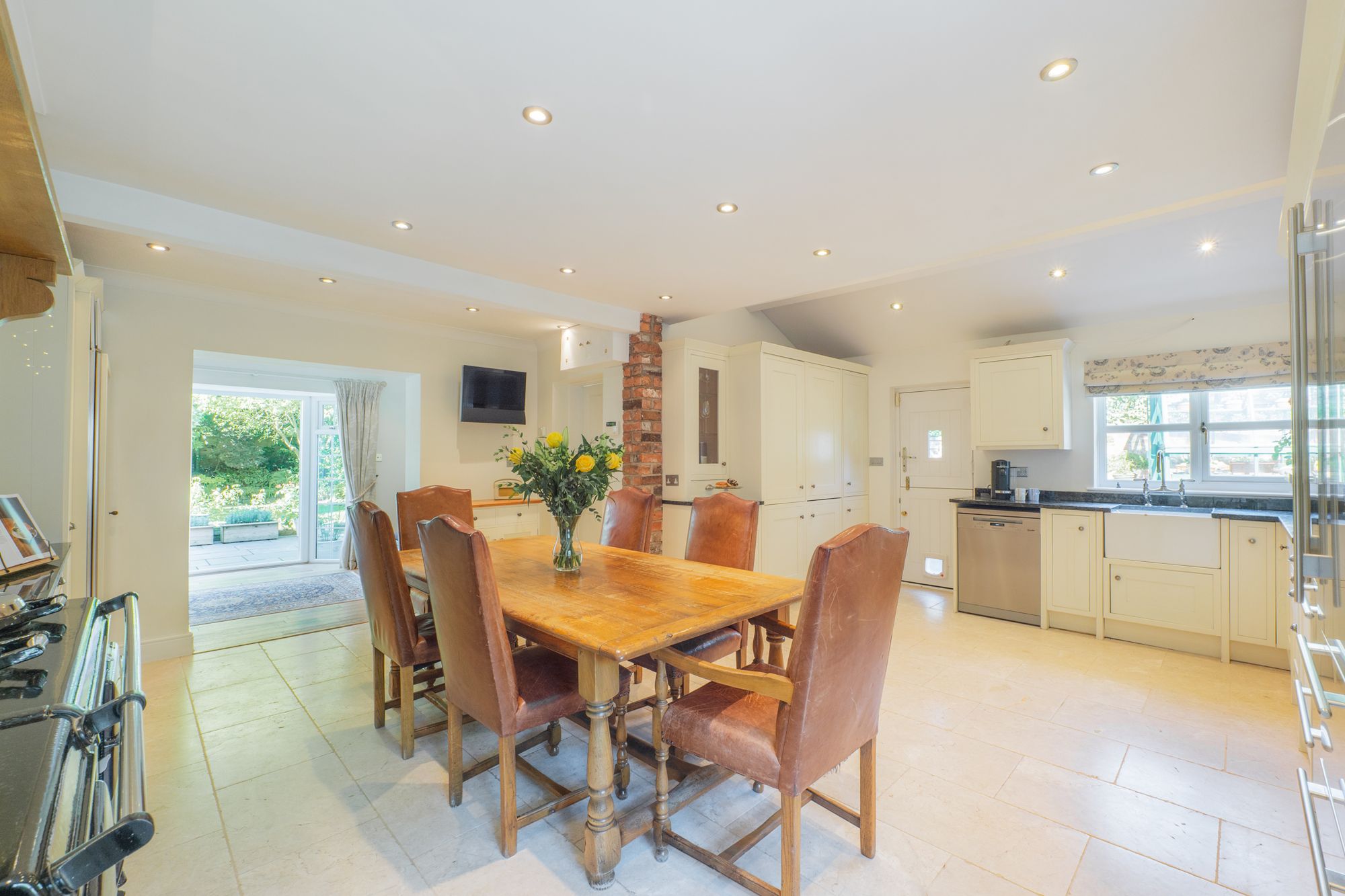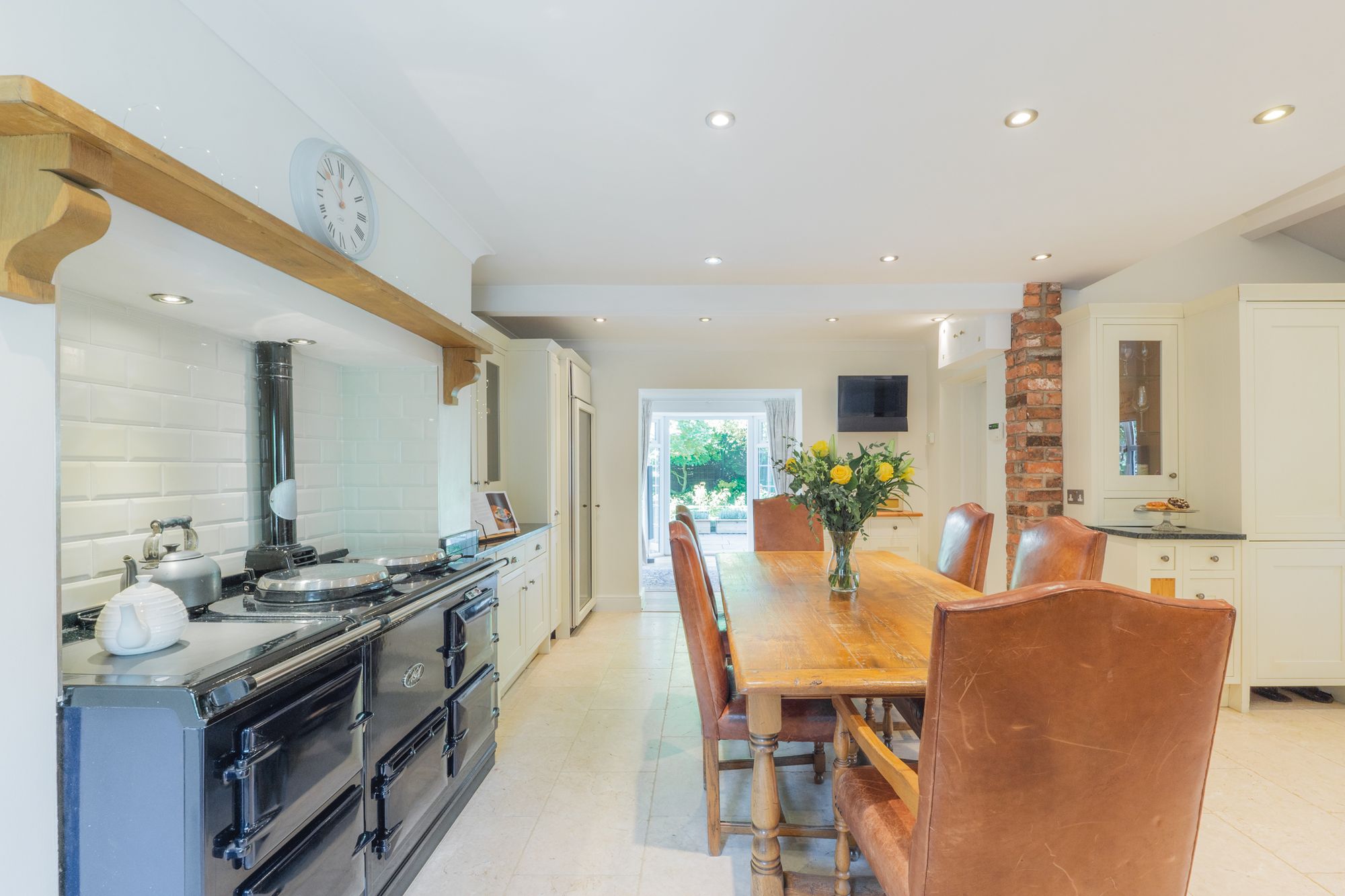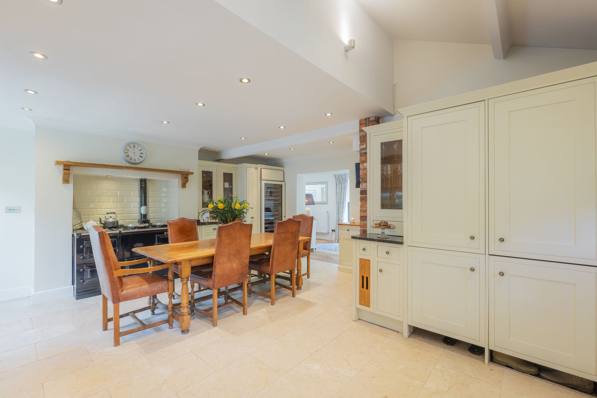 Cream granite tiles flow out underfoot, beneath the white ceiling, embellished by modern spotlighting. Exposed brickwork and a handsome, four-oven oil-fired Aga imbue the kitchen with cosy country warmth.