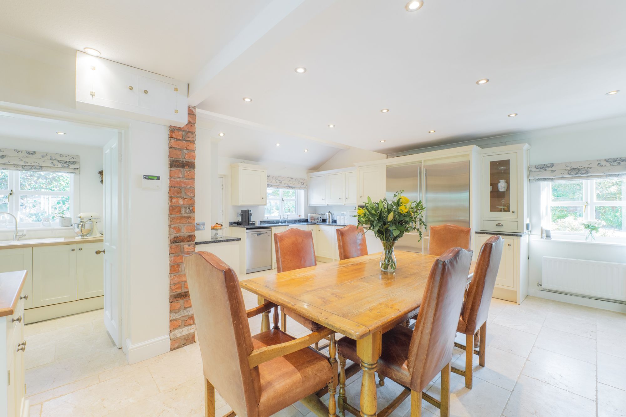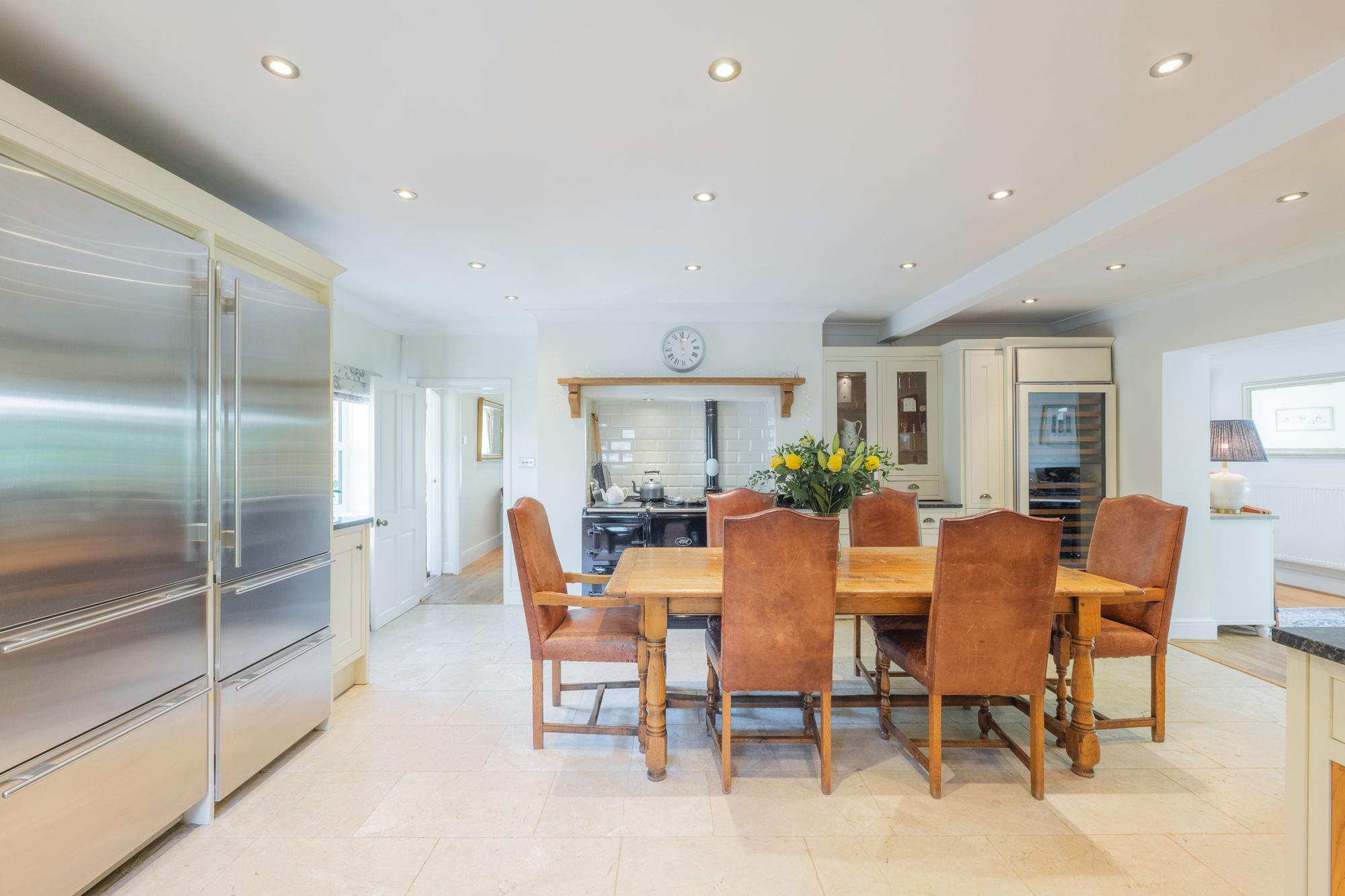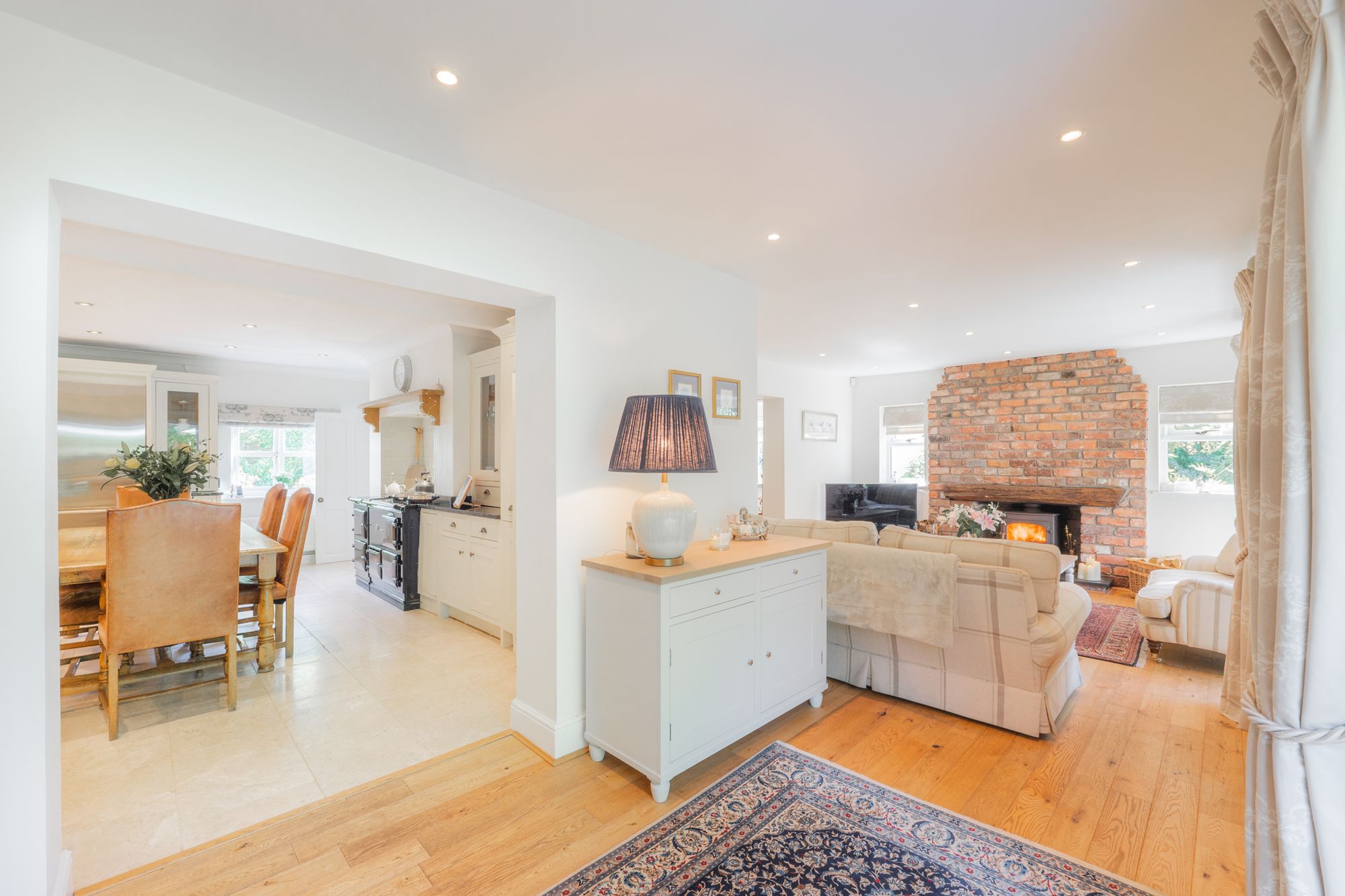 Cream granite tiles flow out underfoot, beneath the white ceiling, embellished by modern spotlighting. Exposed brickwork and a handsome, four-oven oil-fired Aga imbue the kitchen with cosy country warmth.