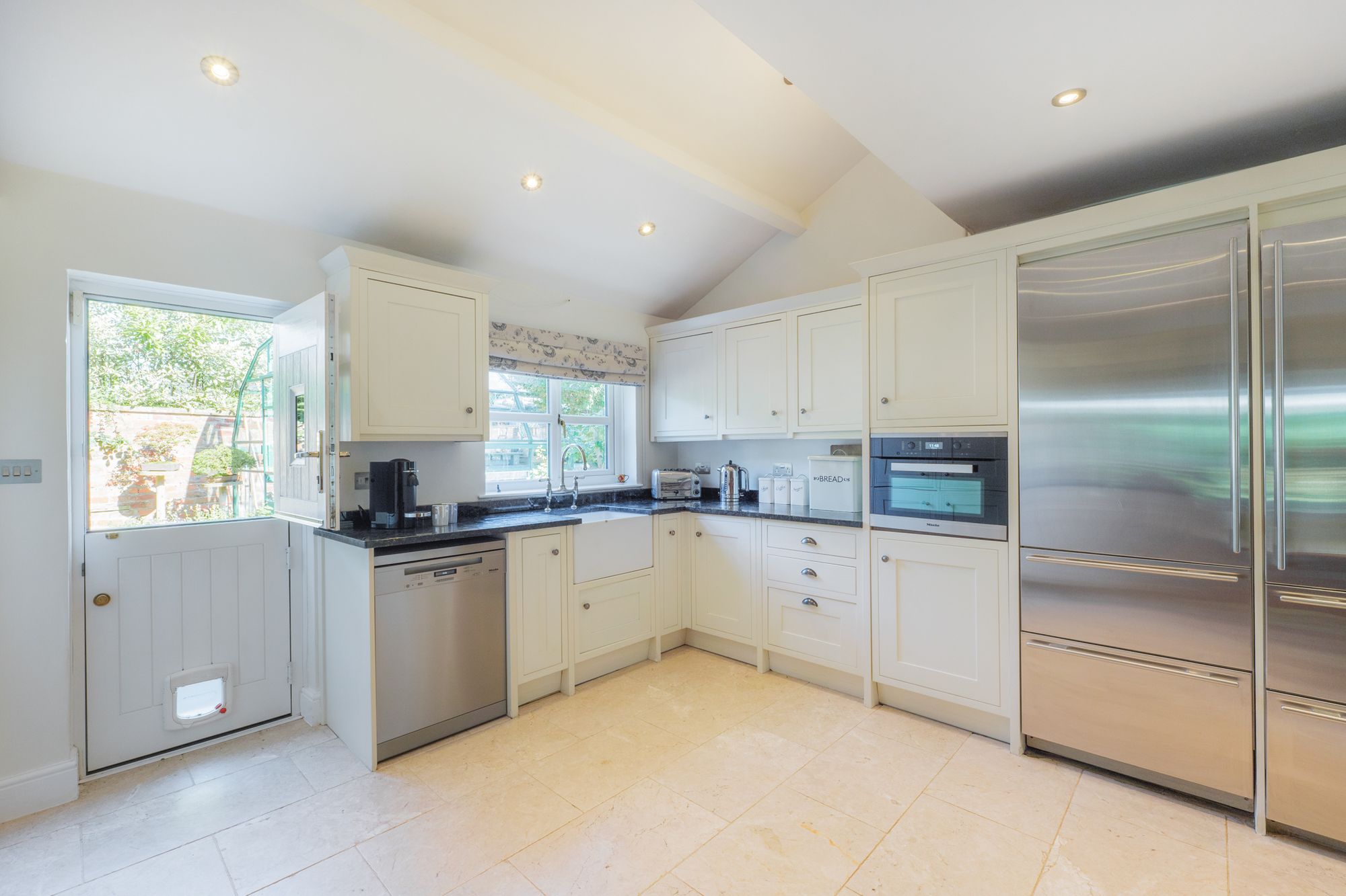 Balancing the charm with functionality, granite worktops in midnight blue provide plenty of preparation space, whilst a range of Miele appliances including dishwasher, microwave with convection fan oven and impressive SubZero fridge freezers and full height wine fridge serve your every need.