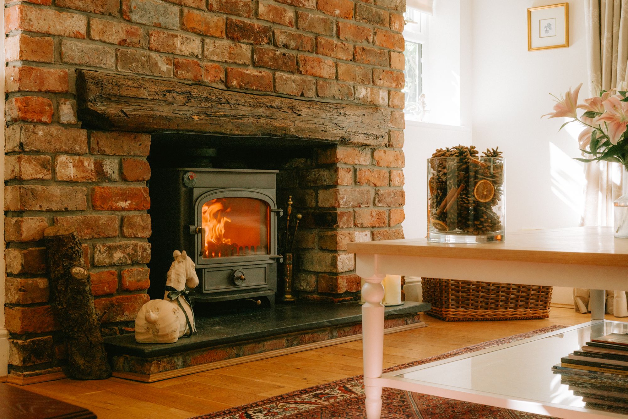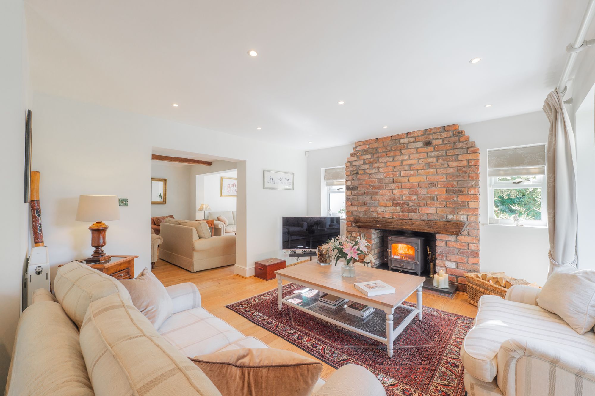 The heart of the home, gather around the breakfast table, or flow through into the sitting room that opens up beyond. Warmth emanates from the Clearview log-burning stove, handsomely positioned within a Cheshire brick chimney breast, as light streams in through windows to either side.