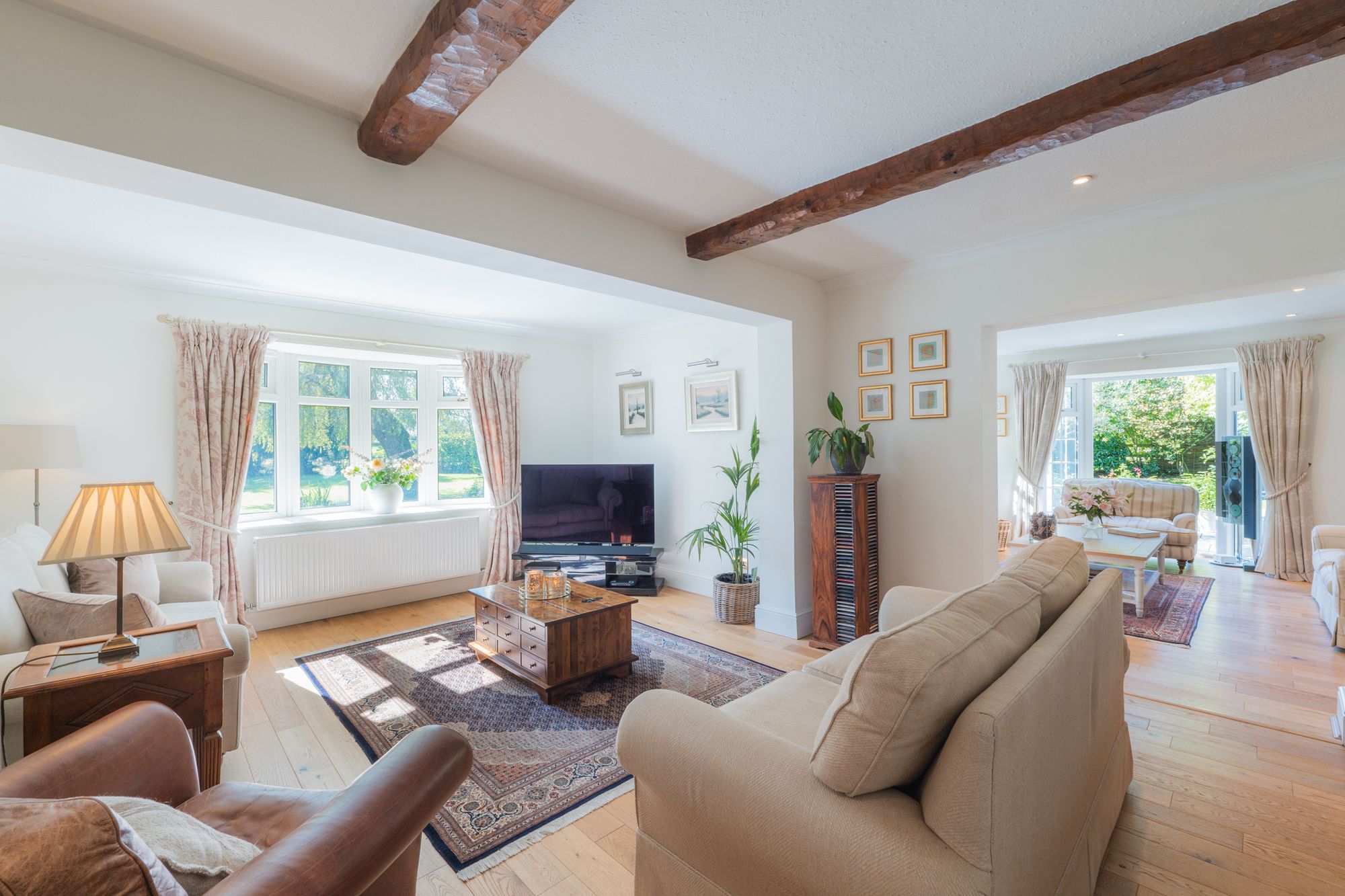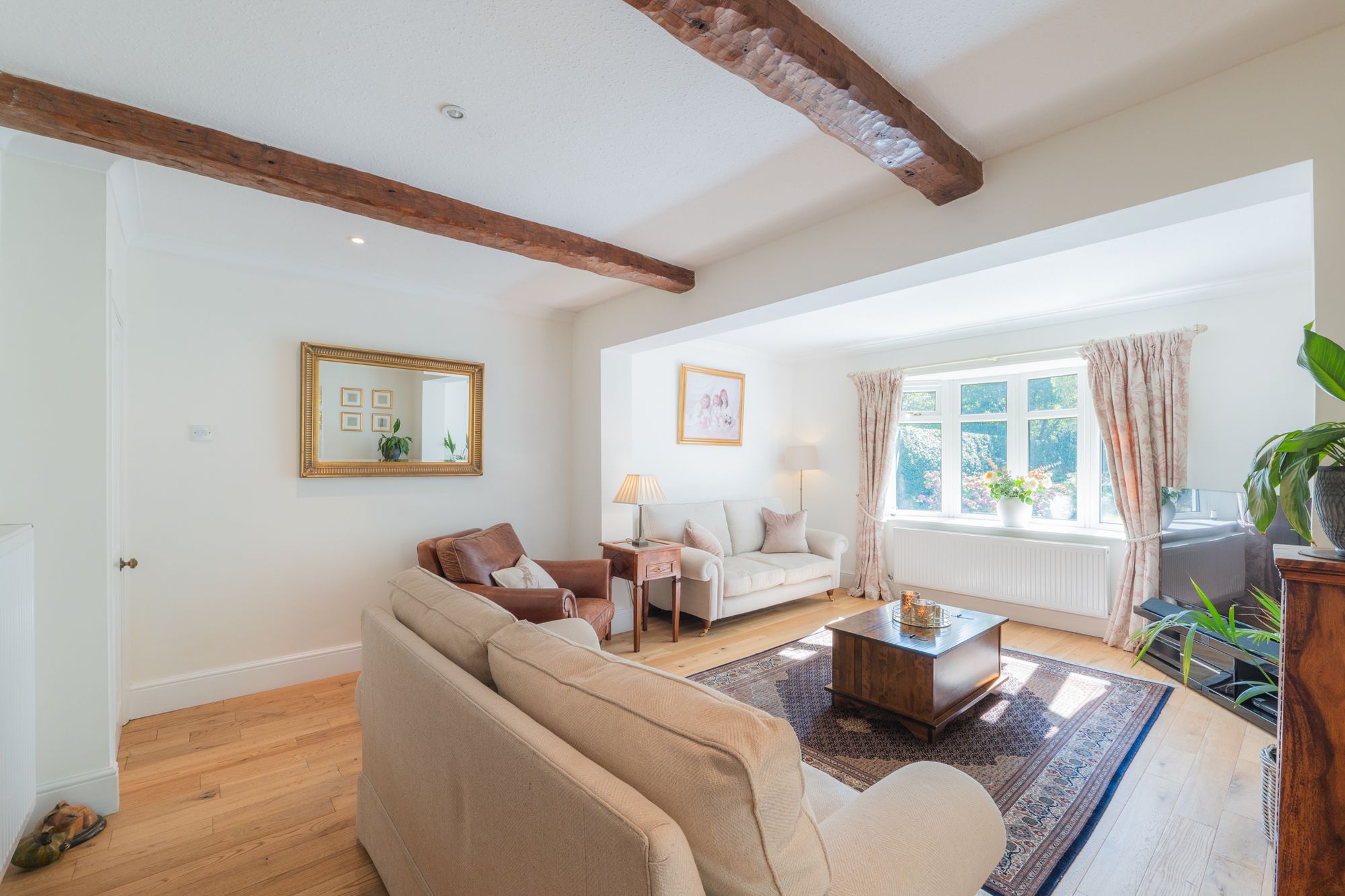 From the sitting room, connect through into the large lounge, spacious and serene, with fresh white walls and exposed treacle-toned beams above. With plenty of space for a Christmas tree during the festive season, gather and exchange gifts on Christmas morning, with leafy views out through the window. An alcove beneath the staircase is a quiet place for a desk and chair, with shelving above for those working from home.