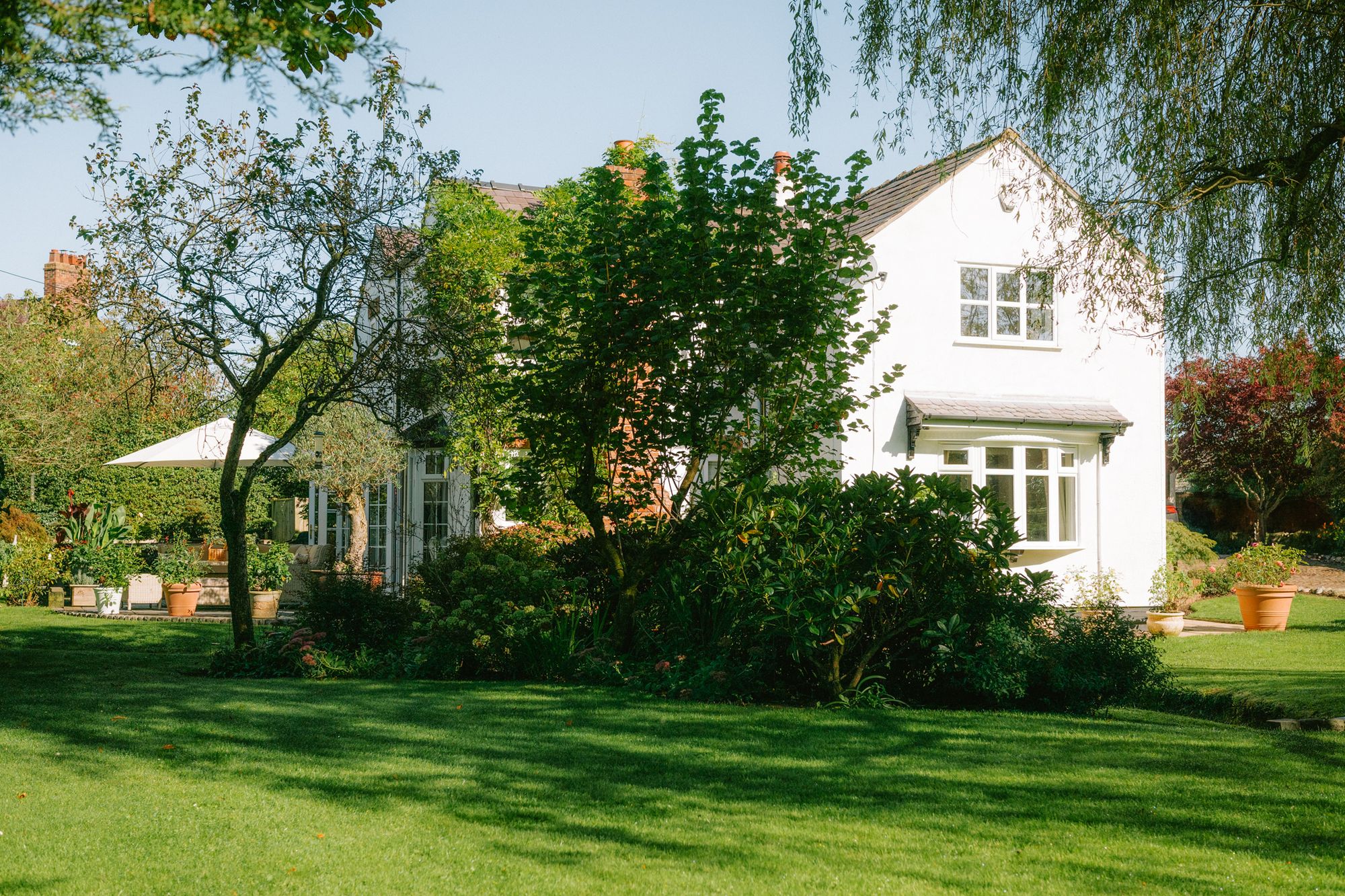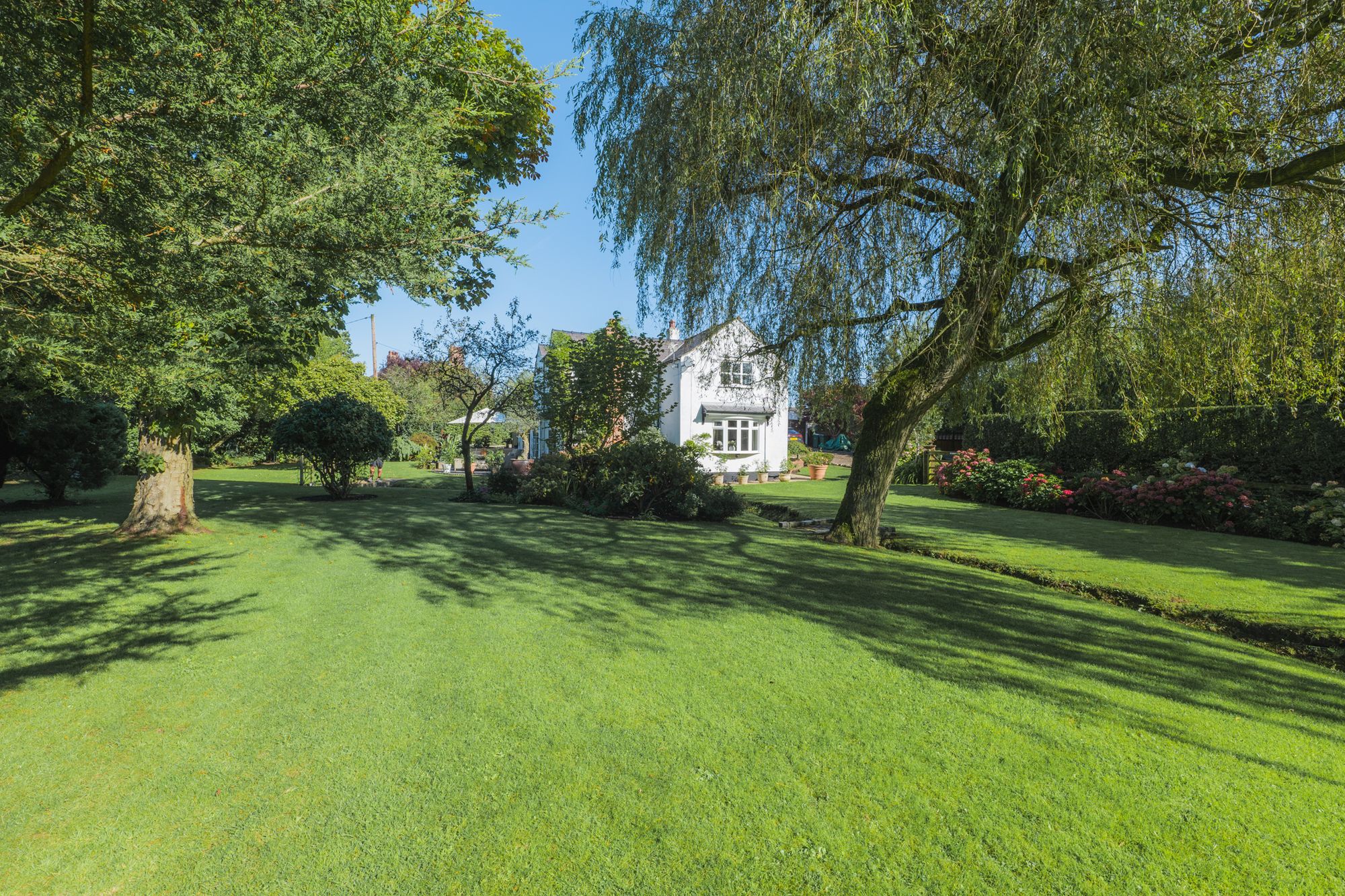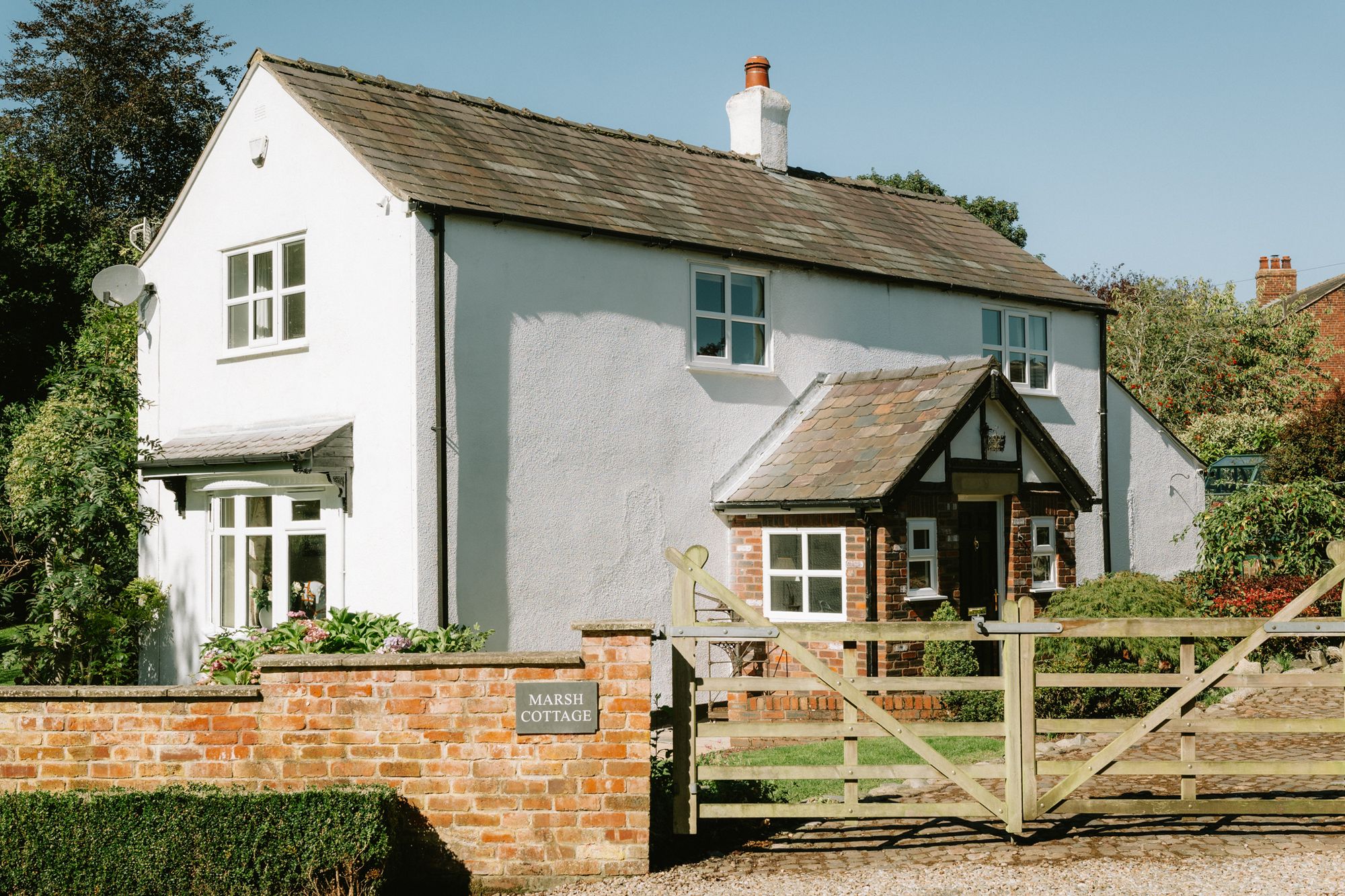 Soft green lawn, meticulously edged, surrounds Marsh Cottage, with mature borders bursting with year-round colour.