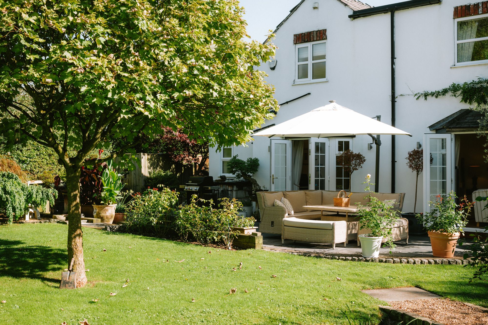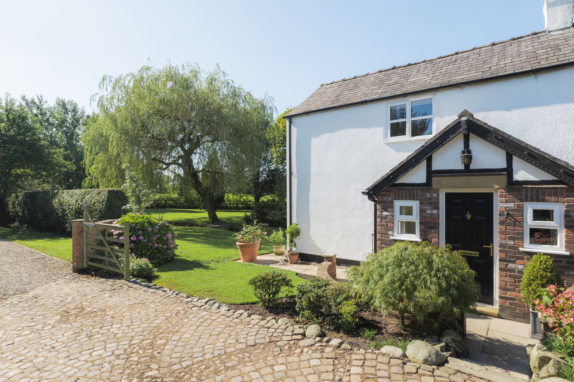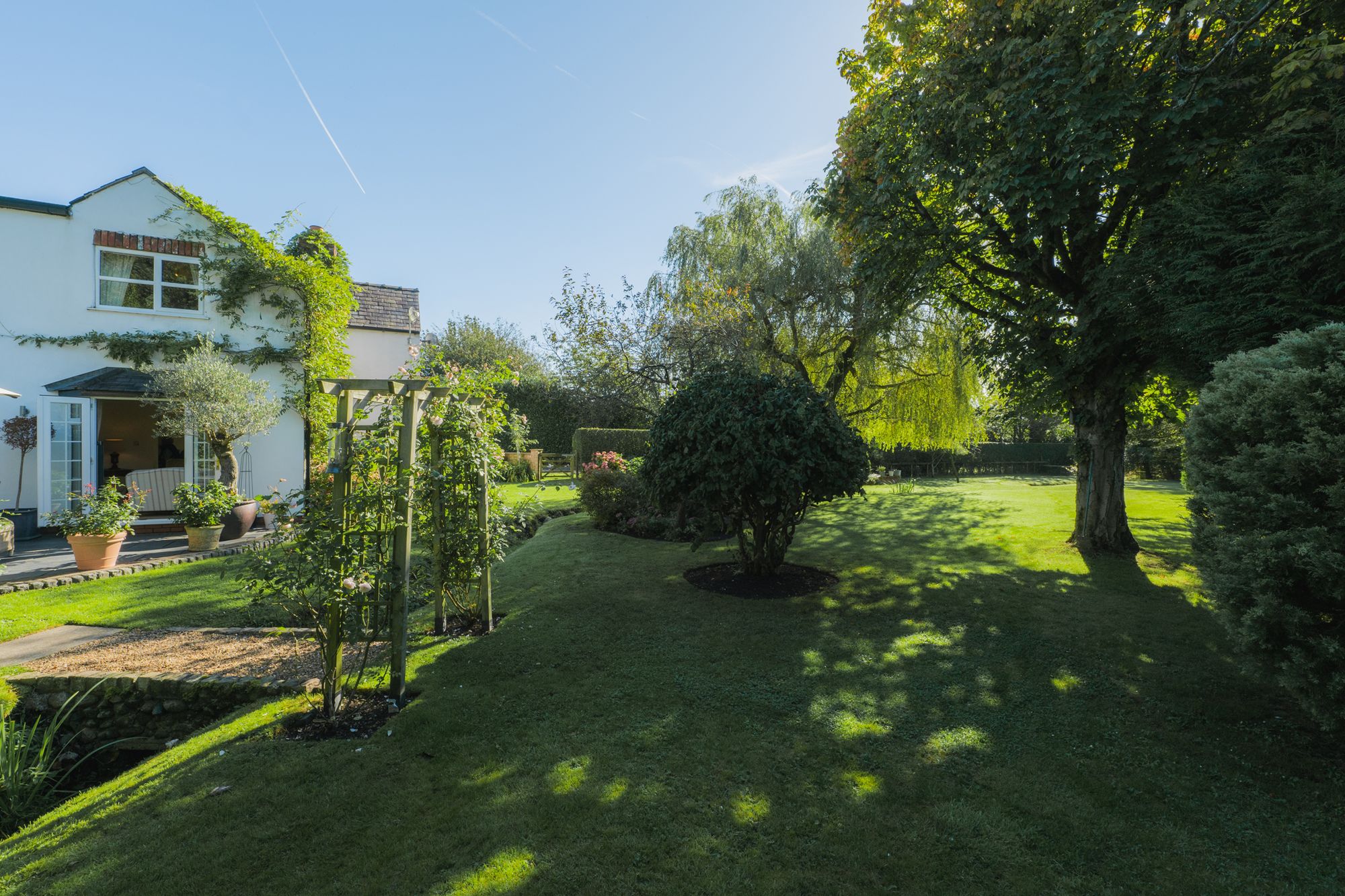 Soft green lawn, meticulously edged, surrounds Marsh Cottage, with mature borders bursting with year-round colour.