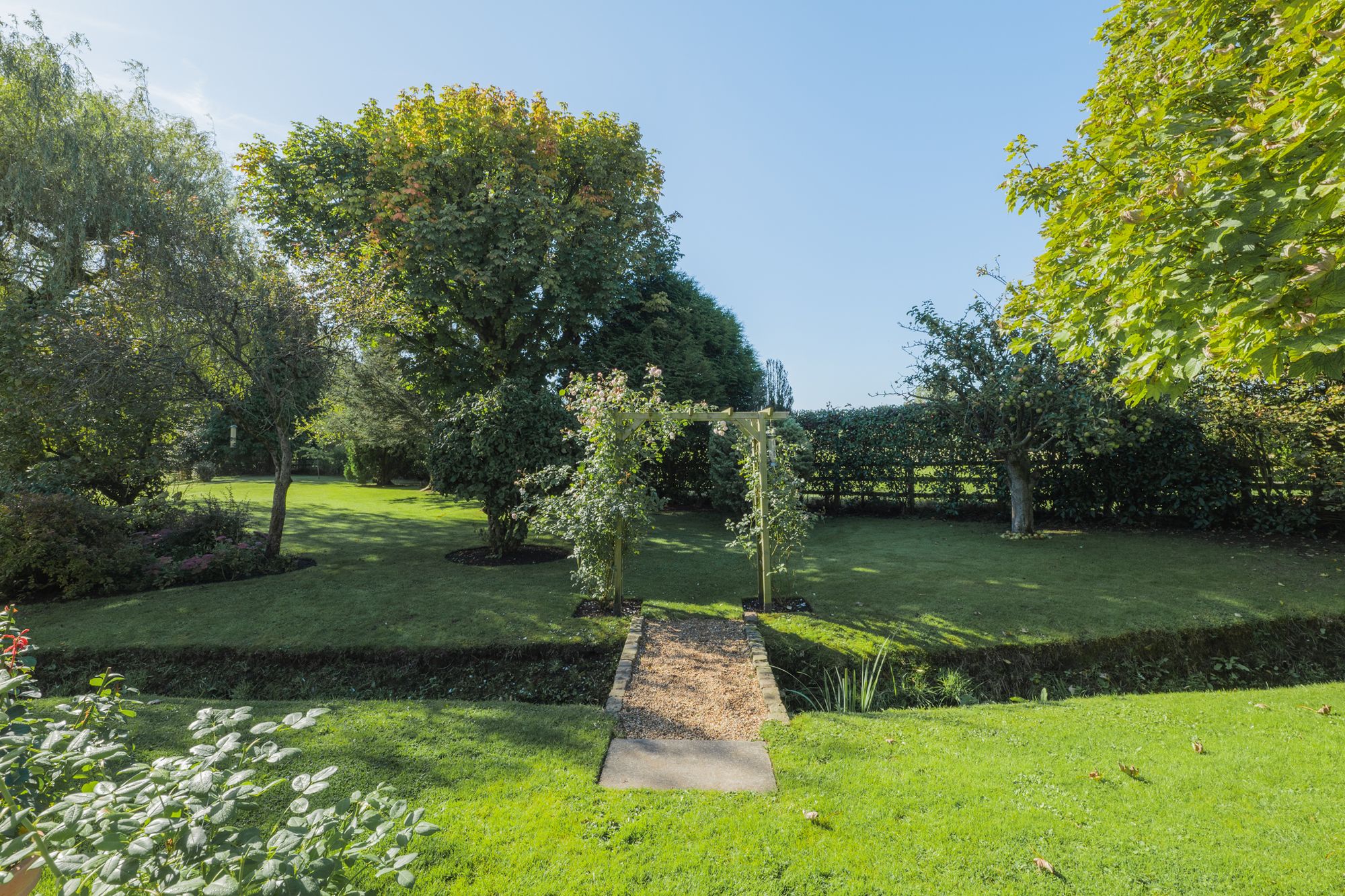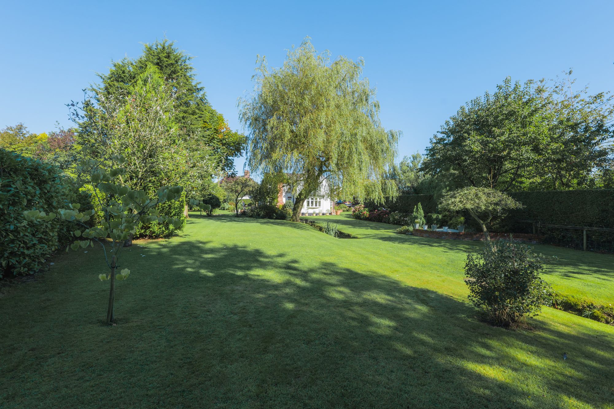 Peaceful and private, the varied gardens provide all season interest, bathed in sunlight as it rises to the front, making its way around to the rear and settling on the patio from lunchtime, where it remains in full sun until around 7pm. In the spring, the magnificent wisteria erupts in purple fragrant blossom to the rear of the home, whilst the garden is carpeted in a show of spring colour including snowdrops, bluebells, daffodils bluebells and more.