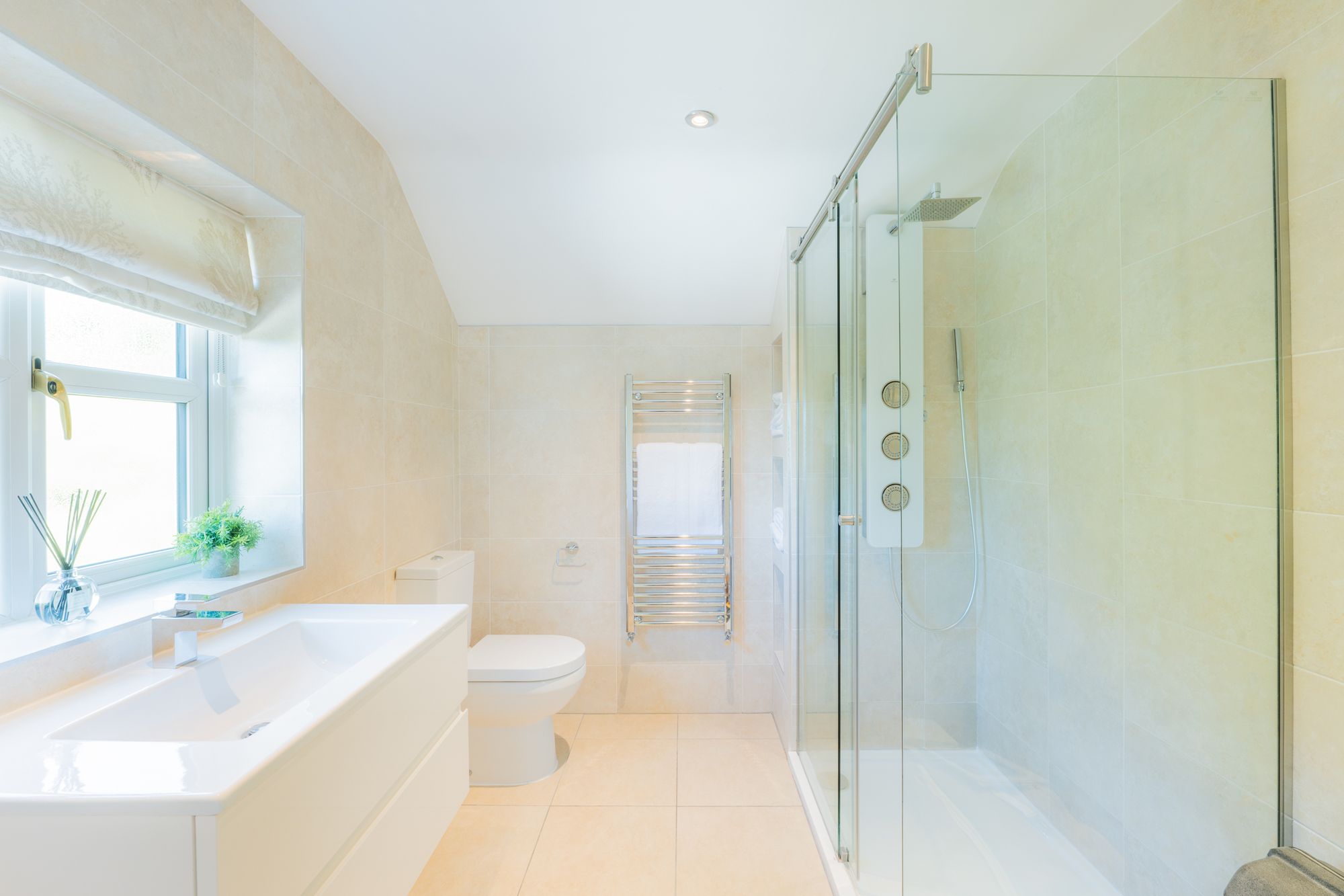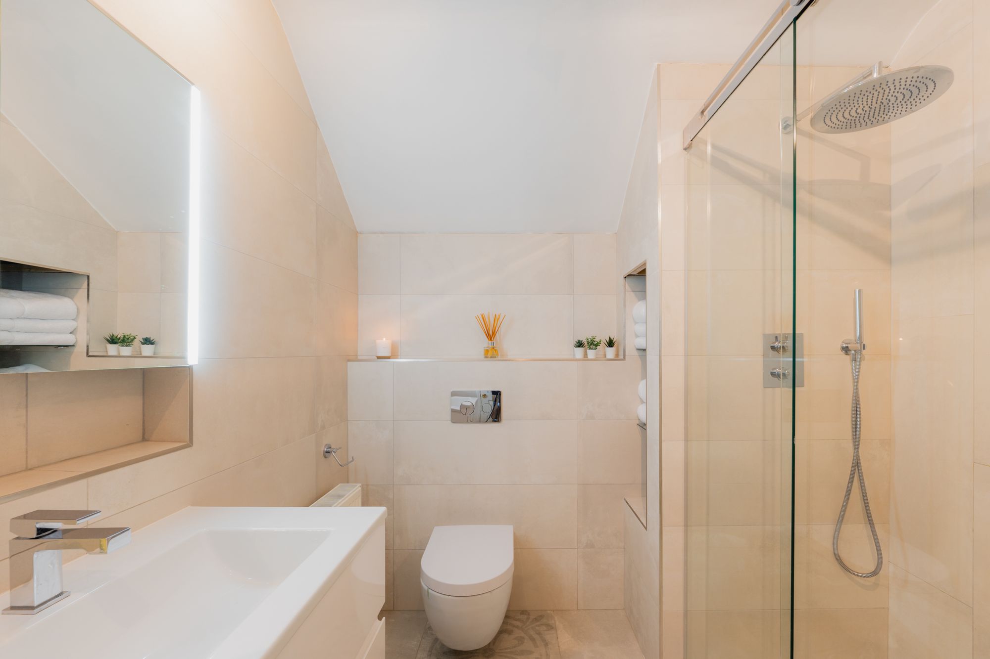 Refresh and revive in the family bathroom, furnished by Porcelanosa, and tiled underfoot and to the walls. Plenty of storage can be found in the two-drawer vanity unit wash basin, with LED, demisting mirror above. The bathroom is also furnished with WC, heated chrome towel radiator, alcove shelving and a large, walk-in shower with drench head.