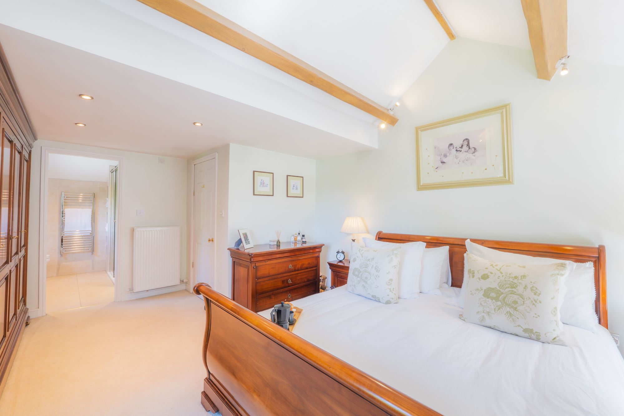 Spacious and serene, the master bedroom completes the complement of soothing and soporific bedrooms at Marsh Cottage, overlooking the garden to two sides and with double height, vaulted ceiling for a calm, relaxing ambience. Pause in the window seats and admire the leafy views.