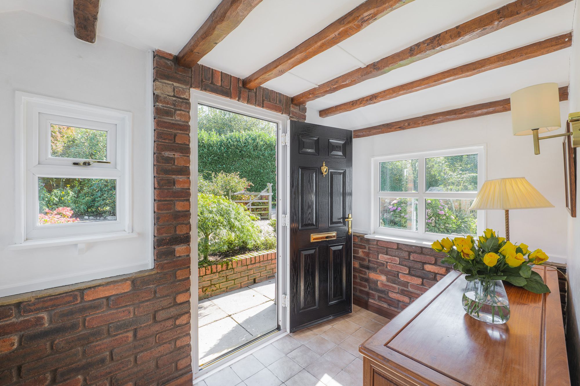 Step inside, into the warmth and shelter of the entrance porch, tiled underfoot and with beams in situ overhead. With space to doff and don coats and shoes, continue through onto the oak flooring of the entrance hall, where there is access through into the kitchen on the right.