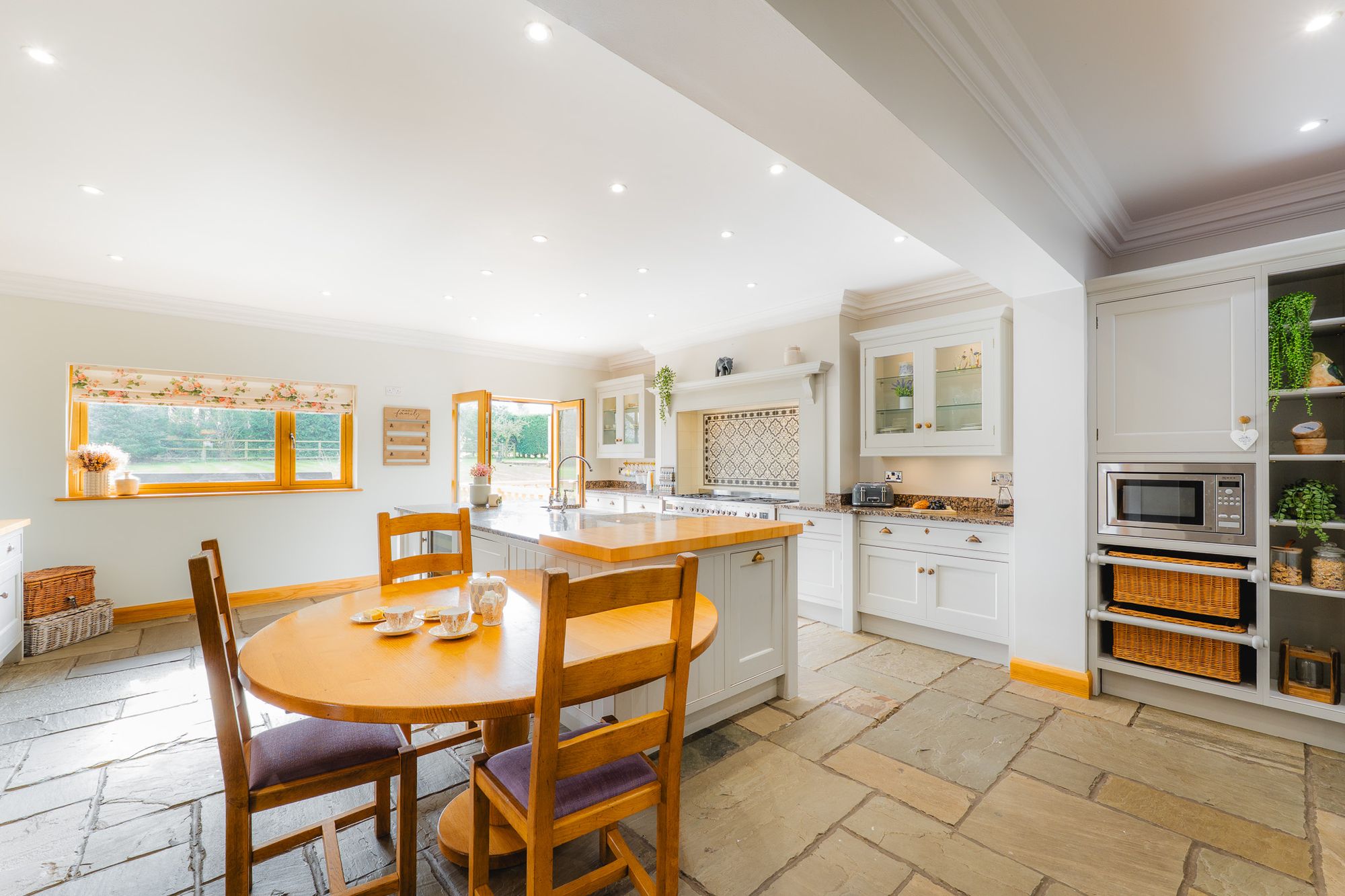 Serenaded with light, the bespoke David Lisle kitchen awaits to the rear, a sociable kitchen-dining-family room, where a large oak and marble topped island serves as a sociable hub. Grey, Shaker-style solid-wood crafted cabinetry, installed by the luxury Macclesfield kitchen-maker captures the 1930s essence of the home, whilst inset spotlighting provides contemporary illumination, alongside undercabinet lighting. Windows and French doors draw the outside in, providing light-filled vistas out over the garden.